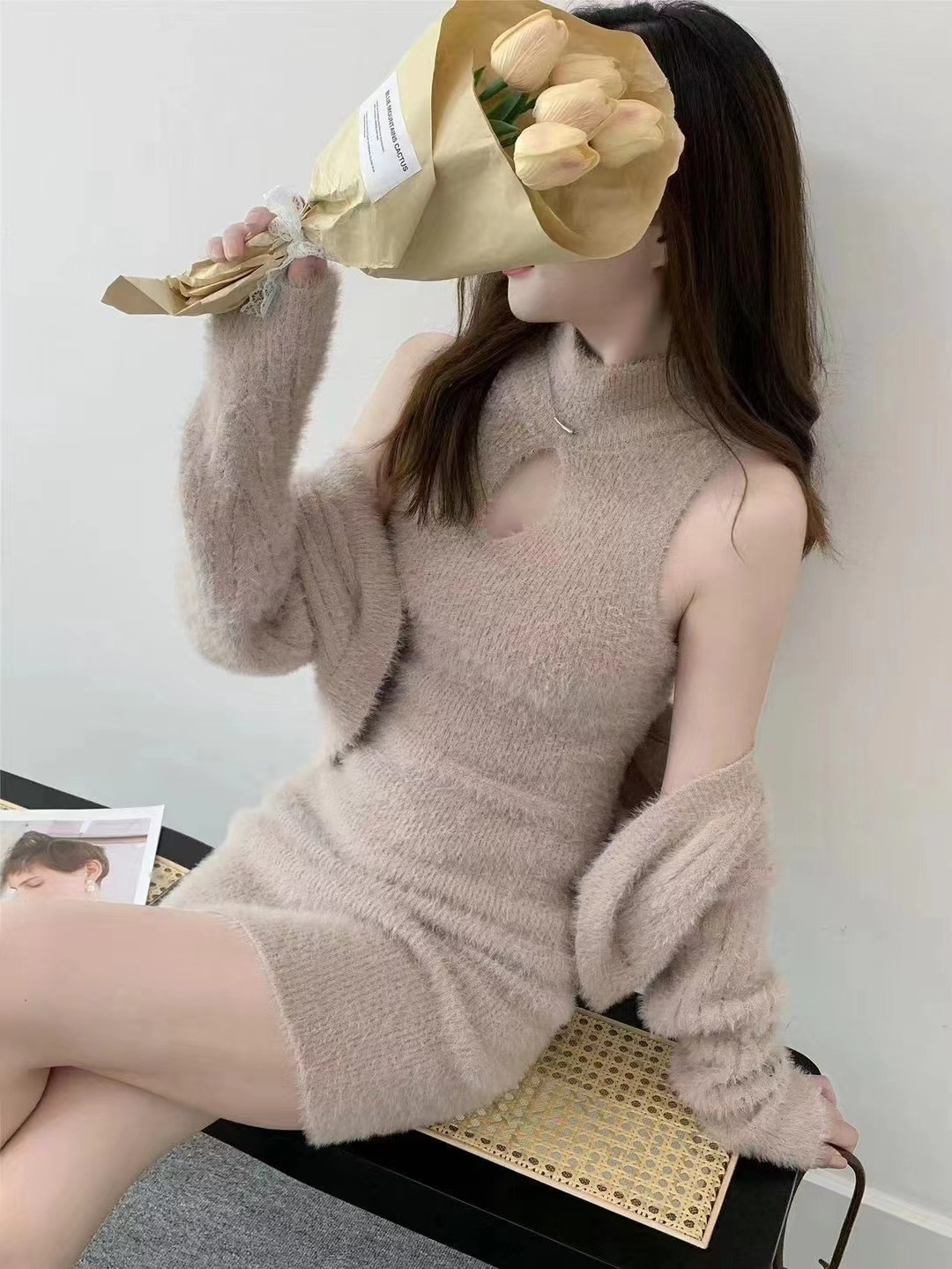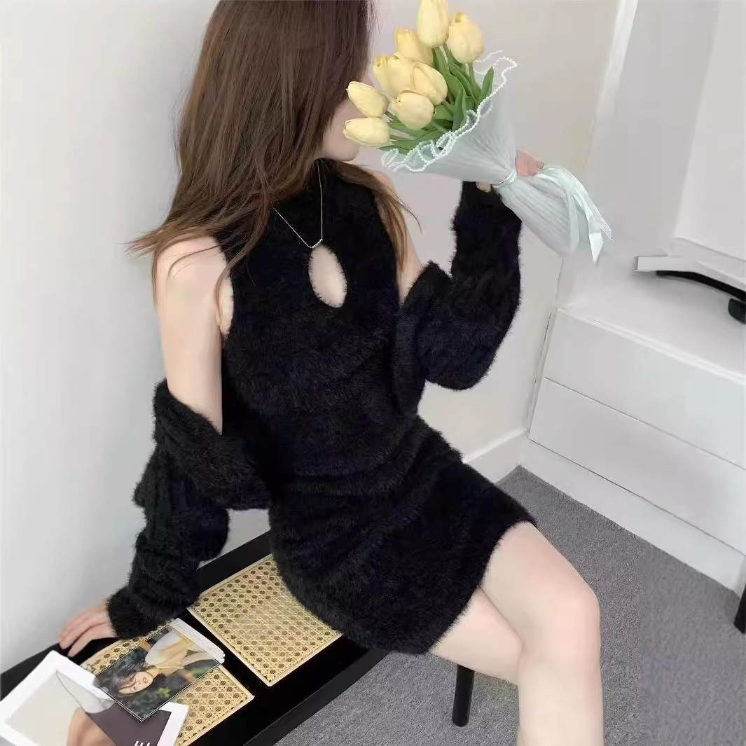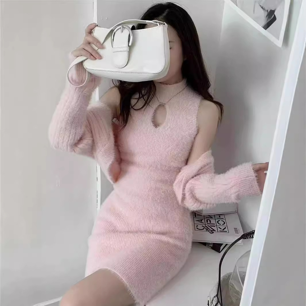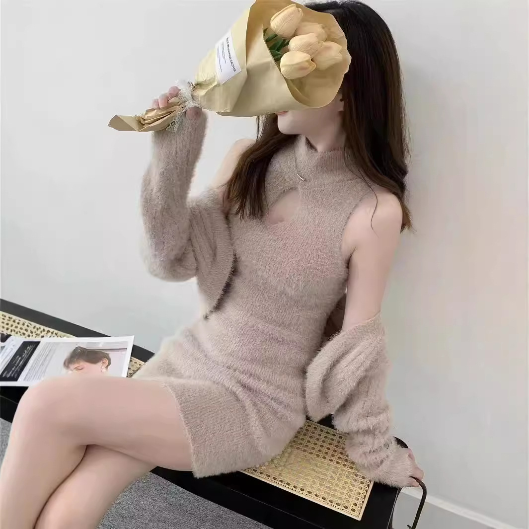 부드러운 플러시 니트웨어 투피스 세트, 여성스러운 스타일의 홀터넥 슬림핏 힙커버 원피스+자켓스토어 가기