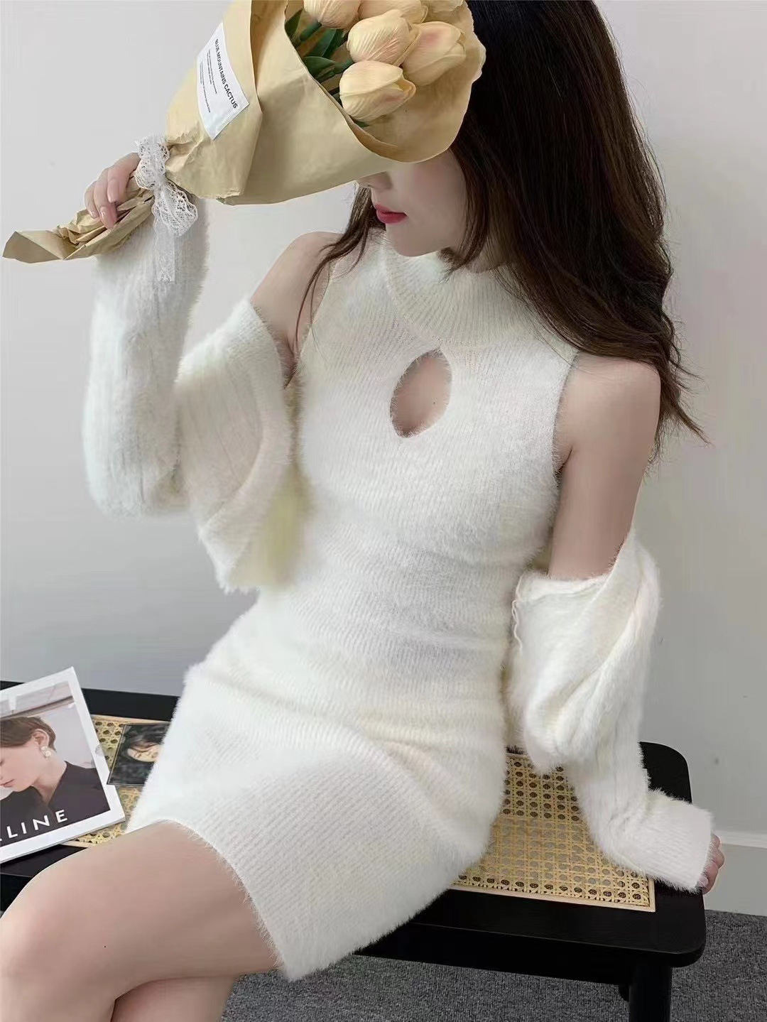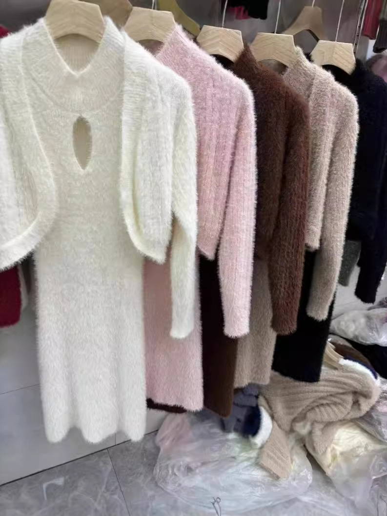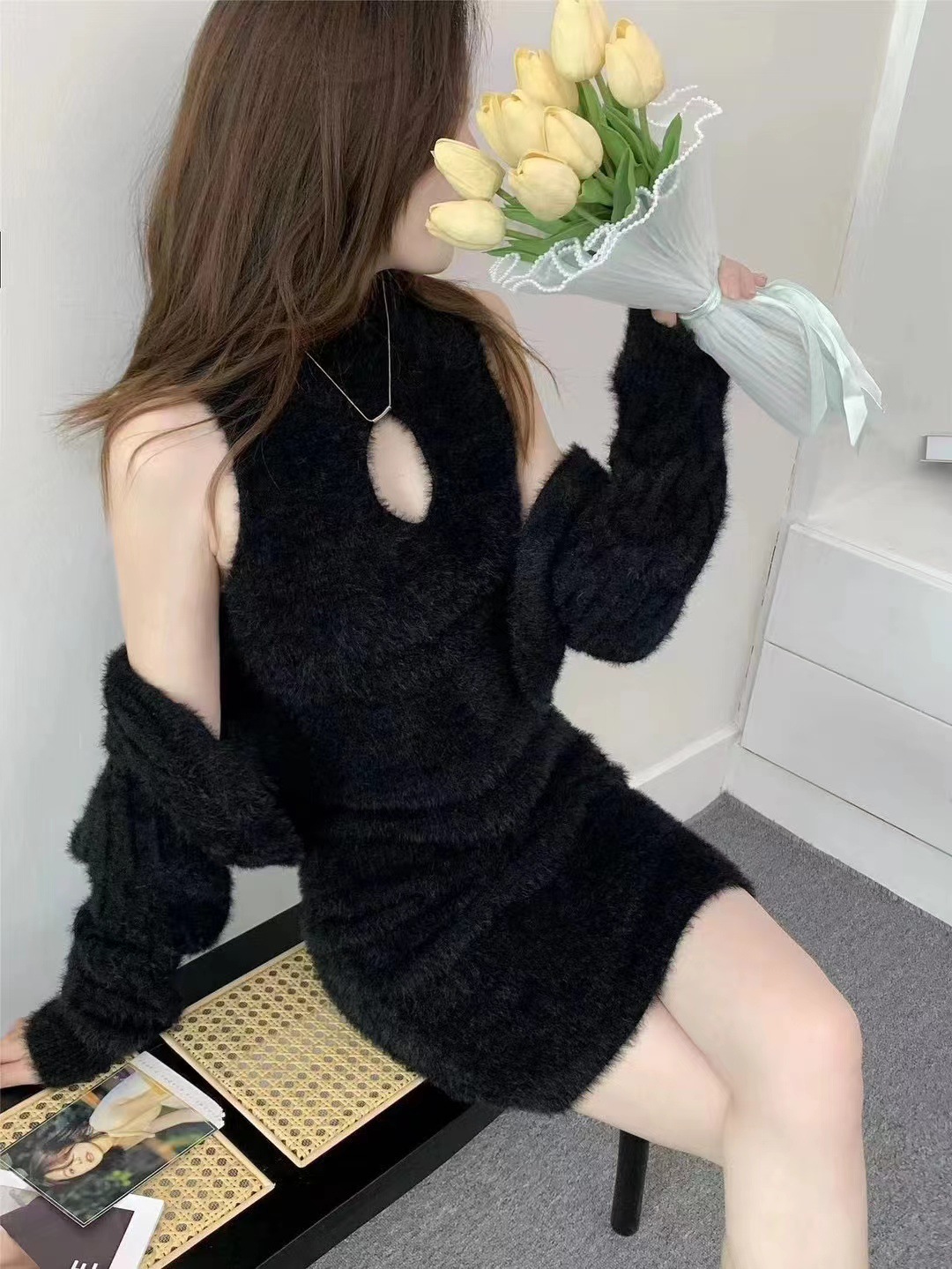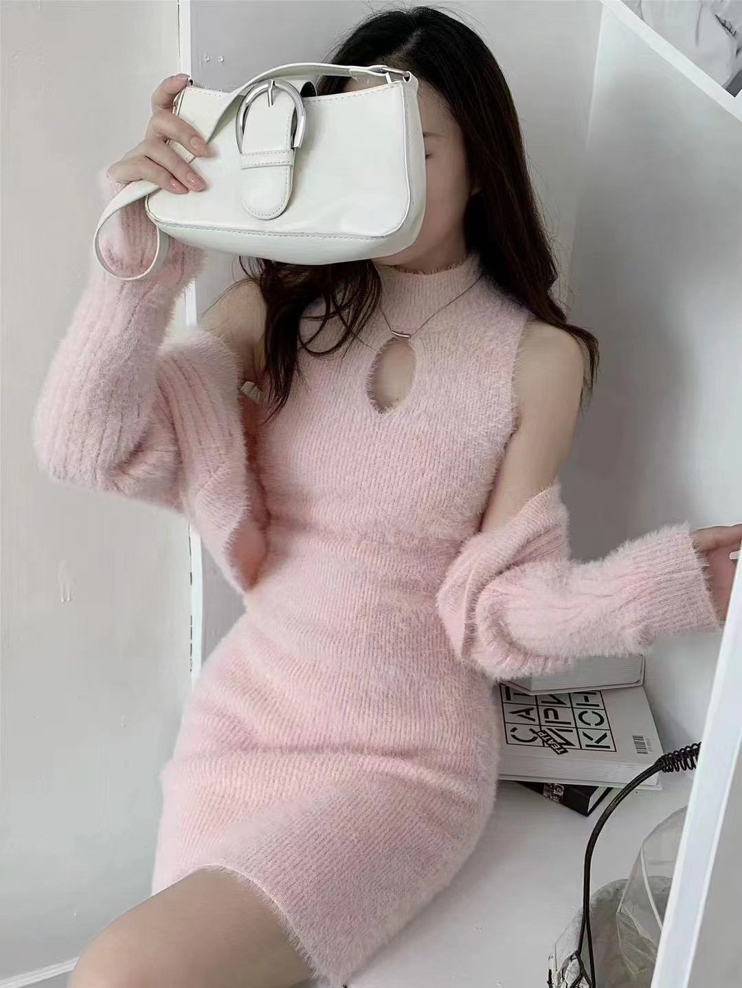 부드러운 플러시 니트웨어 투피스 세트, 여성스러운 스타일의 홀터넥 슬림핏 힙커버 원피스+자켓스토어 가기