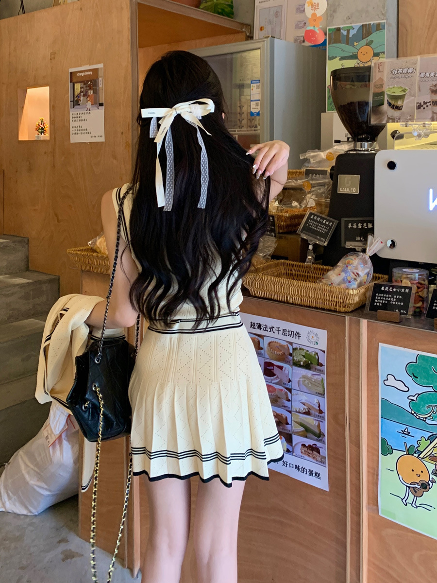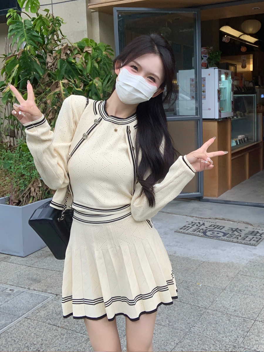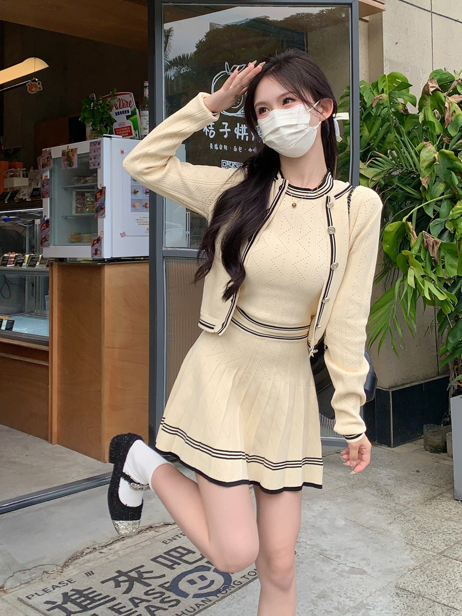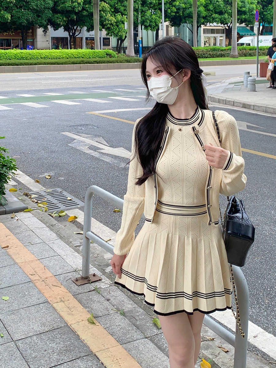 프랑스 아카데미 스타일 니트 세트 긴팔 카미 솔 카디건 최고 여성 가을 주름 치마 3 종 세트