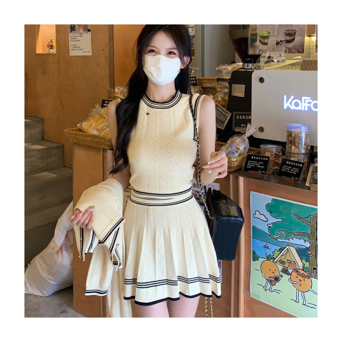 프랑스 아카데미 스타일 니트 세트 긴팔 카미 솔 카디건 최고 여성 가을 주름 치마 3 종 세트스토어 가기