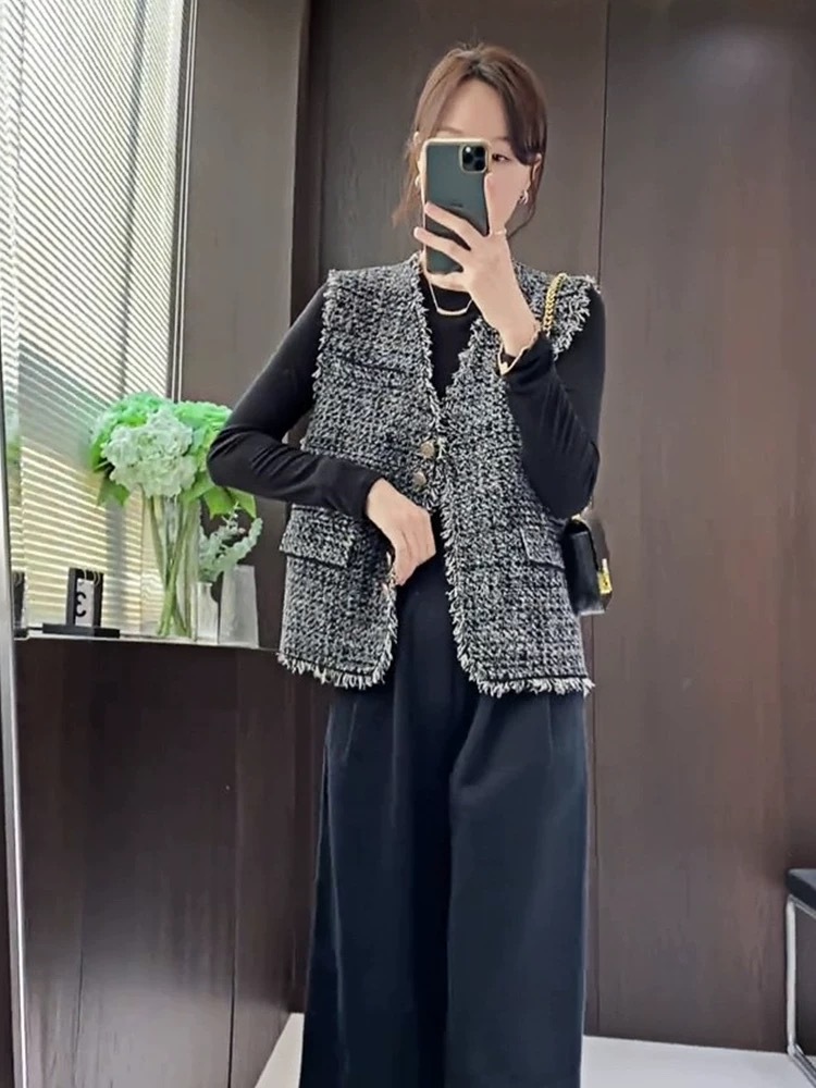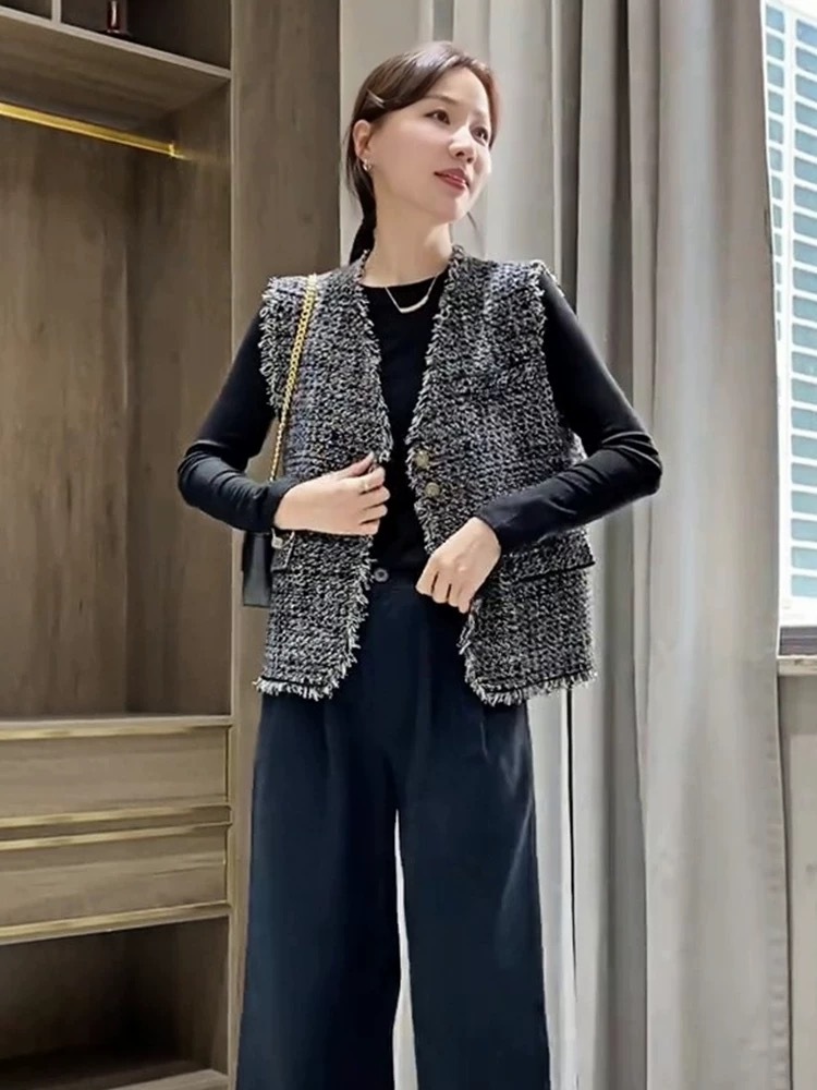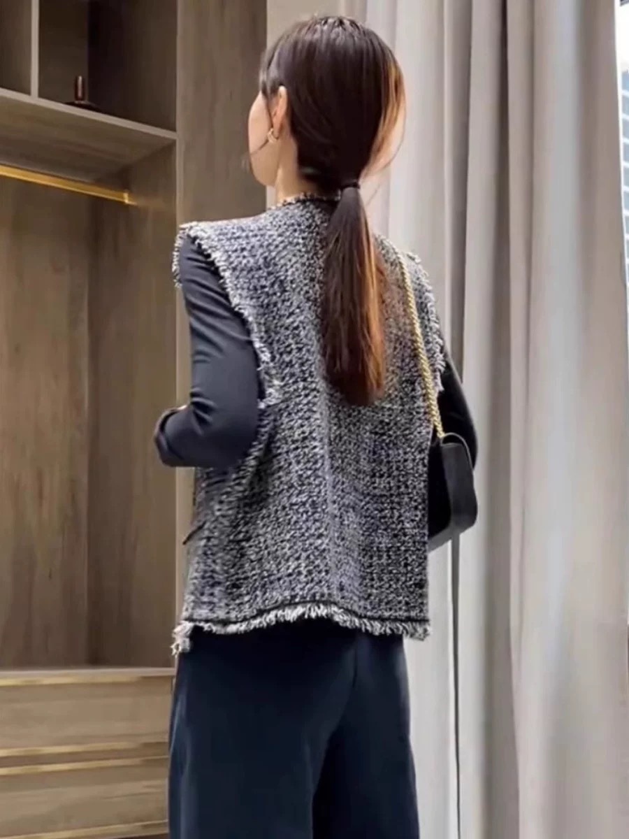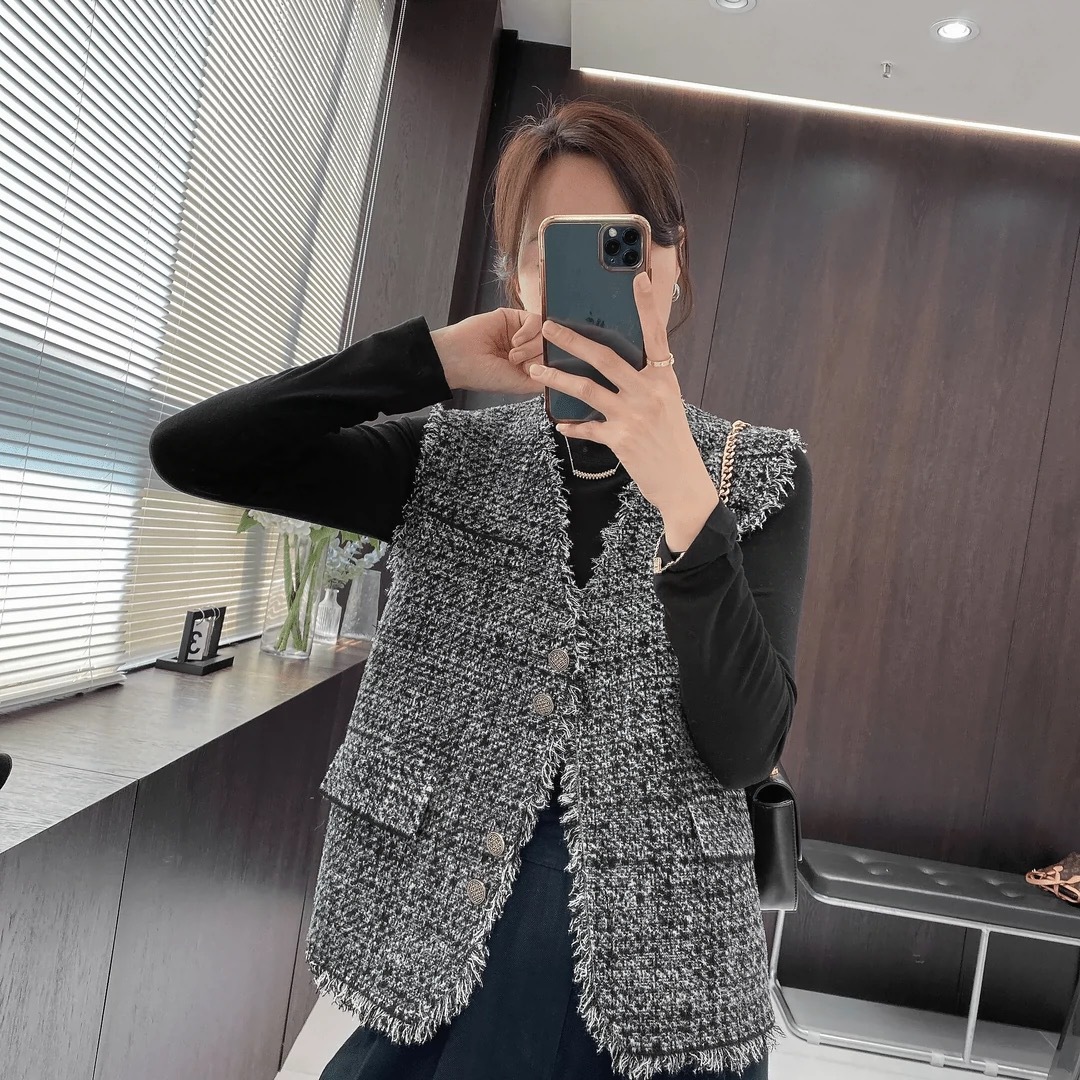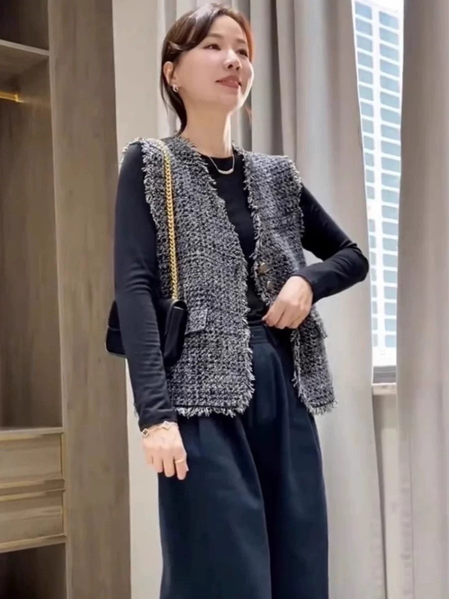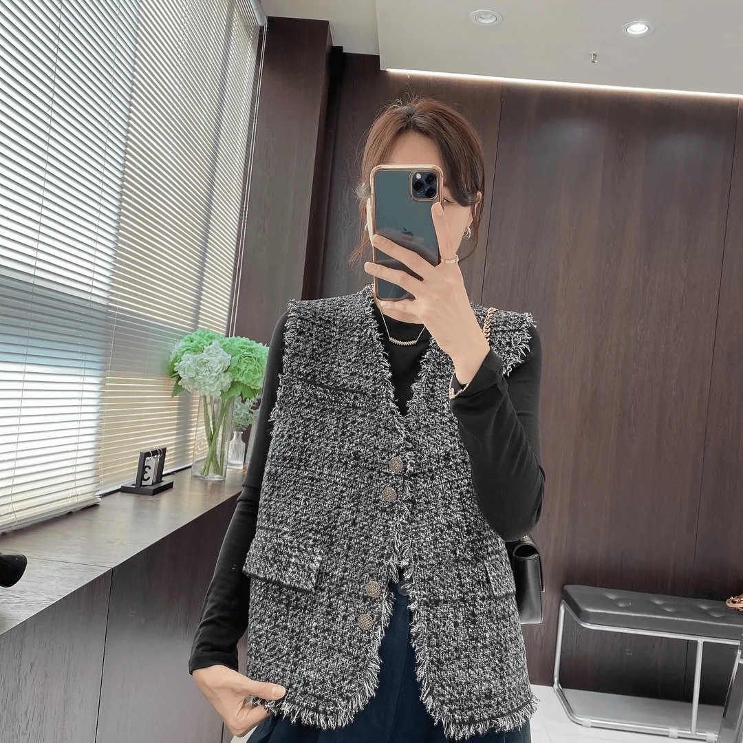 샤넬 스타일 술 짠 민소매 조끼 코트 여자 2024 가을 새로운 올 매치 레트로 웨스턴 스타일 웨어 탑스토어 가기