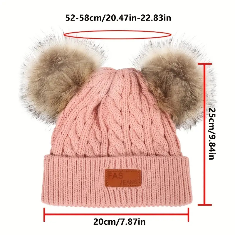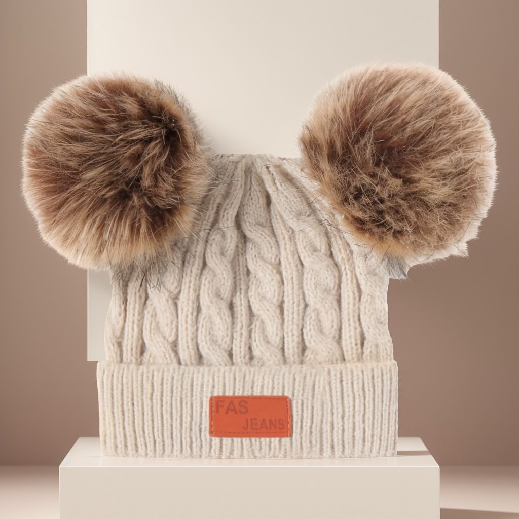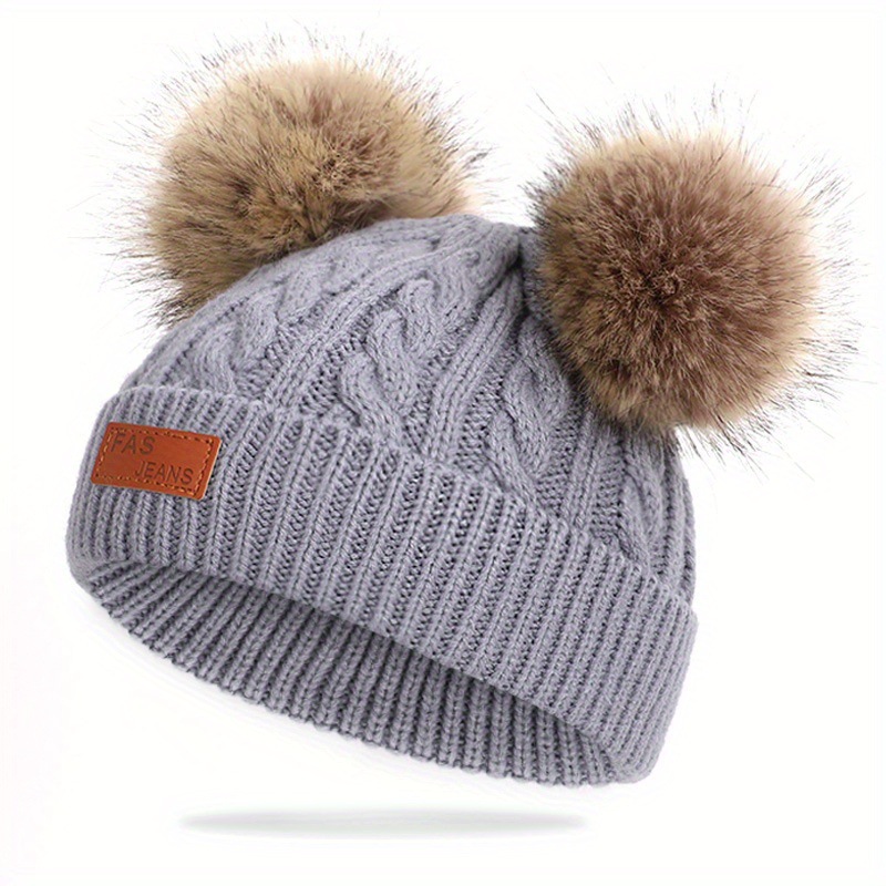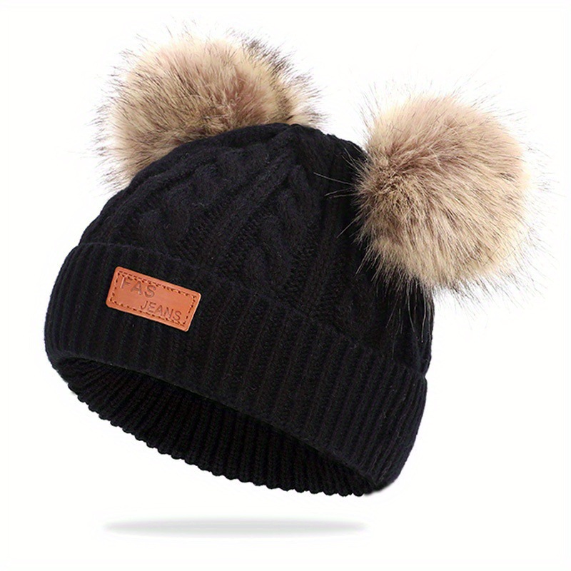 새로운 가을과 겨울 어린이 더블 볼 자카드 울 캡 제조 업체 재고 단색 가죽 라벨 트위스트 따뜻한 아기 모자