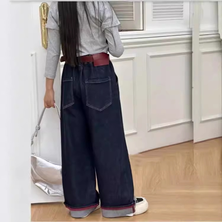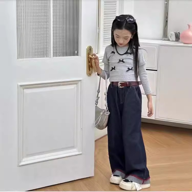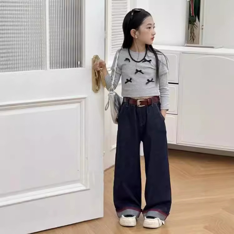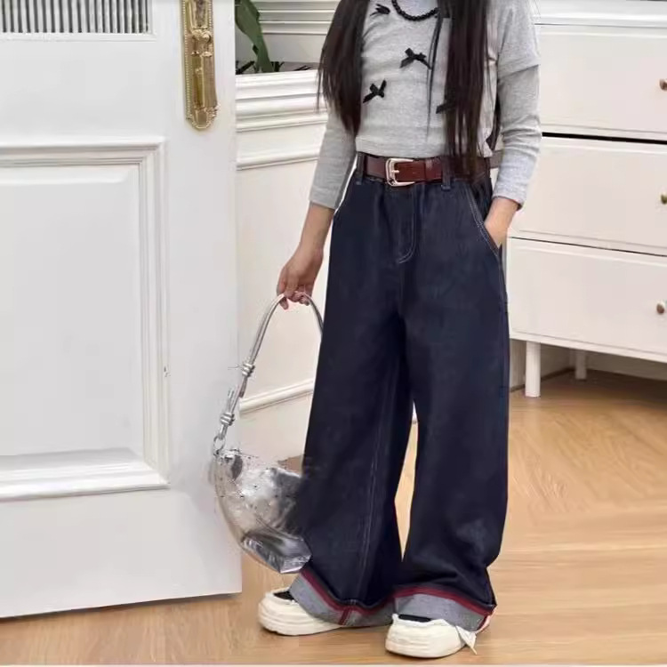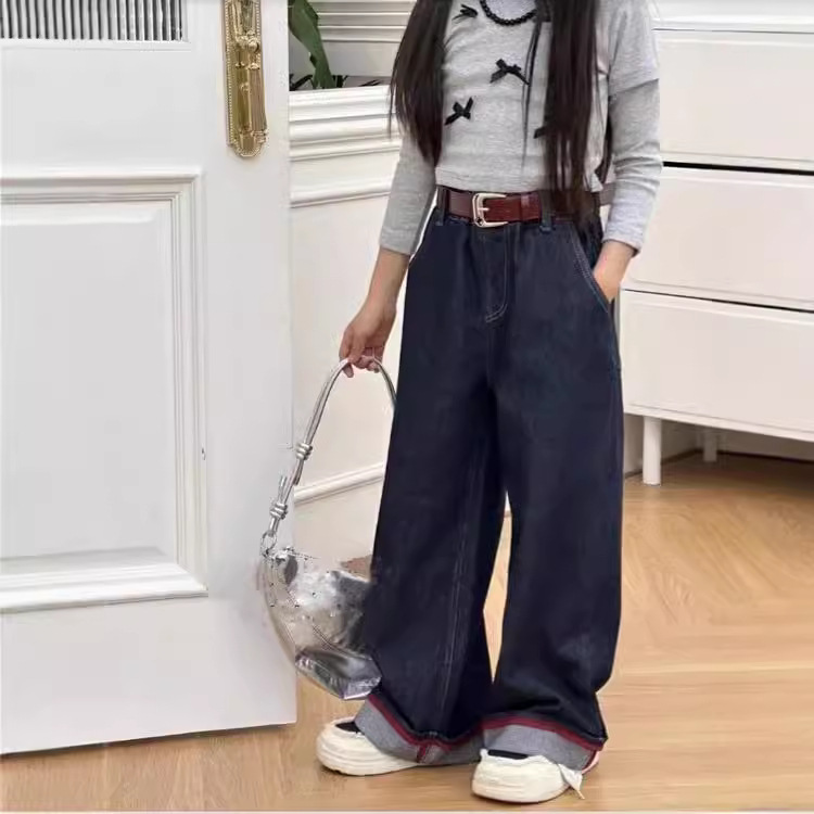 소녀 스트레이트-다리 청바지 봄과 가을 2024 새로운 서양식 어린이 바지 빅 보이 걸스 솔리드 컬러 와이드 레그 바지