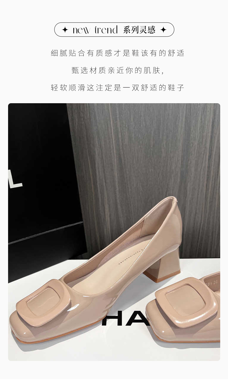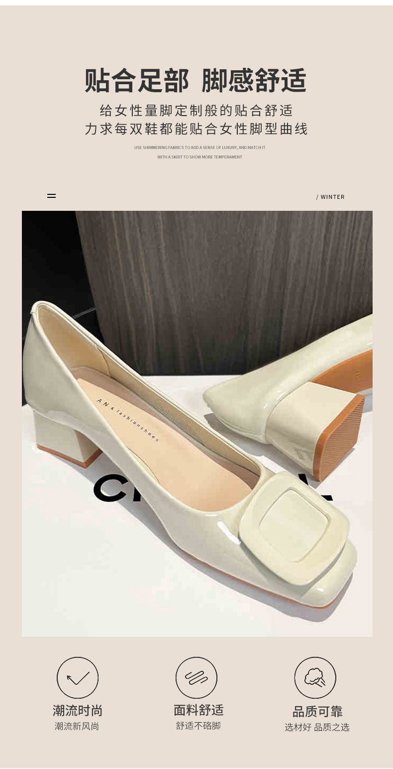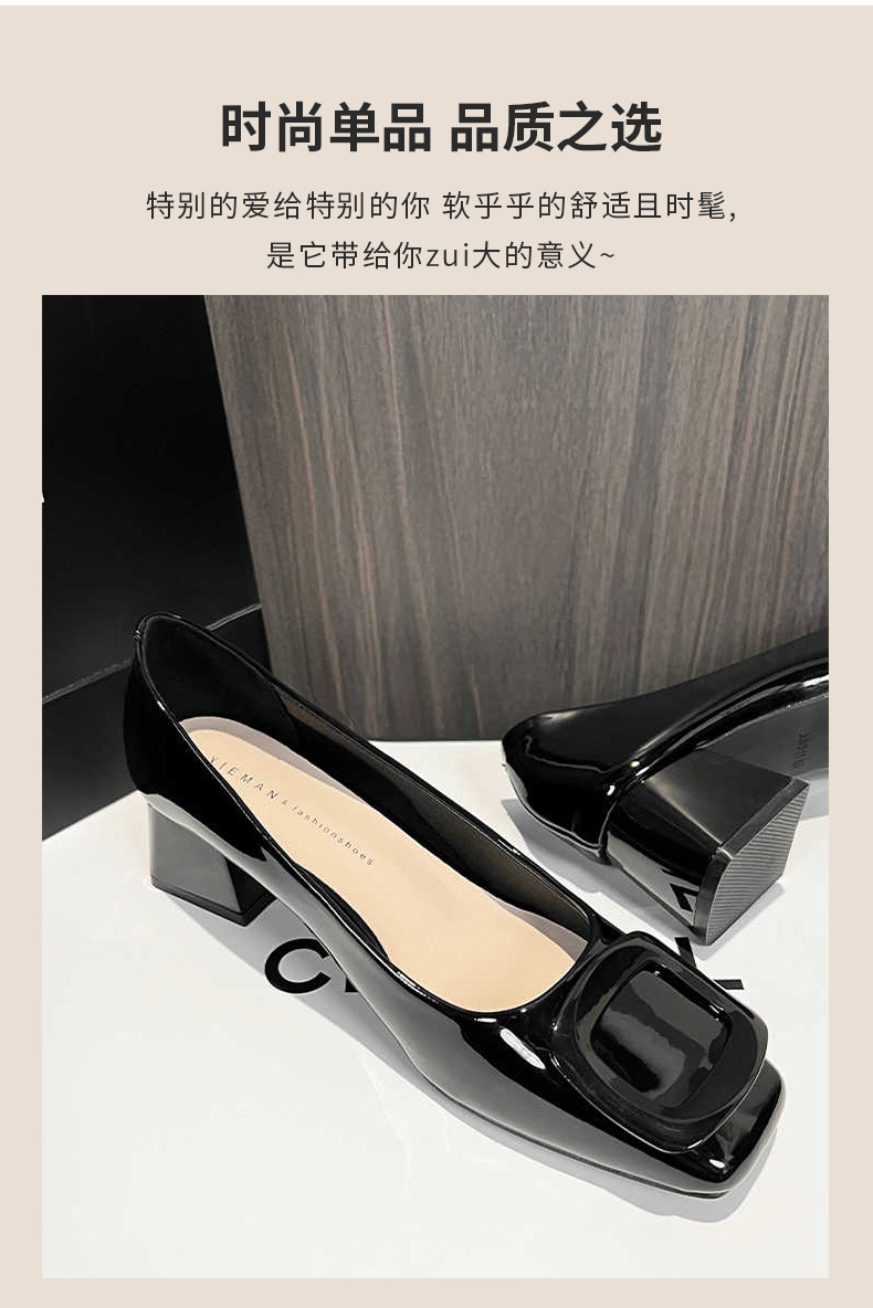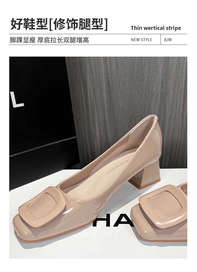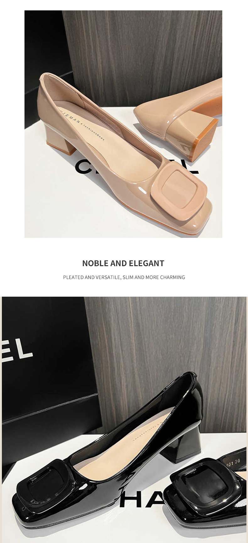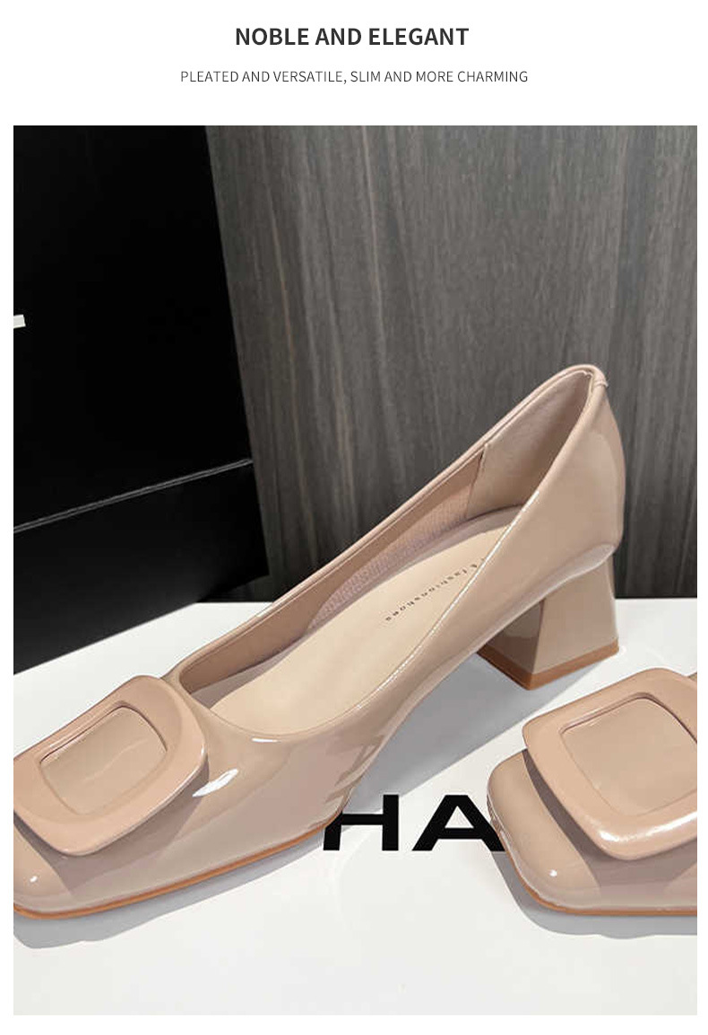 스퀘어 헤드 두꺼운 힐 신발 여성 봄과 가을 프랑스 스퀘어 버클 누드 기질 얕은 입 특허 가죽 여성 스타일 하이힐 도매
