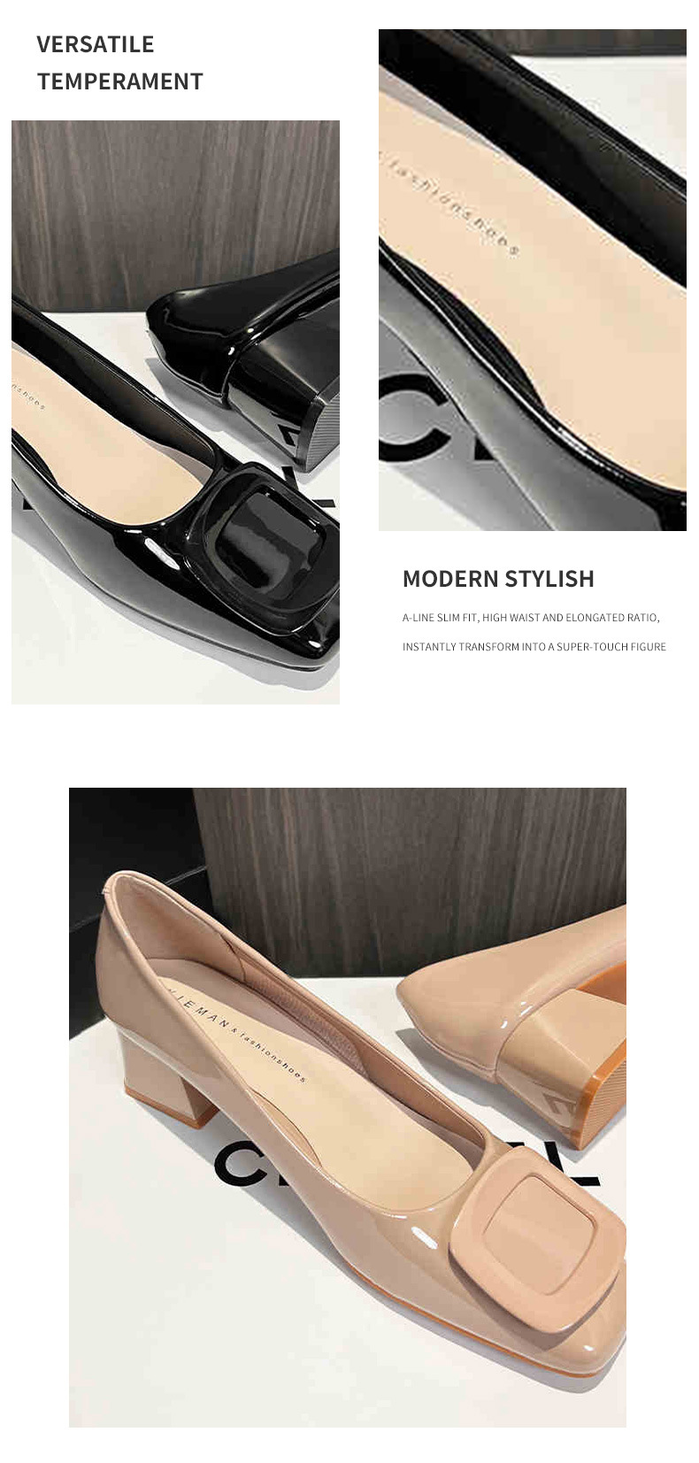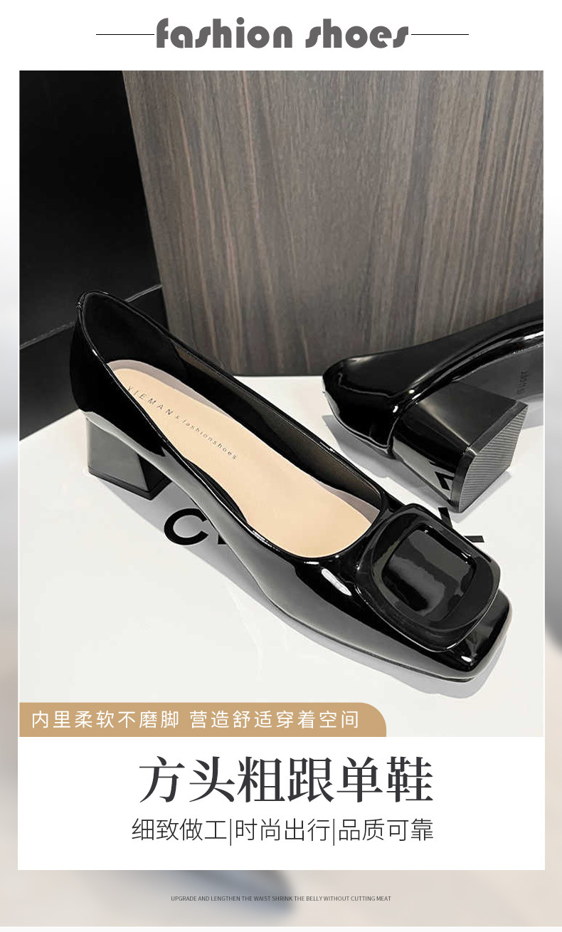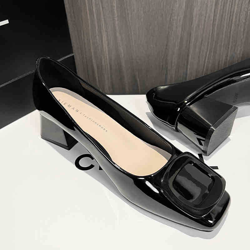 스퀘어 헤드 두꺼운 힐 신발 여성 봄과 가을 프랑스 스퀘어 버클 누드 기질 얕은 입 특허 가죽 여성 스타일 하이힐 도매스토어 가기
