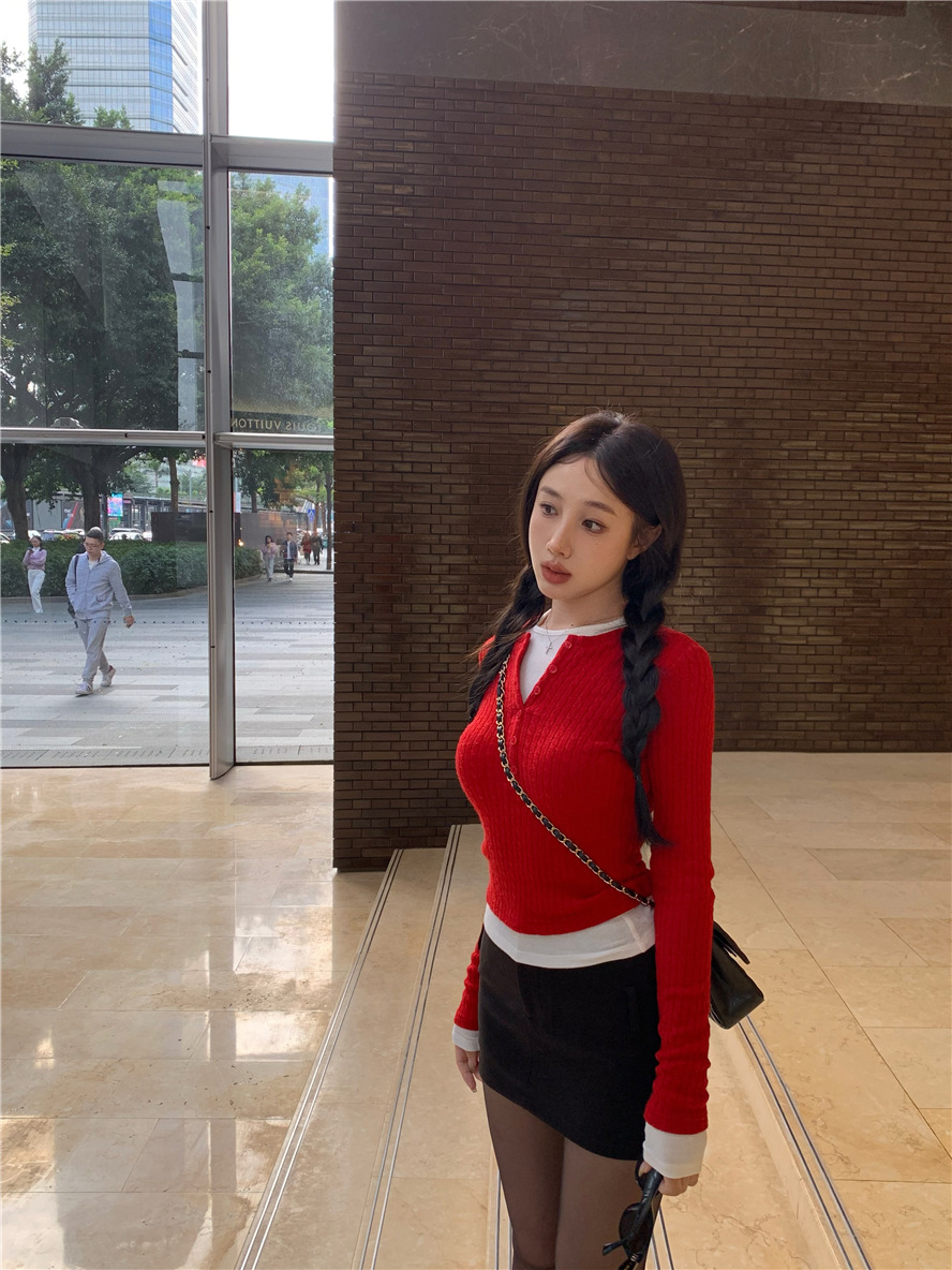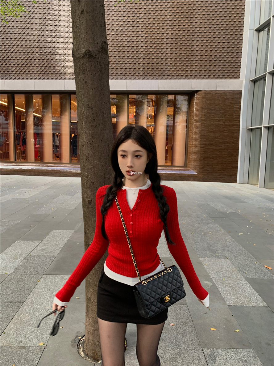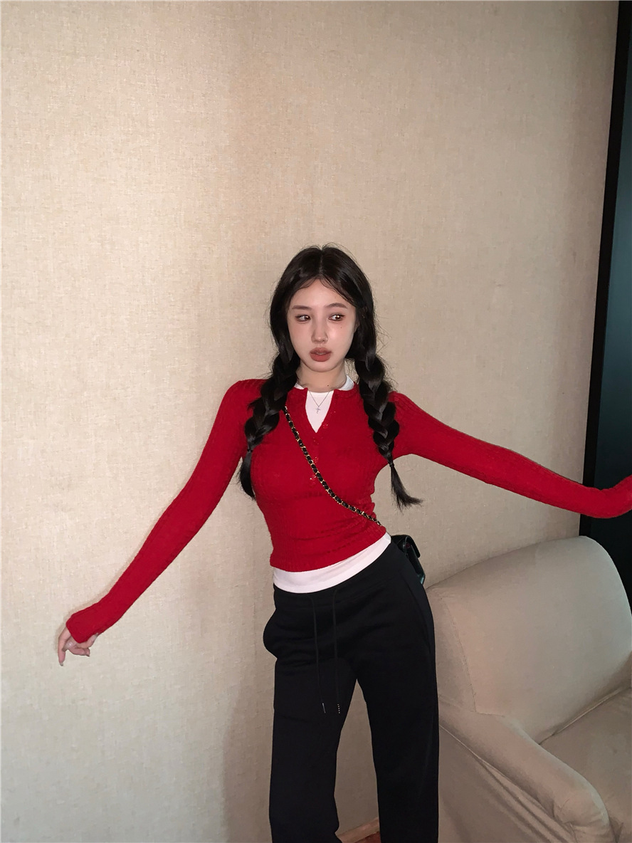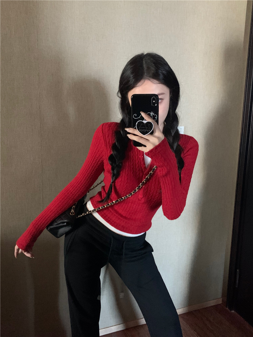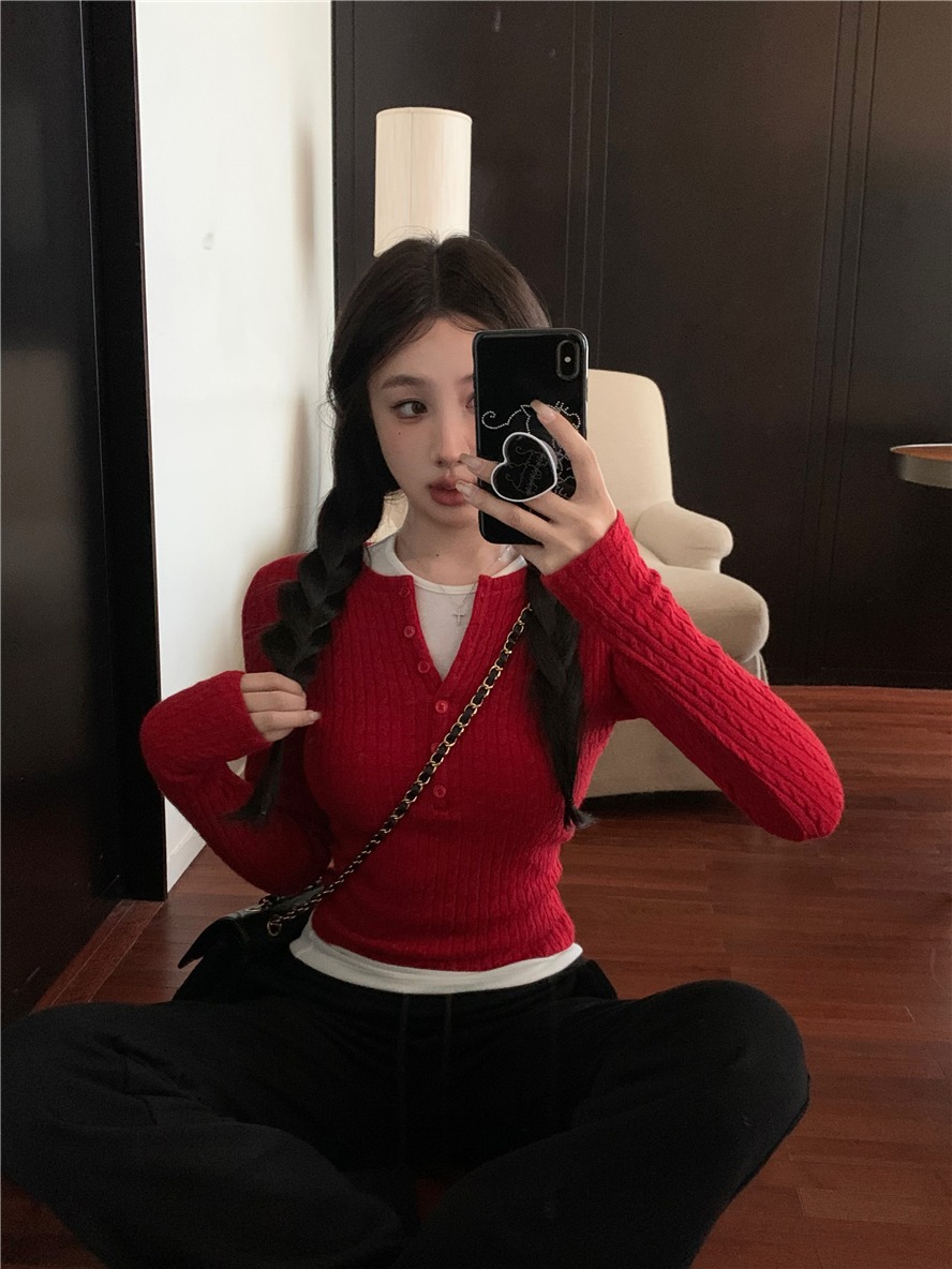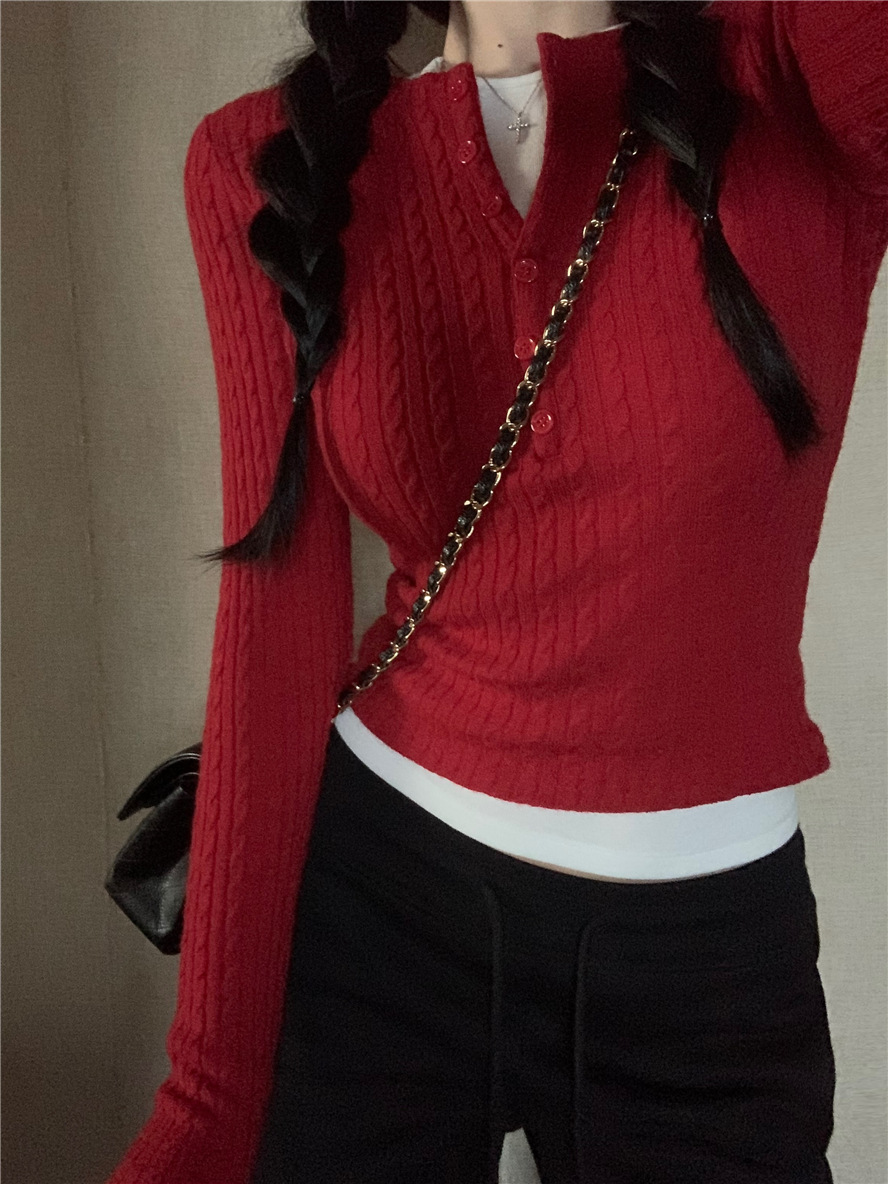 레드 트위스트 스웨터 여성의 가을 빈티지 긴팔 타이트 스웨터 내베이스 셔츠 짧은 하프 오픈 칼라 탑