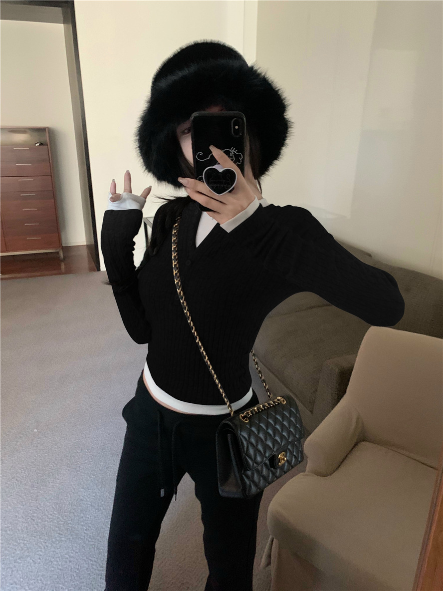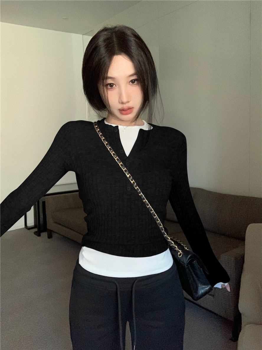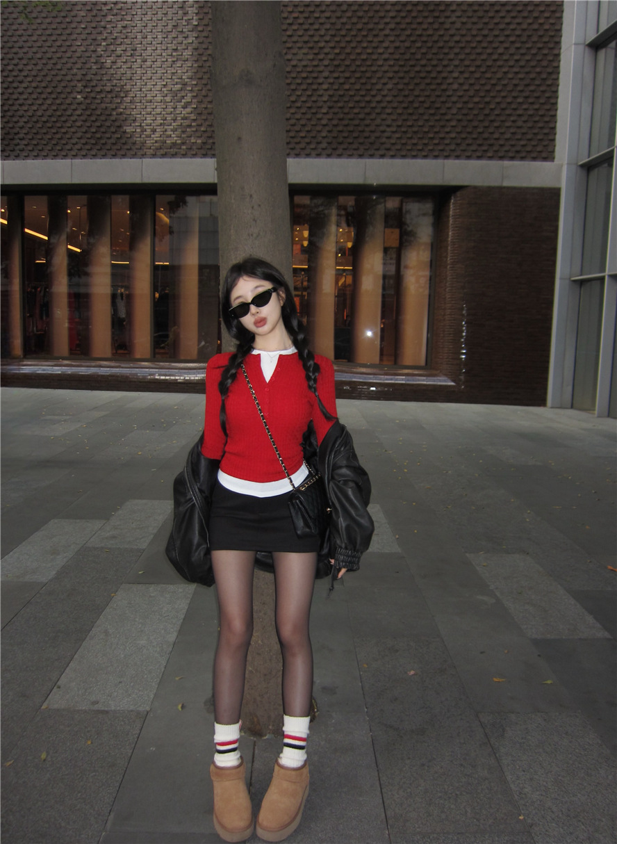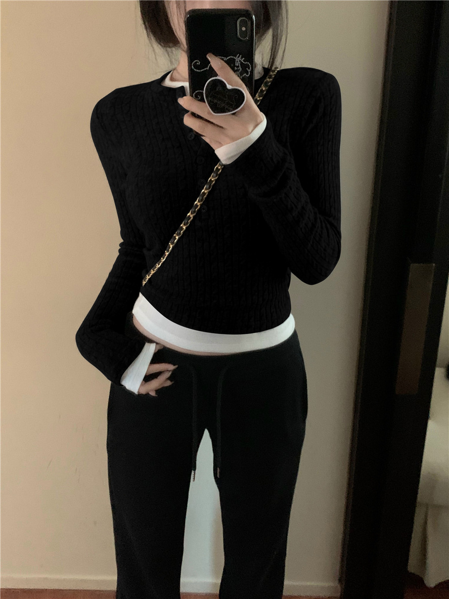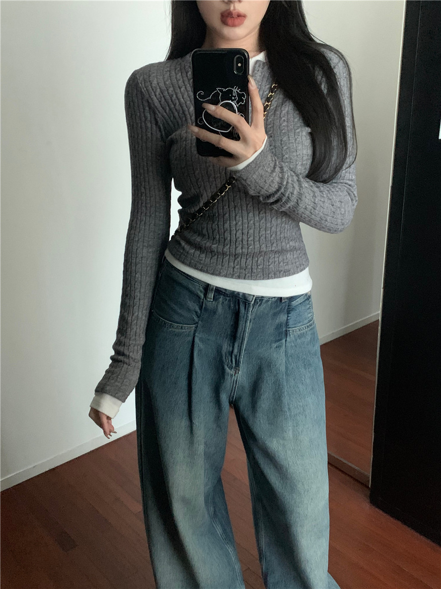레드 트위스트 스웨터 여성의 가을 빈티지 긴팔 타이트 스웨터 내베이스 셔츠 짧은 하프 오픈 칼라 탑