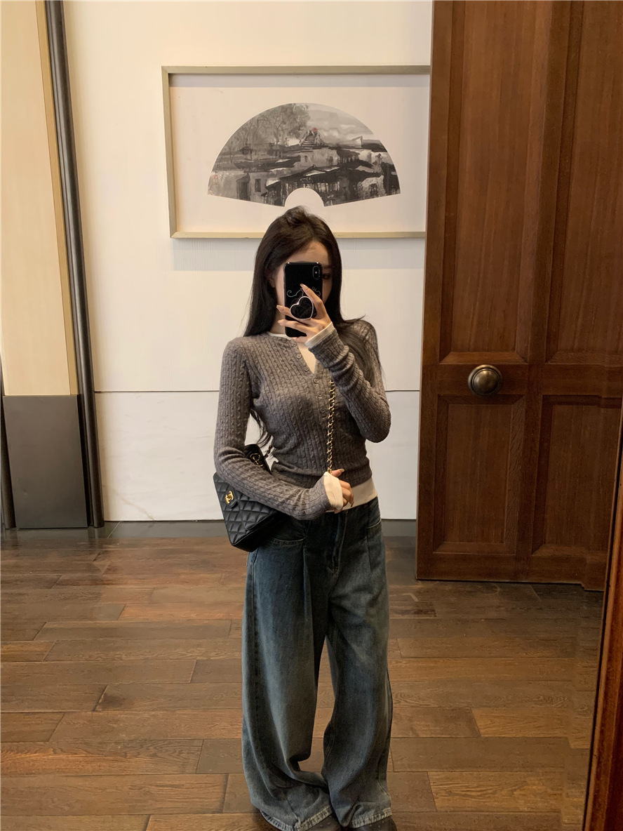 레드 트위스트 스웨터 여성의 가을 빈티지 긴팔 타이트 스웨터 내베이스 셔츠 짧은 하프 오픈 칼라 탑스토어 가기