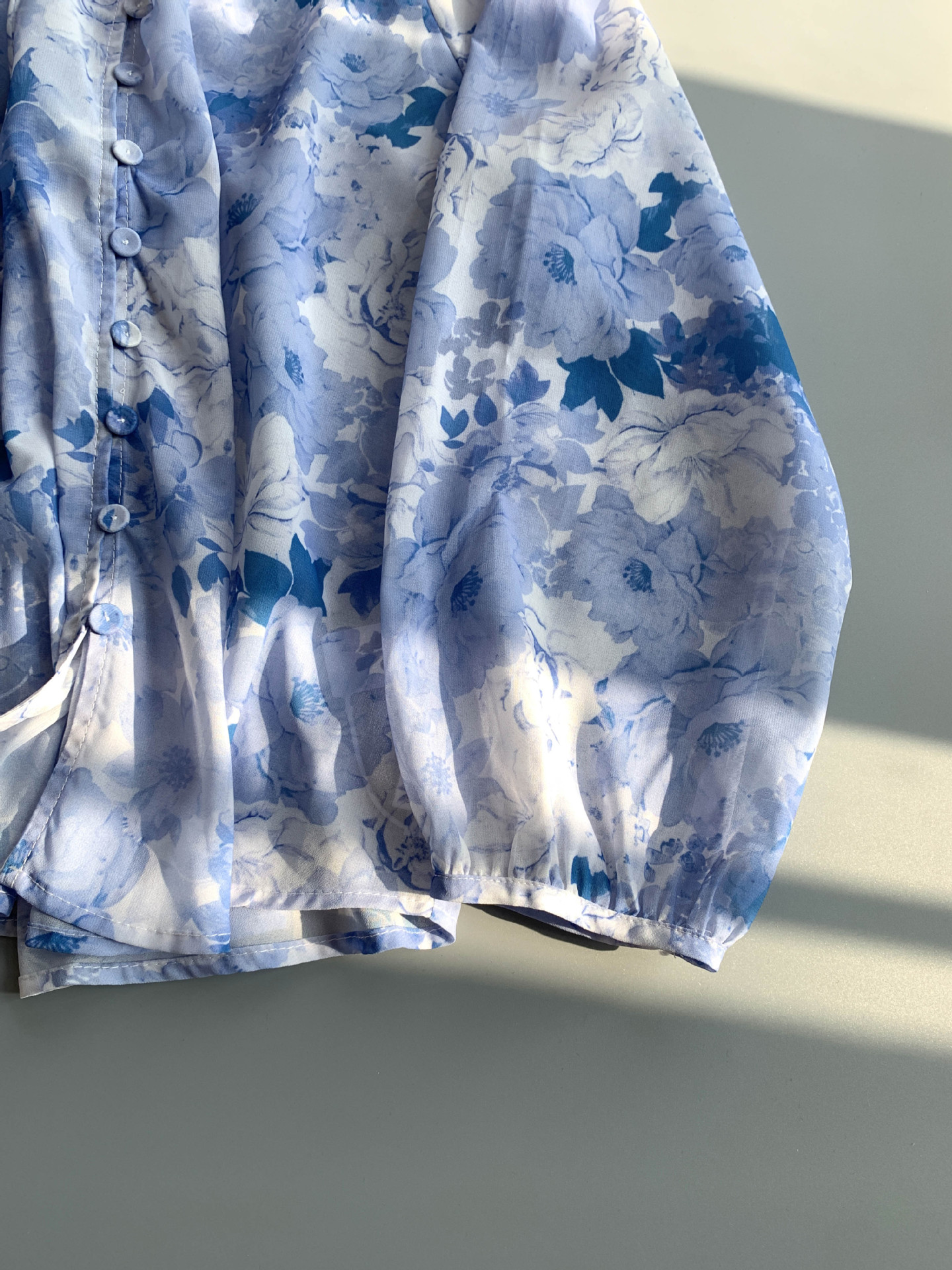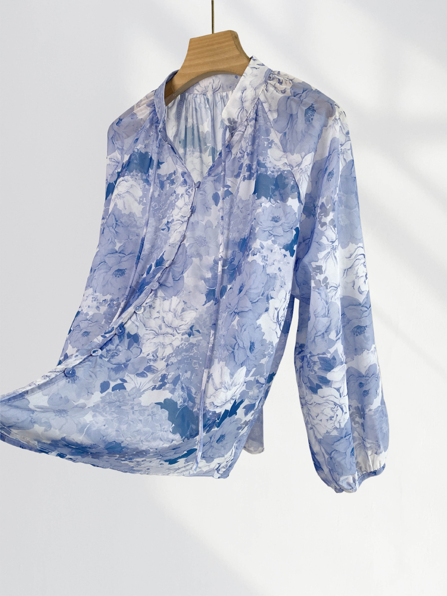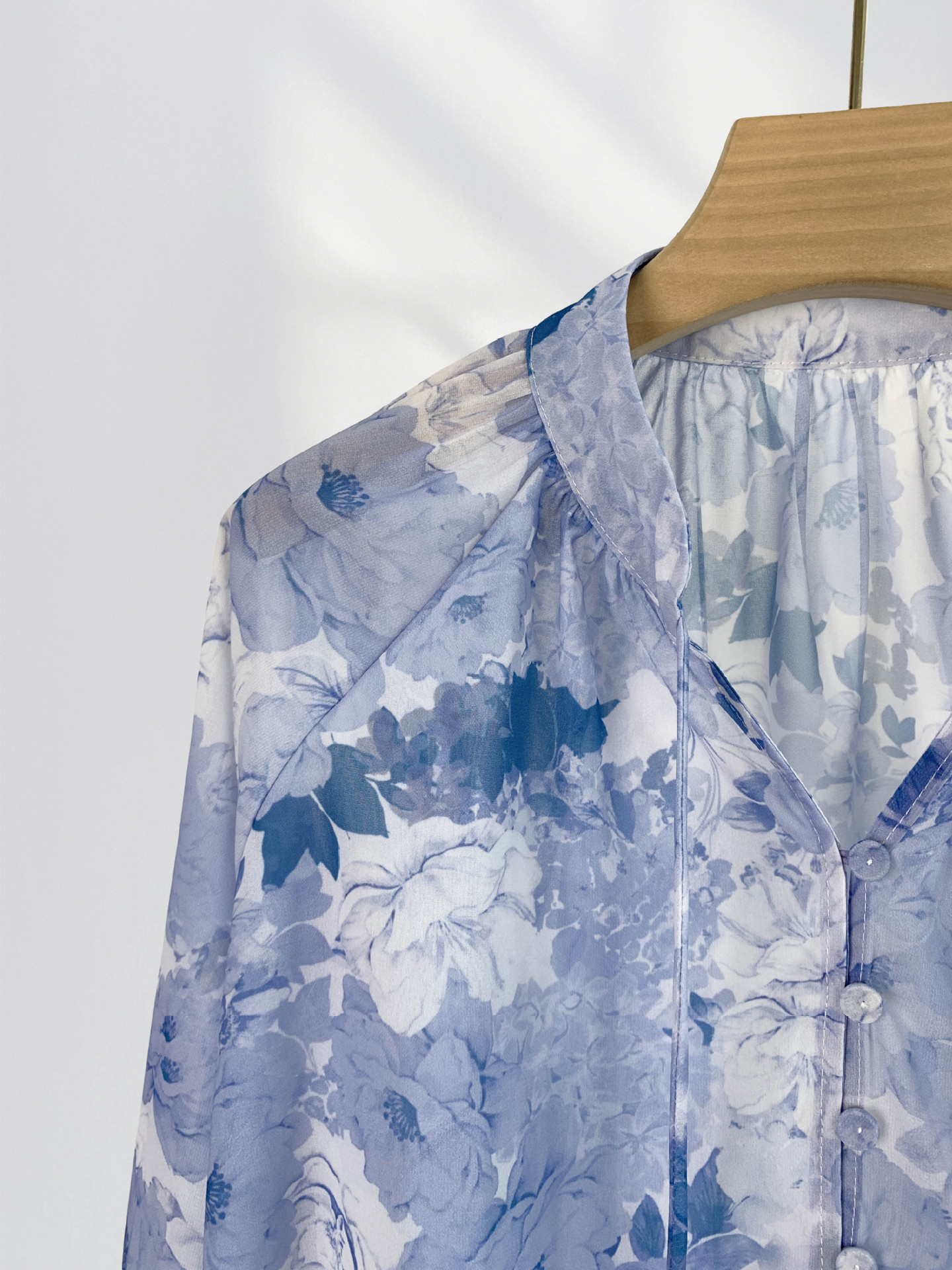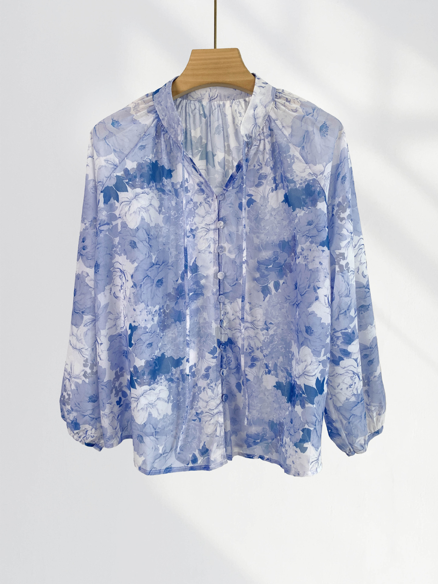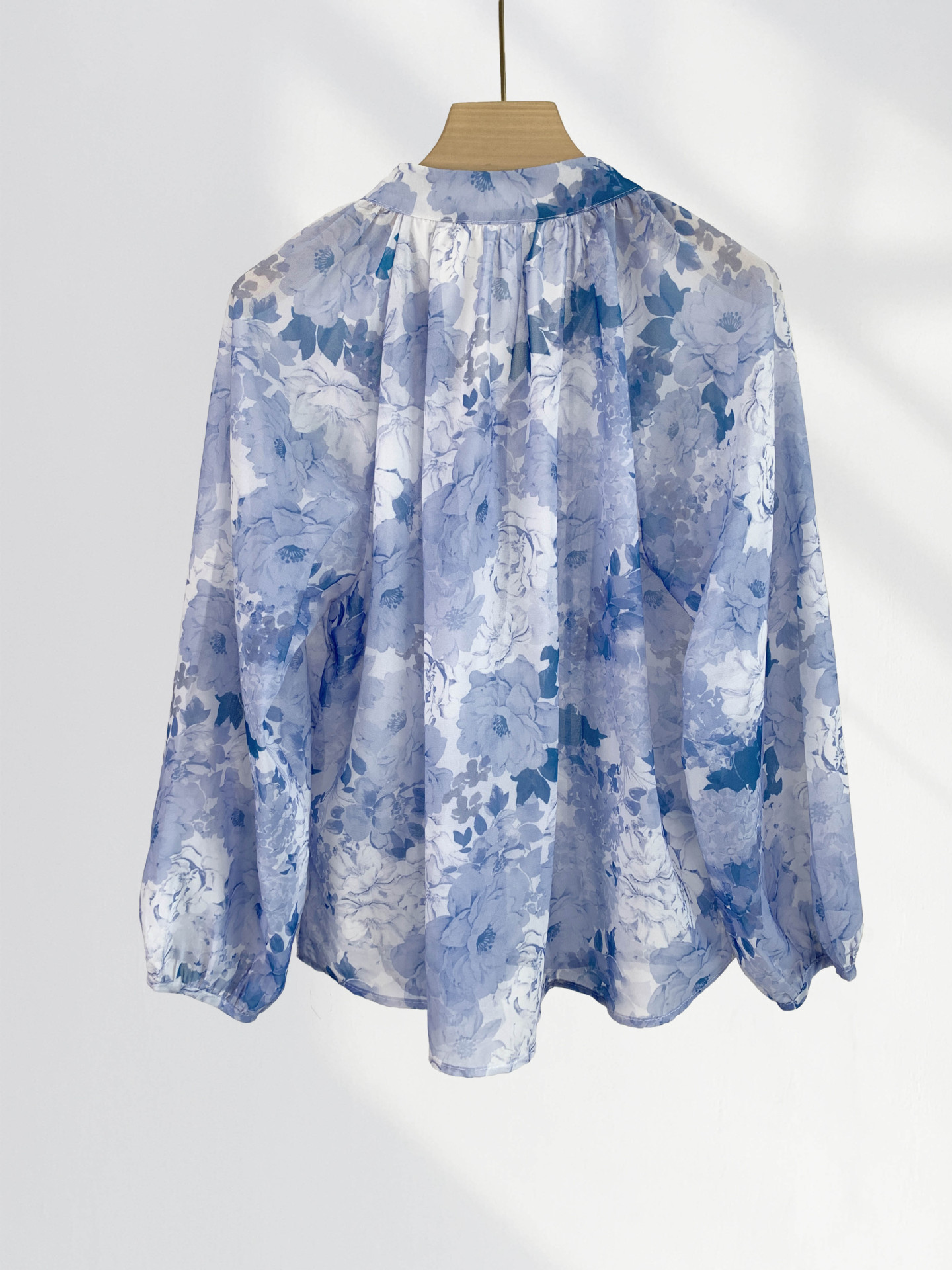 카운터 싱글 하이 퀄리티 블루 모란 프린트 V 넥 셔츠 여성의 가을 새로운 레이스 업 퍼프 슬리브 쉬폰 셔츠스토어 가기