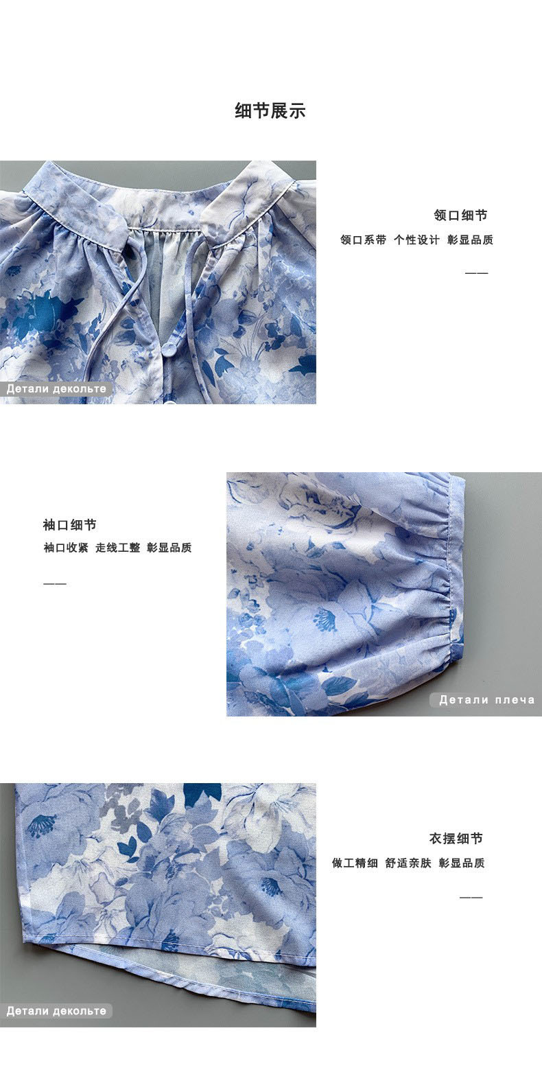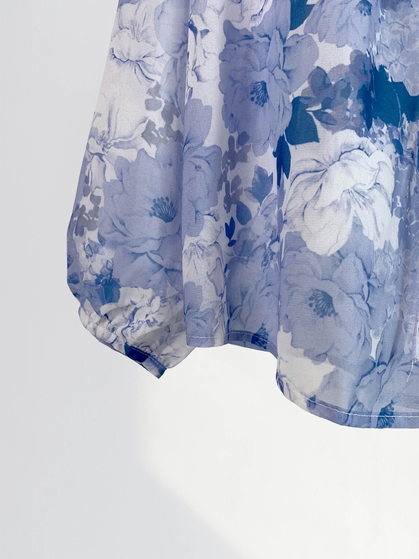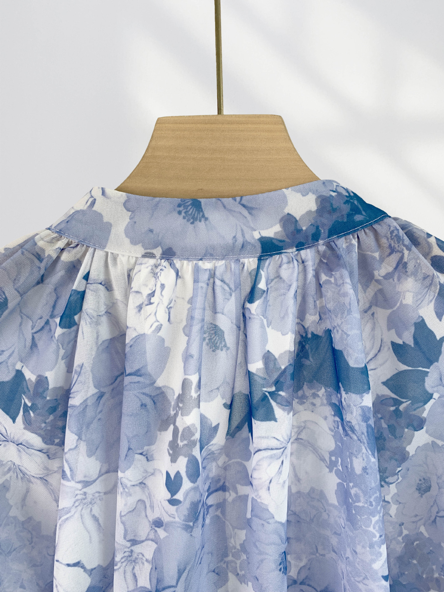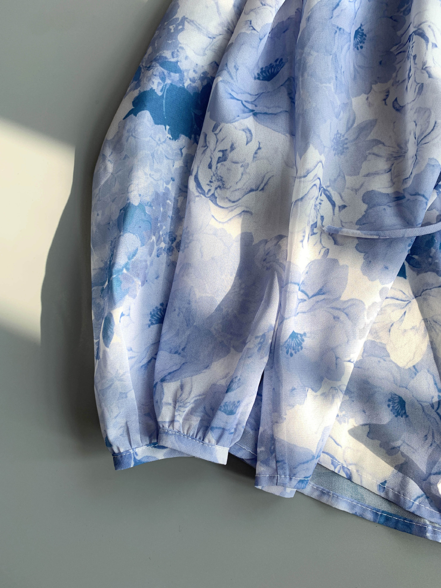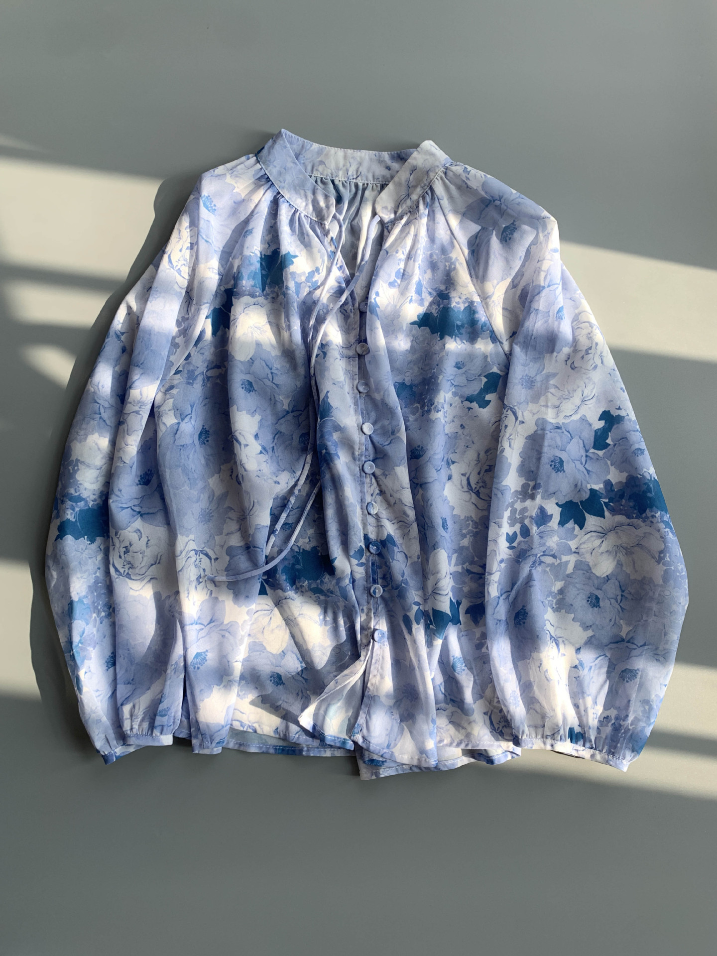 카운터 싱글 하이 퀄리티 블루 모란 프린트 V 넥 셔츠 여성의 가을 새로운 레이스 업 퍼프 슬리브 쉬폰 셔츠스토어 가기