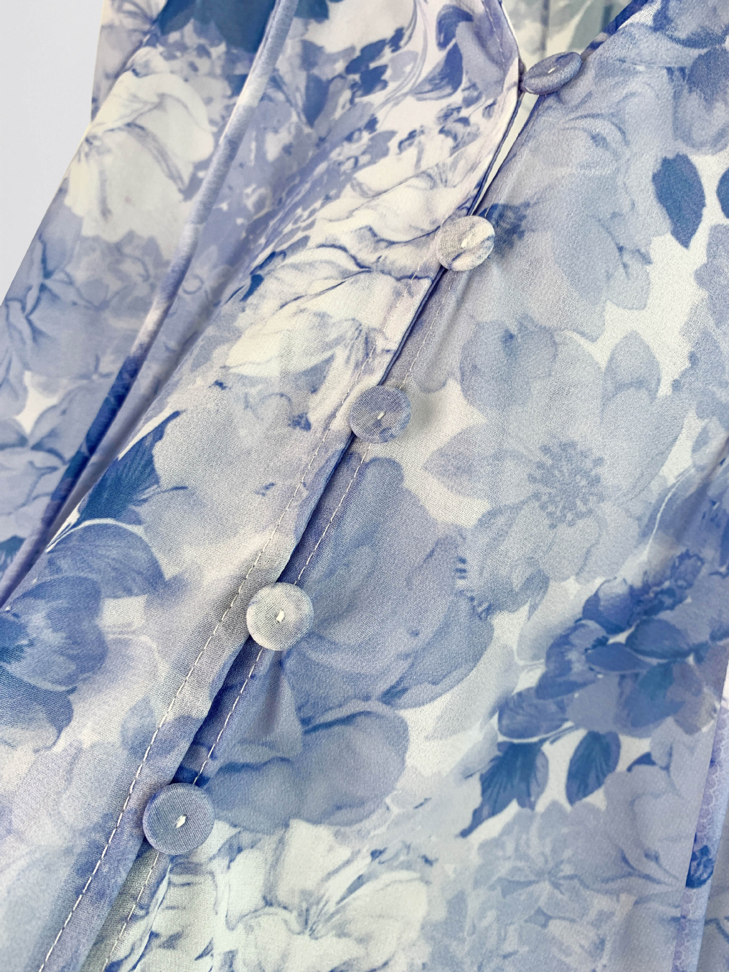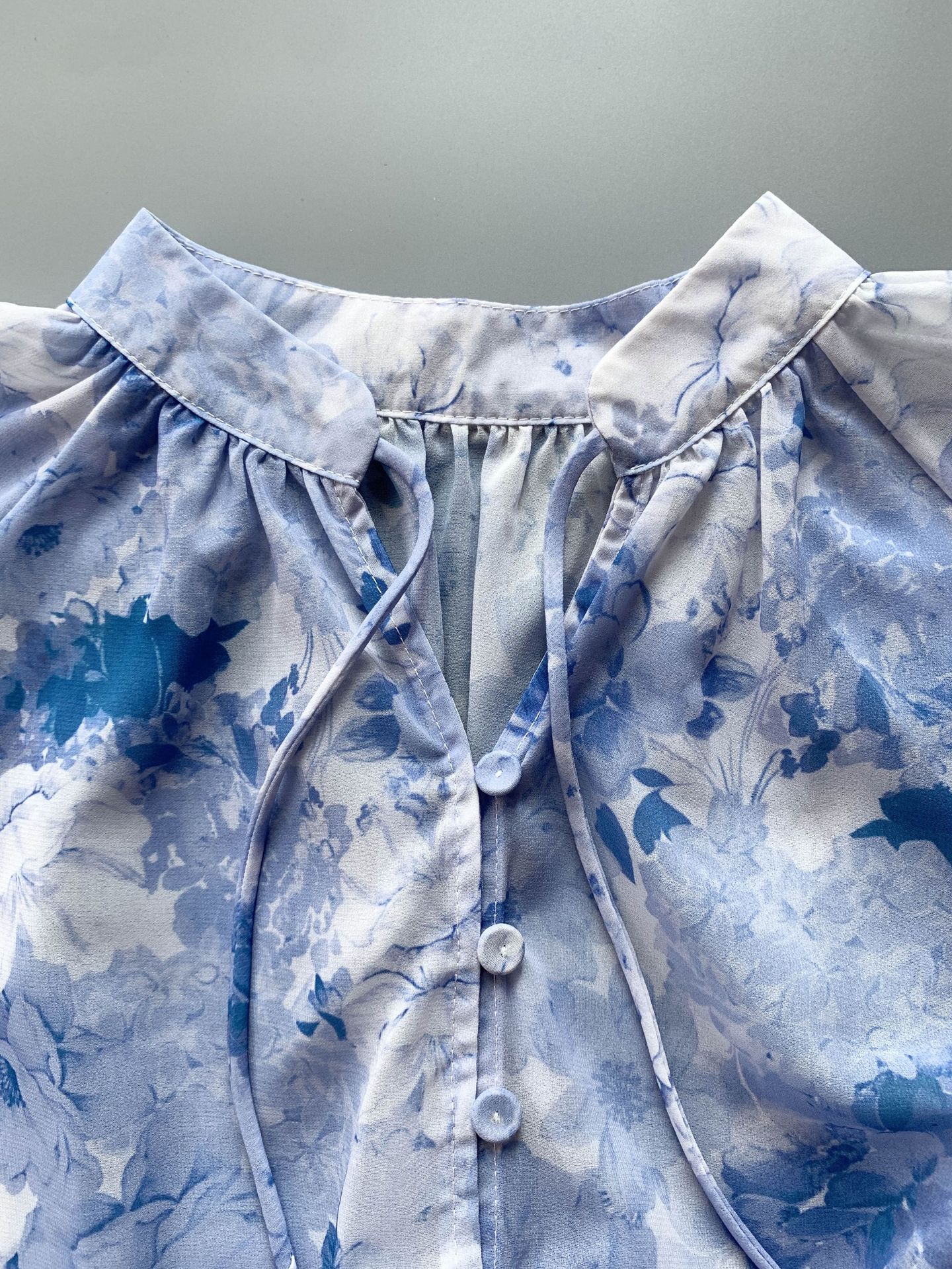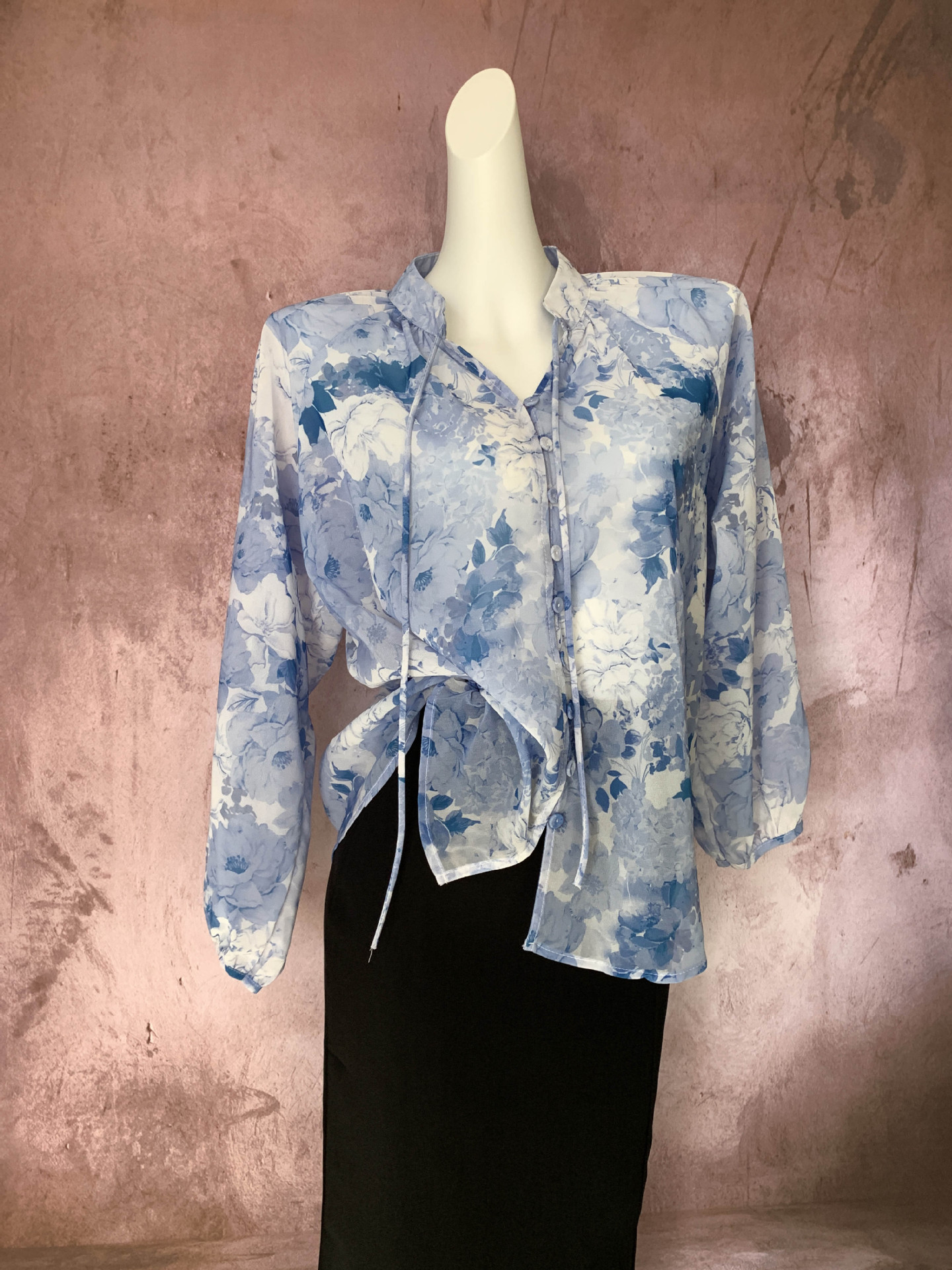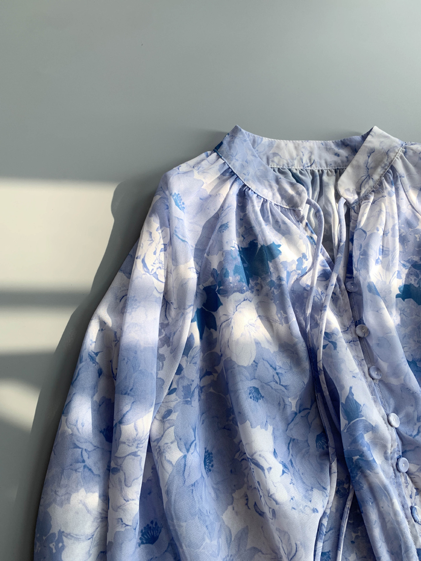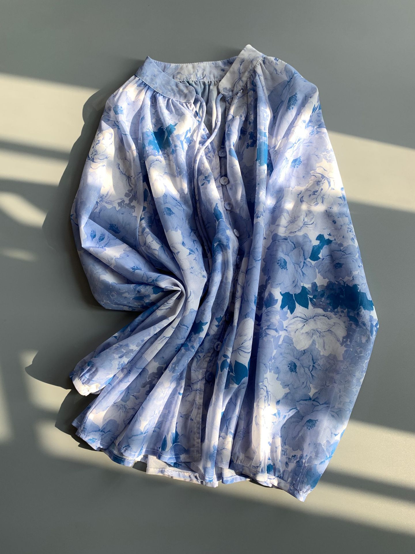 카운터 싱글 하이 퀄리티 블루 모란 프린트 V 넥 셔츠 여성의 가을 새로운 레이스 업 퍼프 슬리브 쉬폰 셔츠스토어 가기