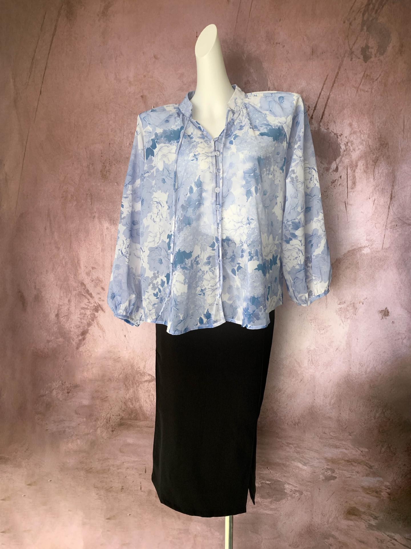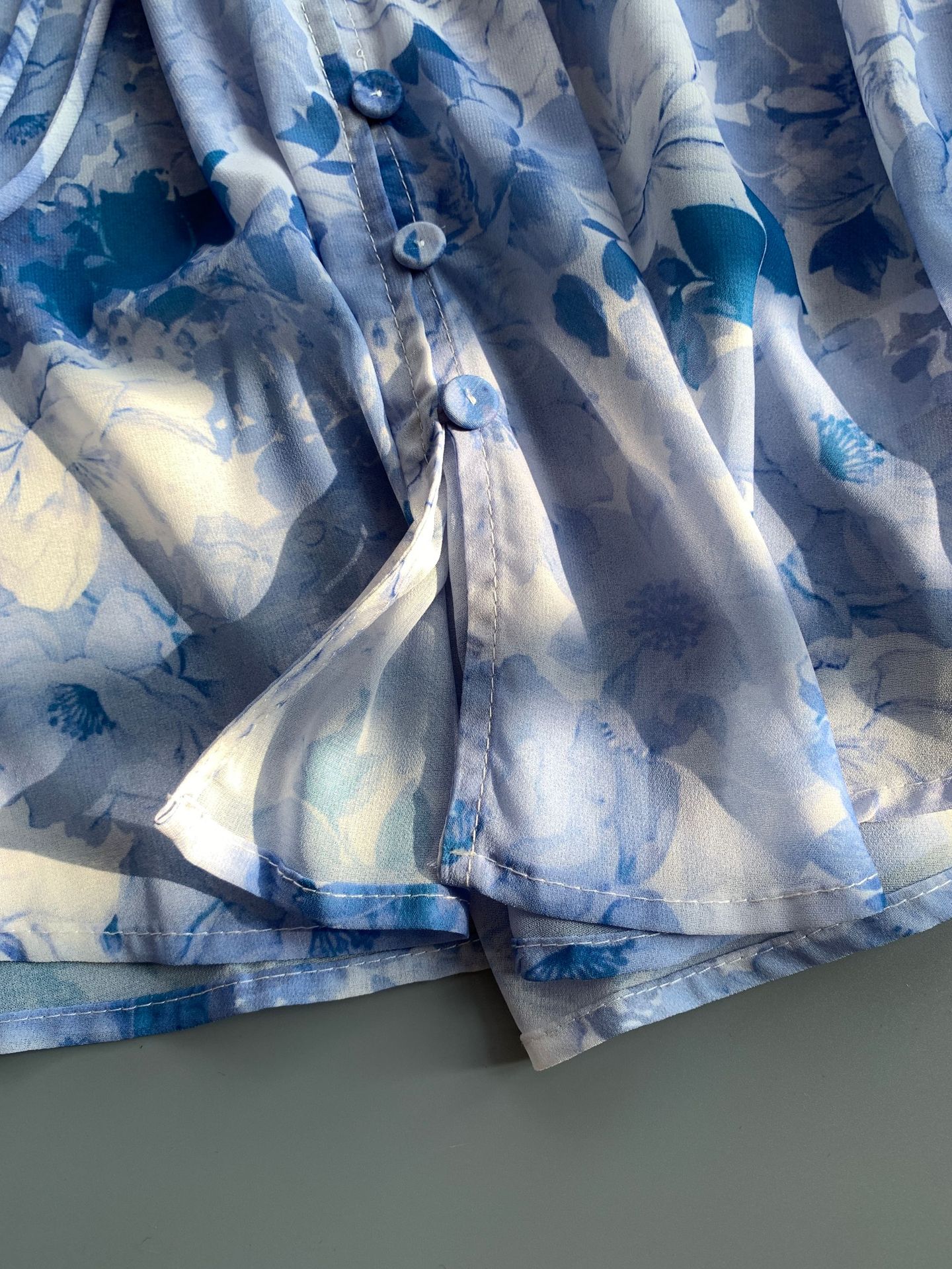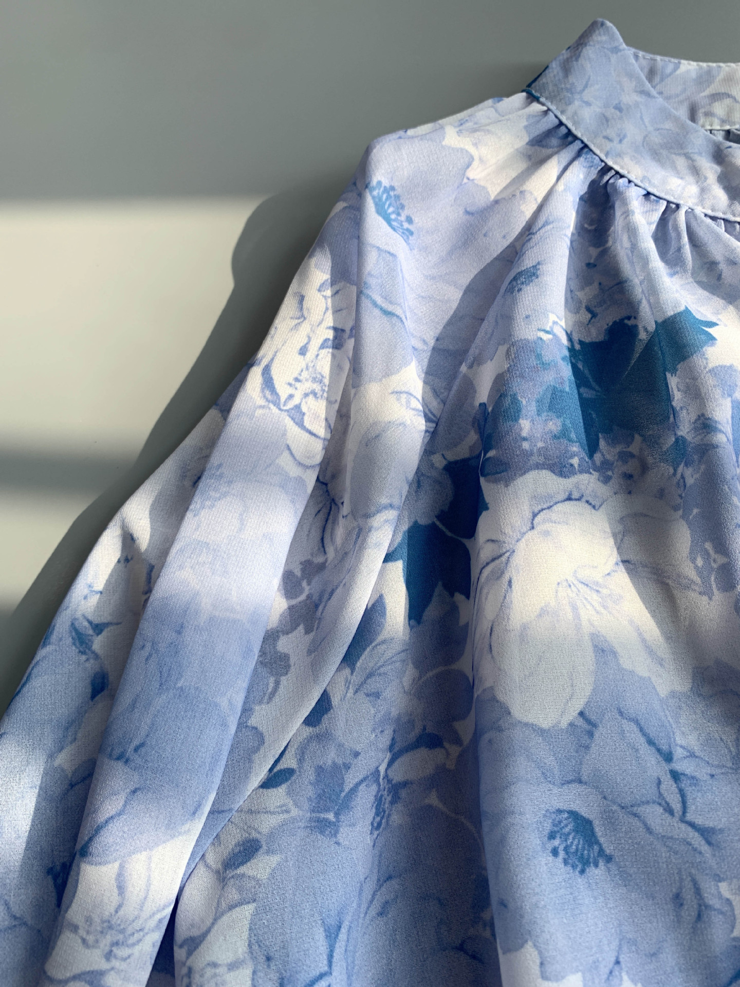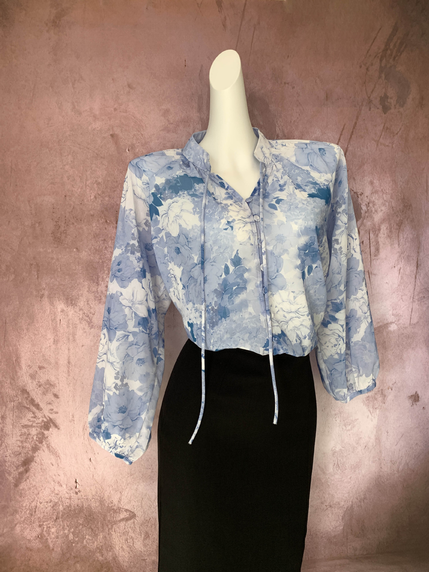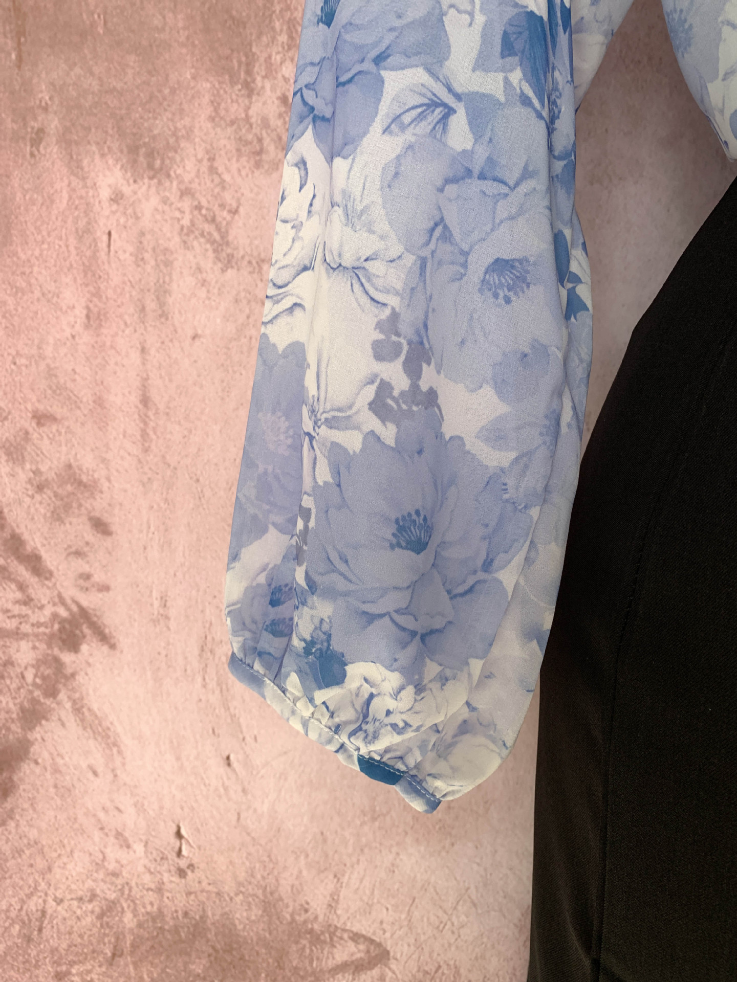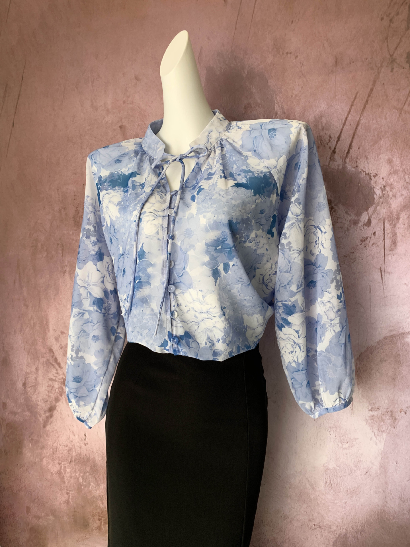 카운터 싱글 하이 퀄리티 블루 모란 프린트 V 넥 셔츠 여성의 가을 새로운 레이스 업 퍼프 슬리브 쉬폰 셔츠스토어 가기