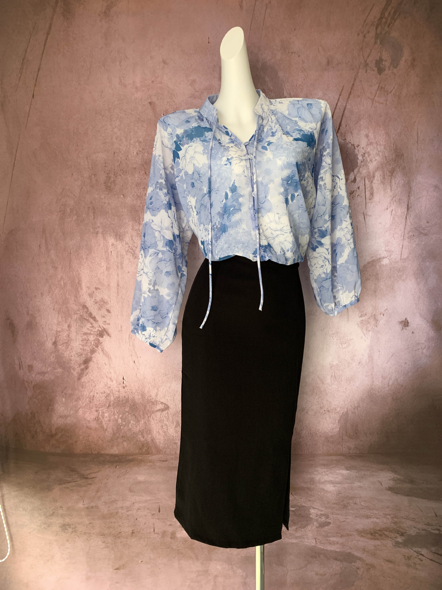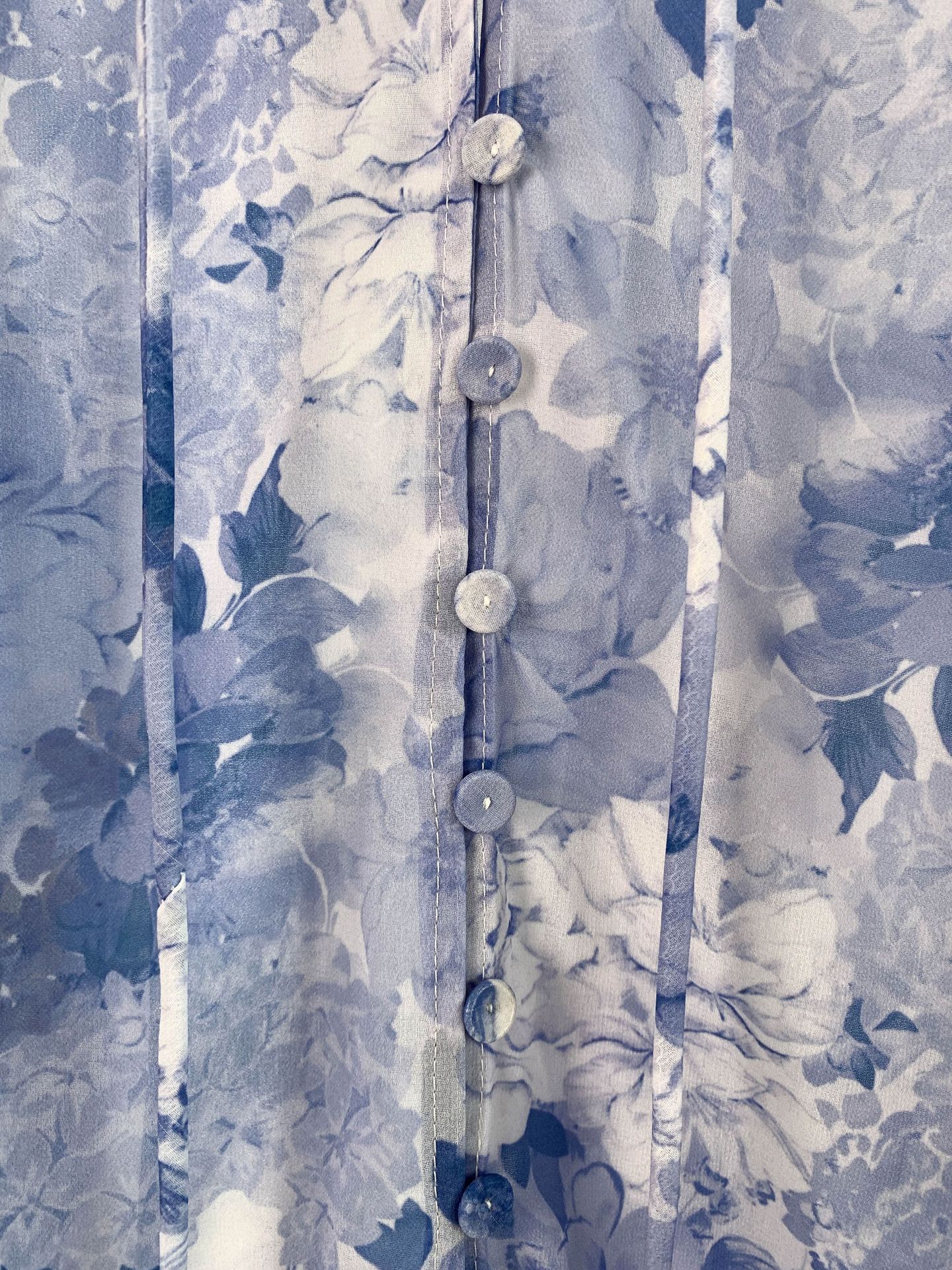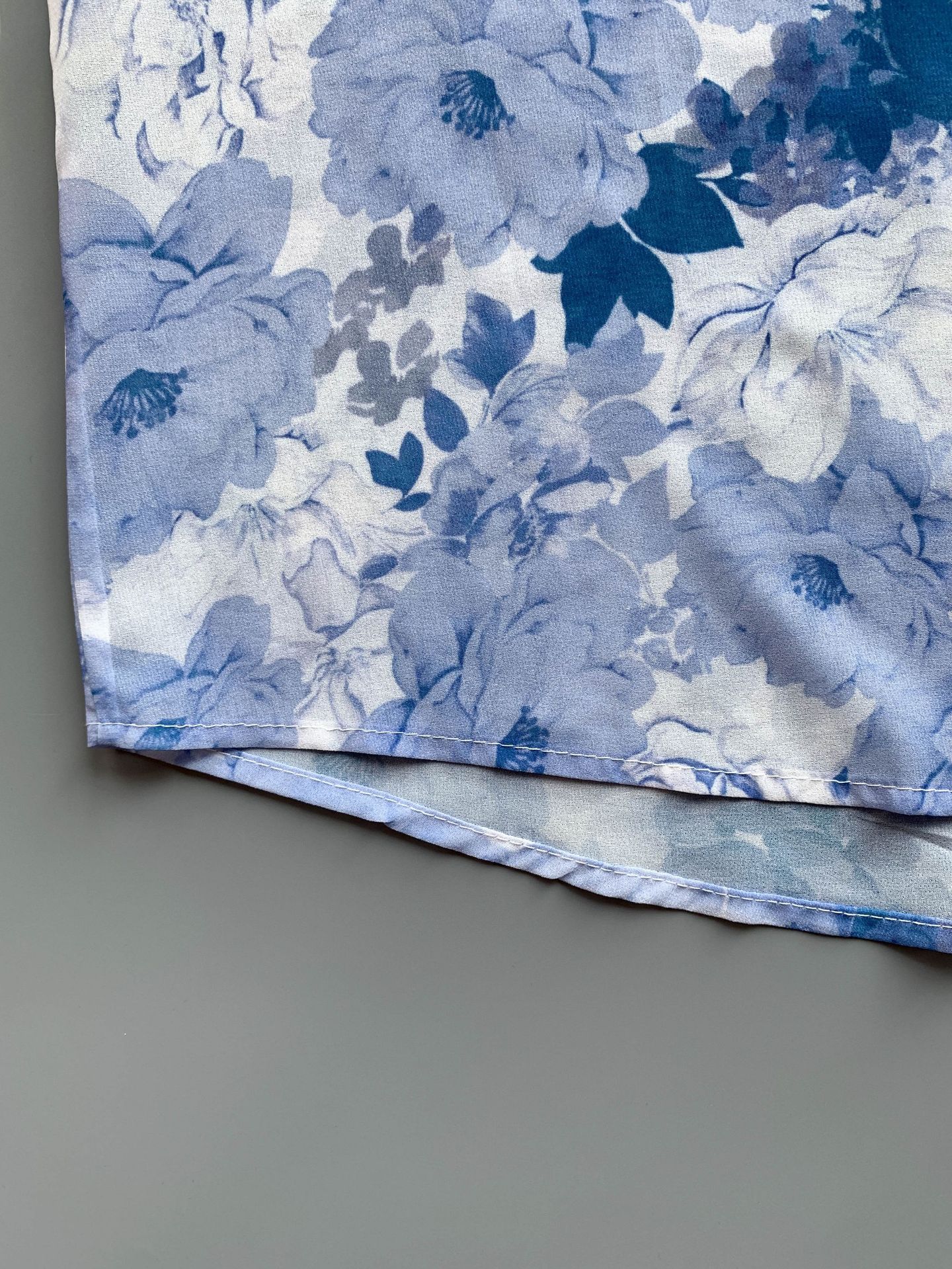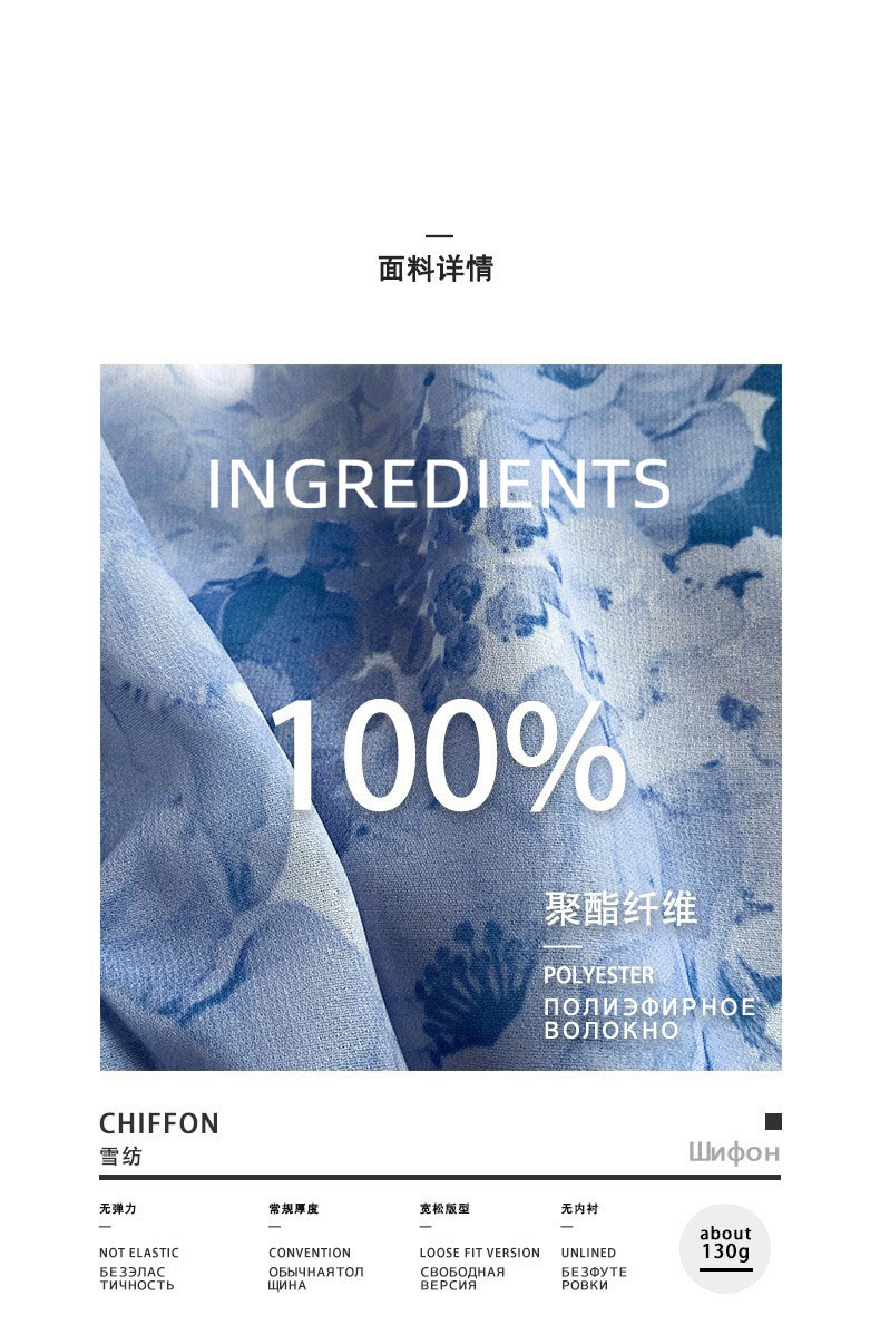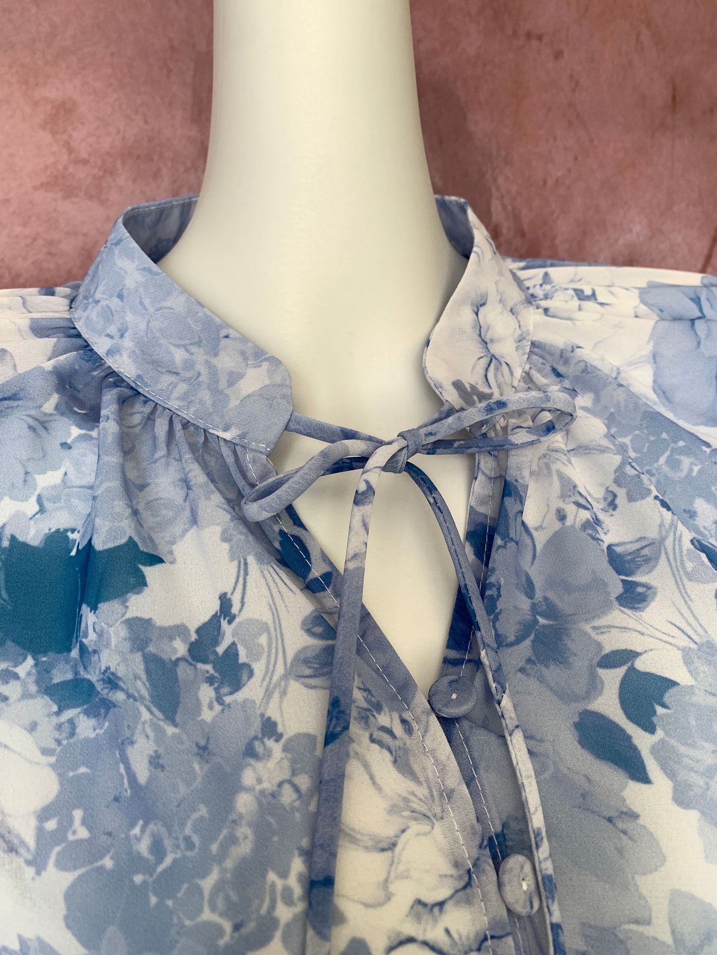 카운터 싱글 하이 퀄리티 블루 모란 프린트 V 넥 셔츠 여성의 가을 새로운 레이스 업 퍼프 슬리브 쉬폰 셔츠스토어 가기