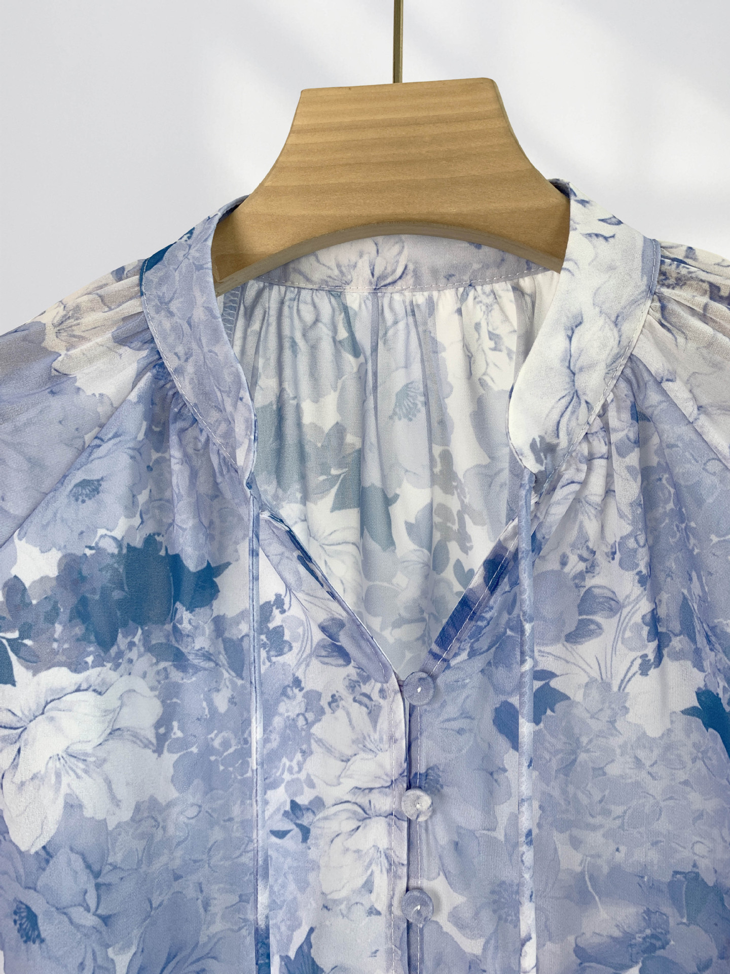 카운터 싱글 하이 퀄리티 블루 모란 프린트 V 넥 셔츠 여성의 가을 새로운 레이스 업 퍼프 슬리브 쉬폰 셔츠