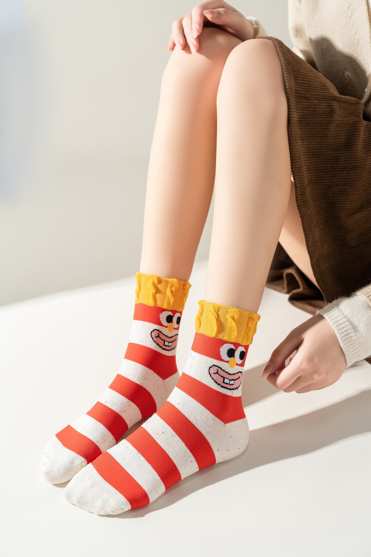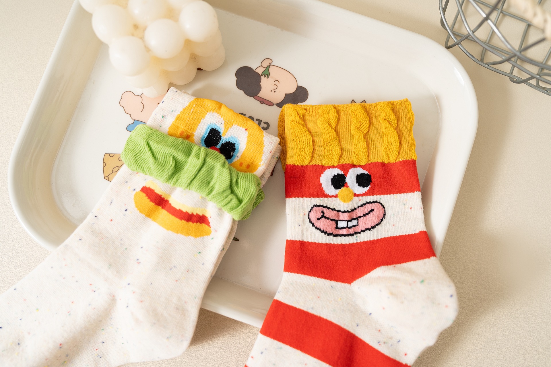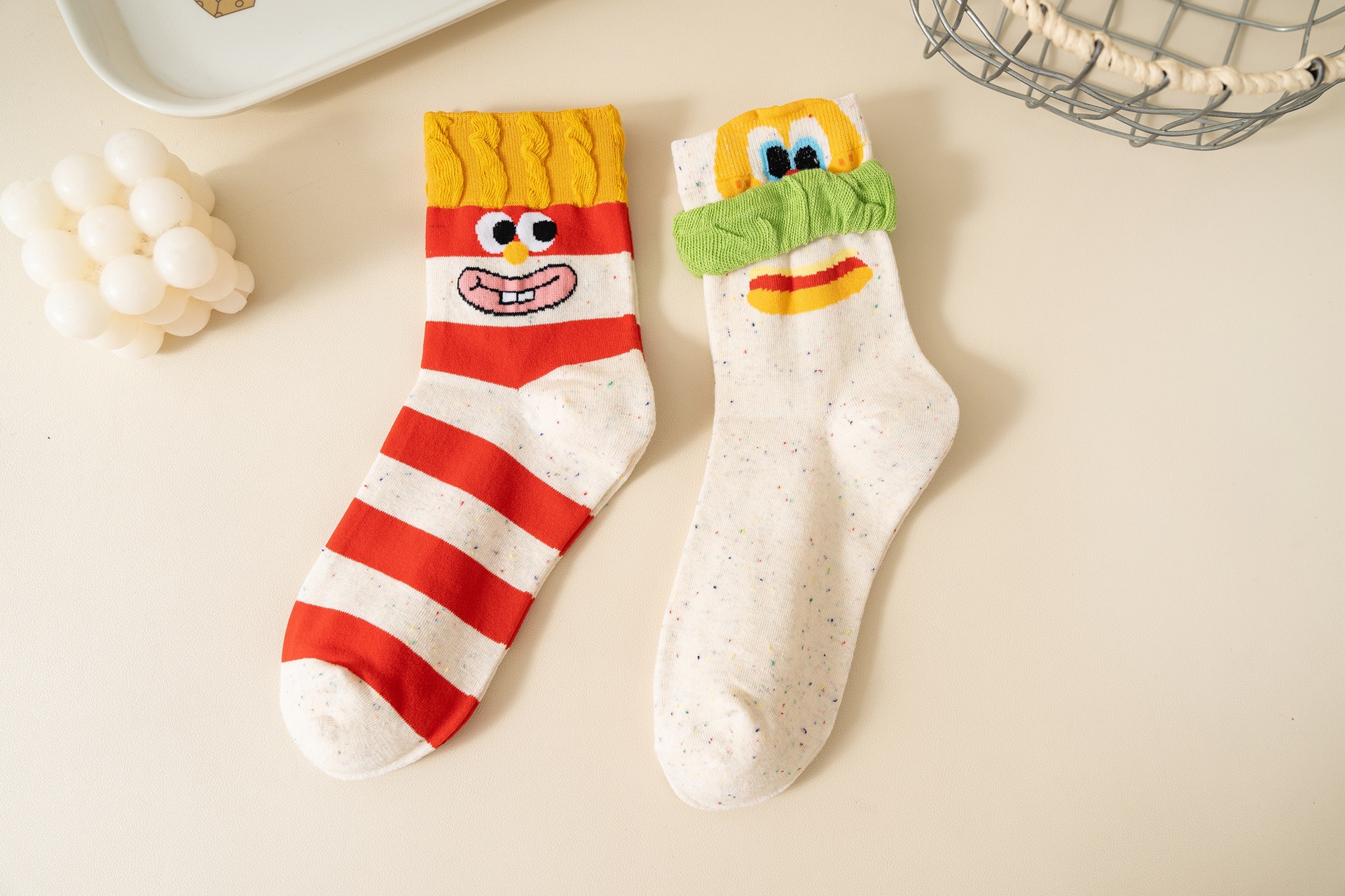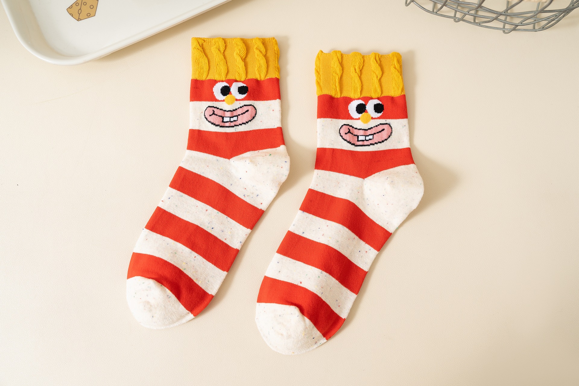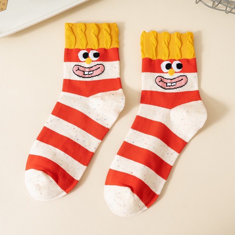 프랑스 프라이 양말 여성의 봄과 가을 귀여운 만화 코튼 중간 길이의 양말 재미 유행 디자인 센스 니쉬 스타킹