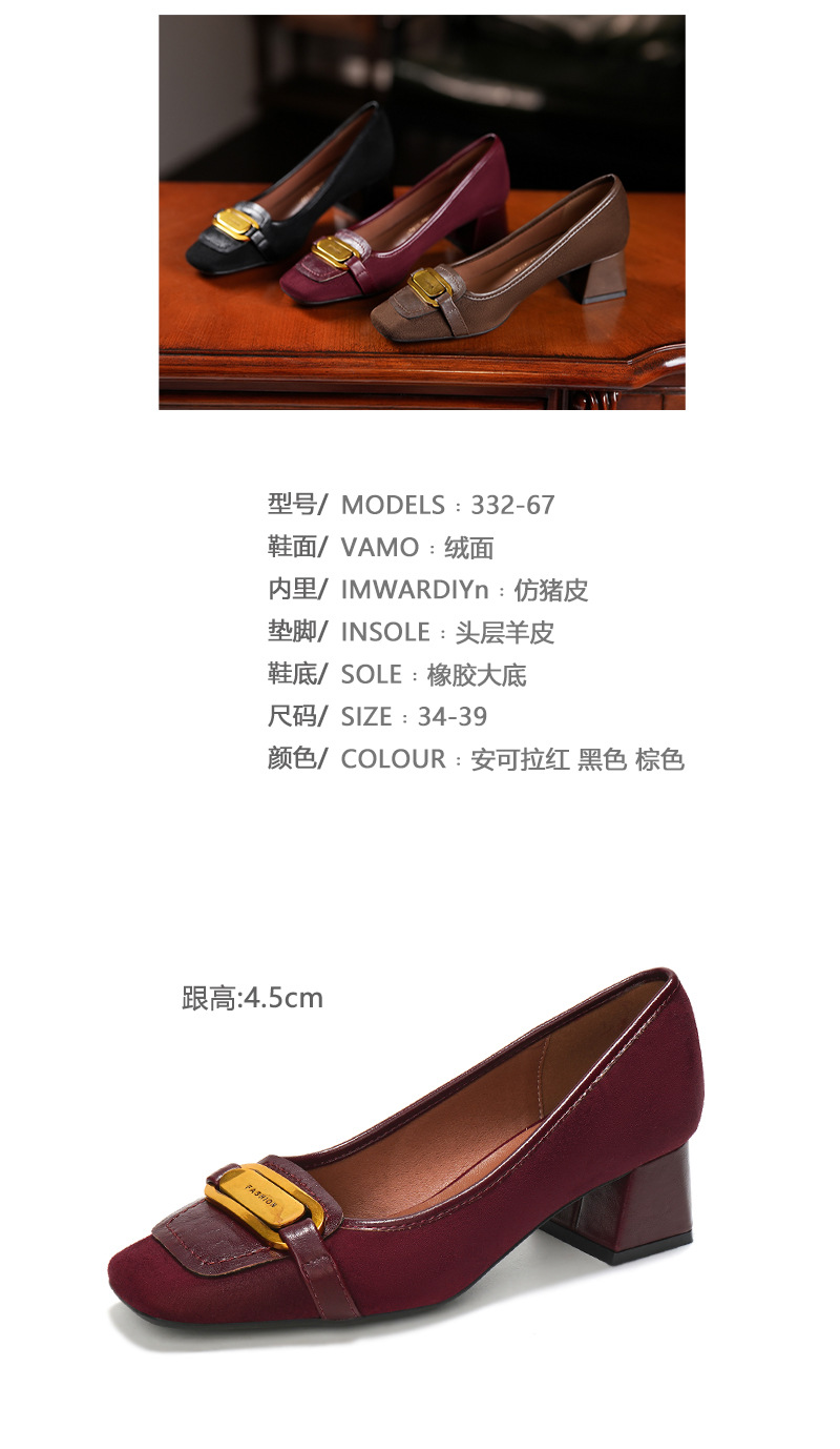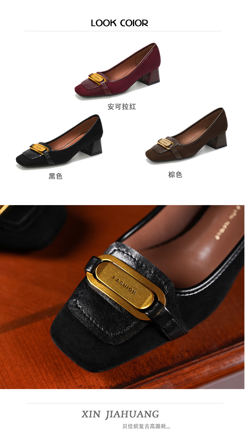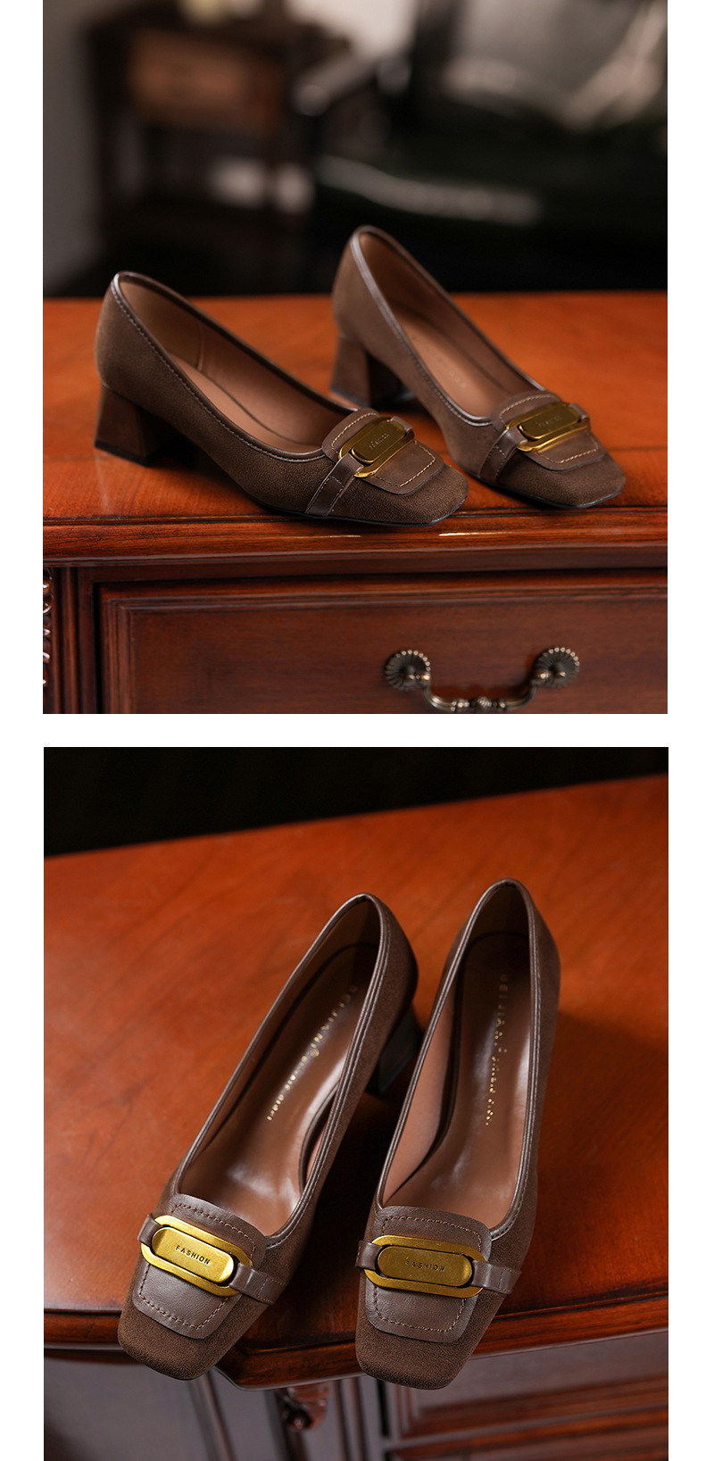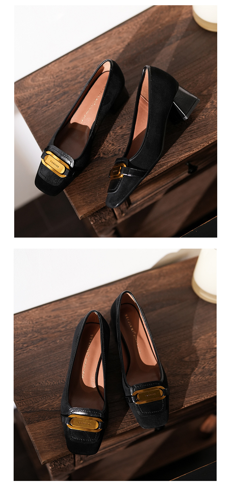 332-67 통근 양가죽 기질 4.5CM 하이힐 싱글 슈즈 여성 올 매치 스퀘어 헤드 메탈 버클 프로스트 두꺼운 힐 얕은 입