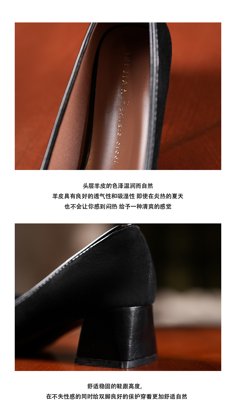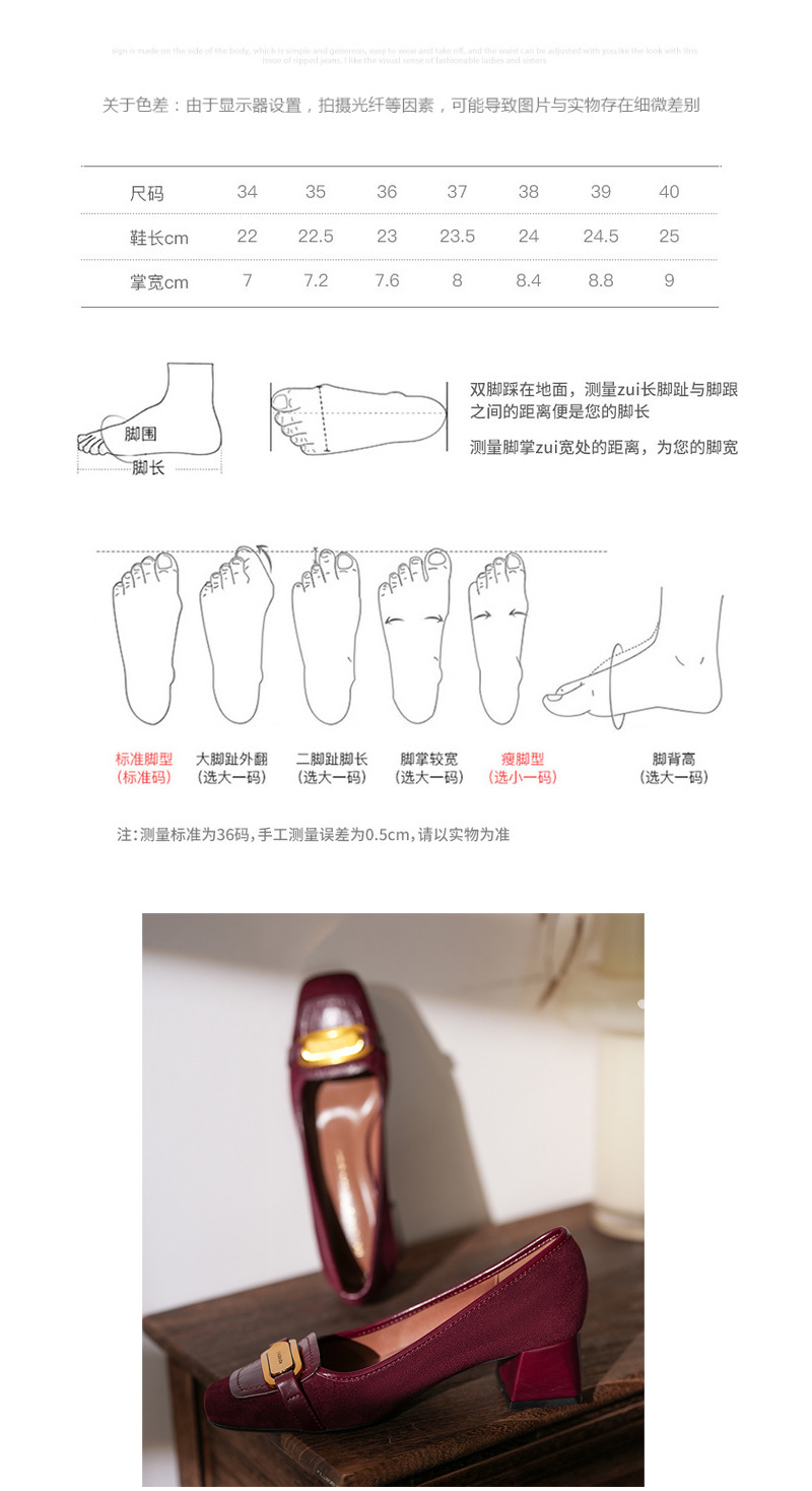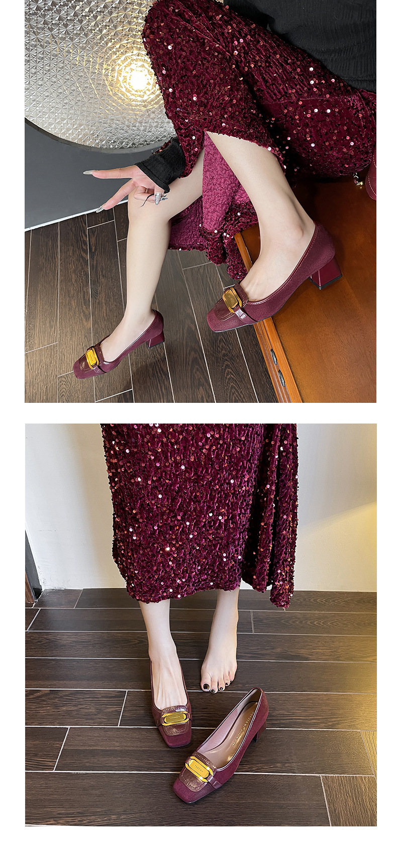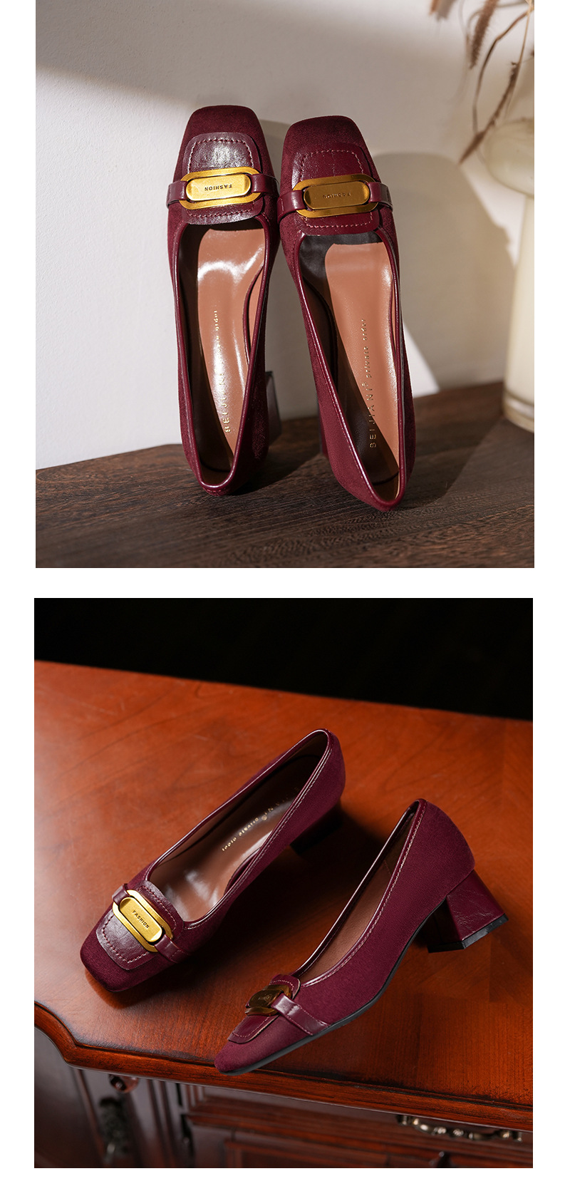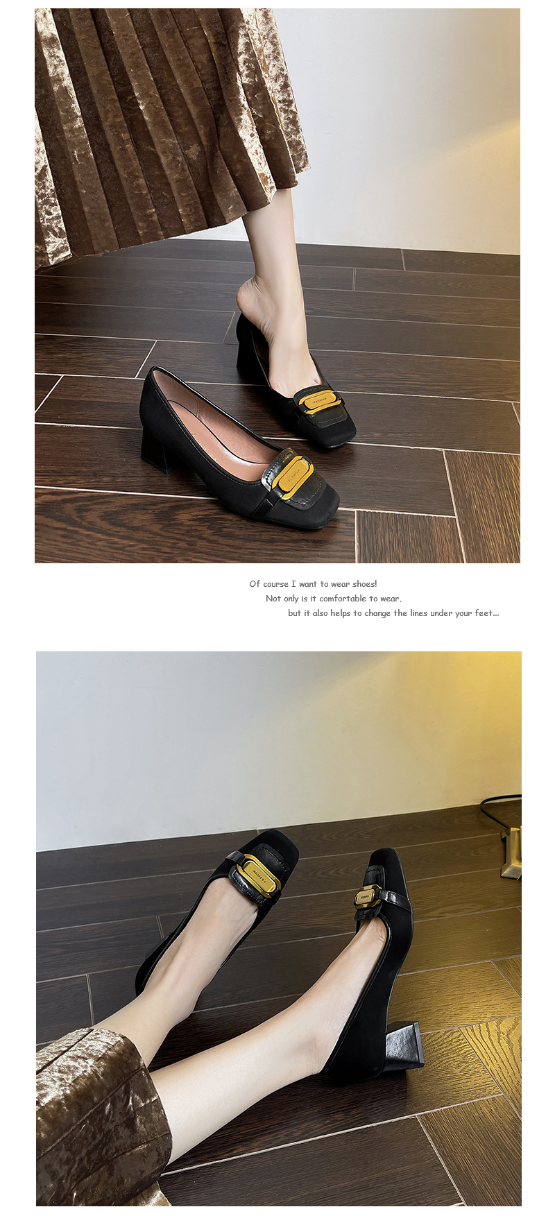 332-67 통근 양가죽 기질 4.5CM 하이힐 싱글 슈즈 여성 올 매치 스퀘어 헤드 메탈 버클 프로스트 두꺼운 힐 얕은 입