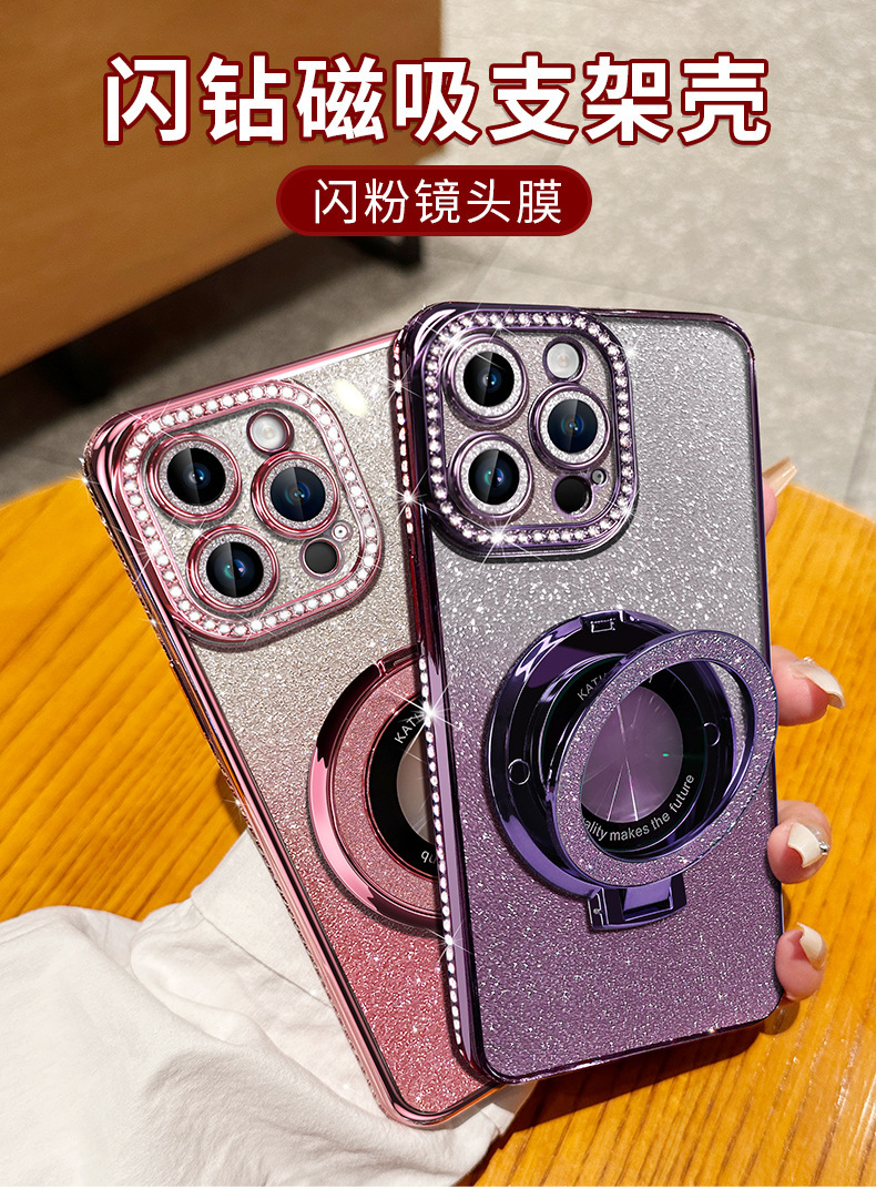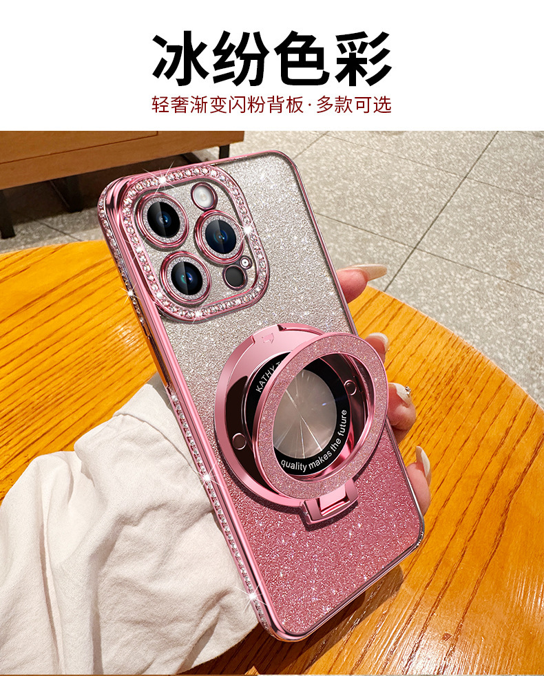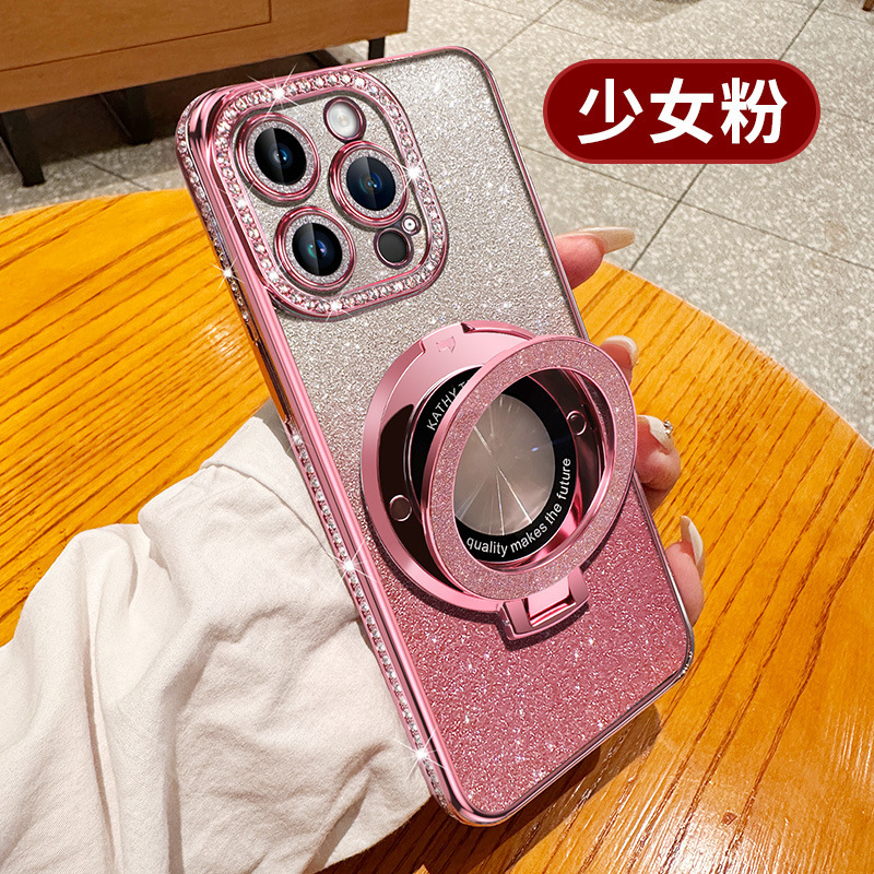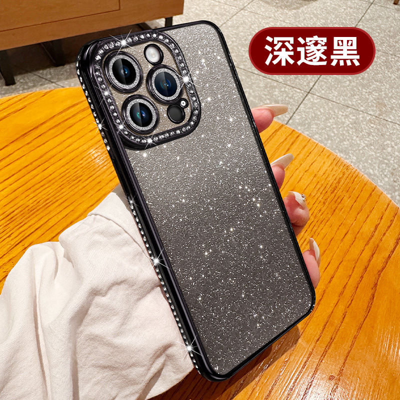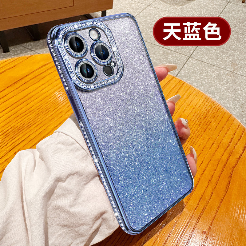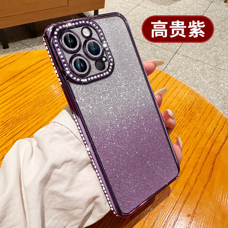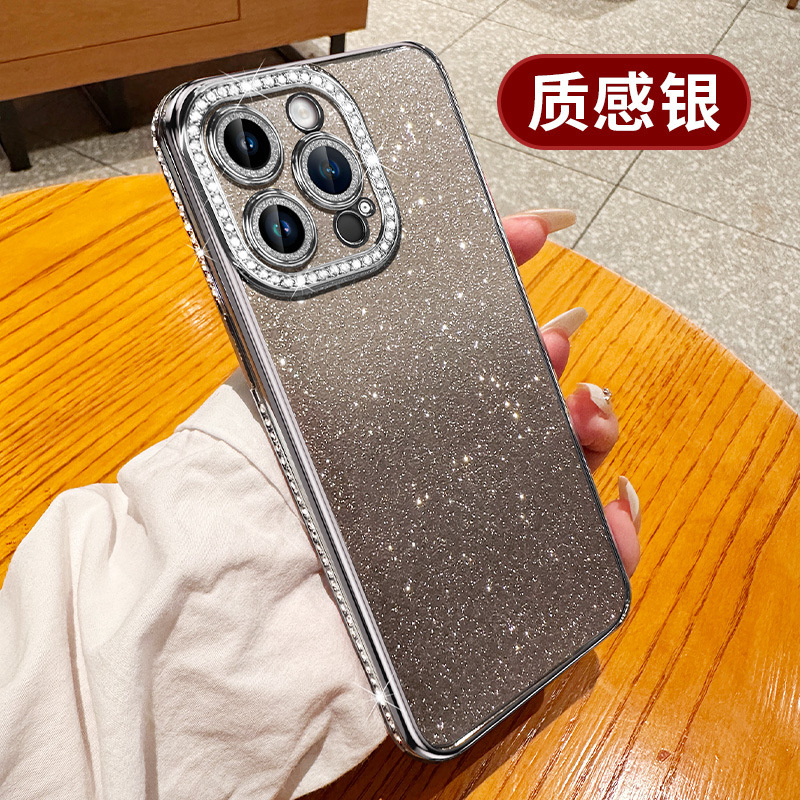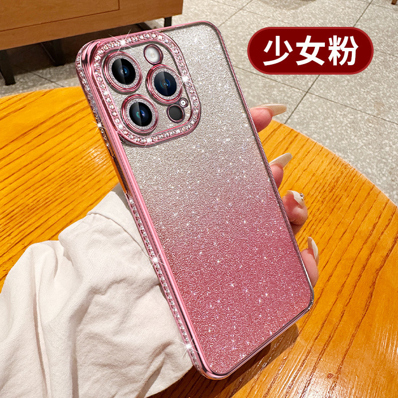 适用iPhone16边排水钻电镀手机壳苹果15pro渐变闪粉透明防摔套女