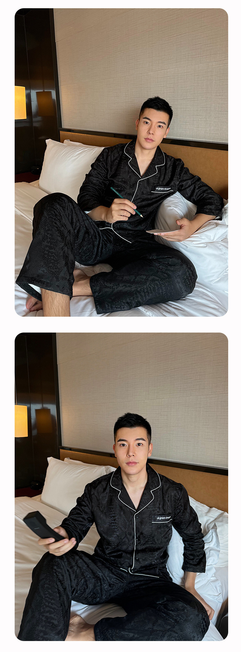 24 개의 새로운 오로라 블랙 새틴 기모 남성 커플 긴팔 바지 파자마 홈 의류 머리카락 세대스토어 가기