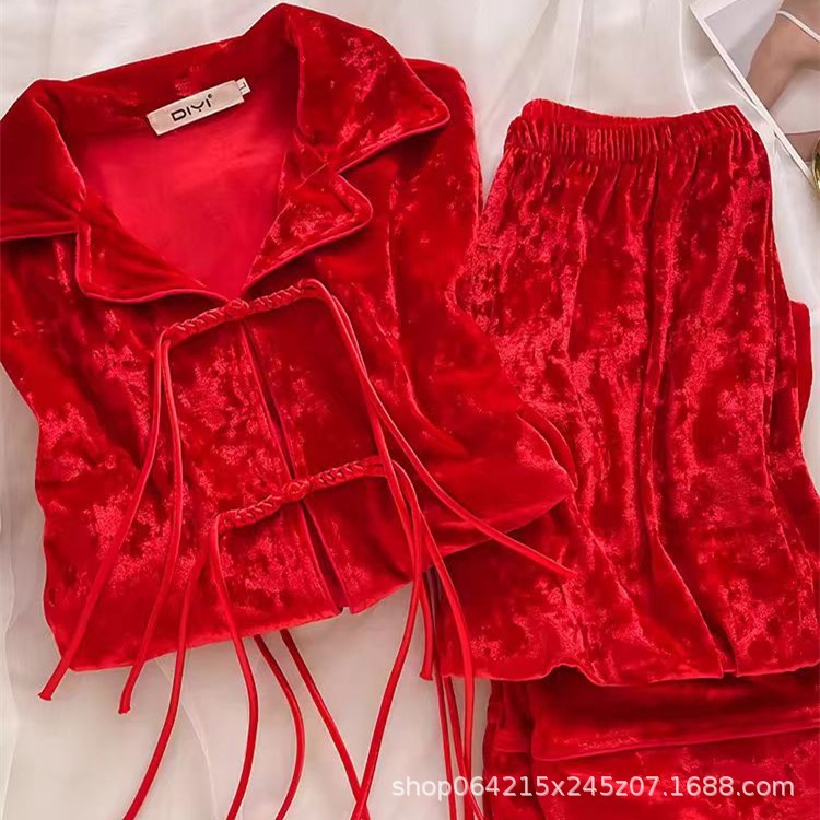 새로운 벨벳 중국 스타일 국가 스타일 달콤한 잠옷 여성의 봄 가을과 겨울 황금 벨벳 홈 의류 세트 레드 다이아몬드 벨벳 파자마