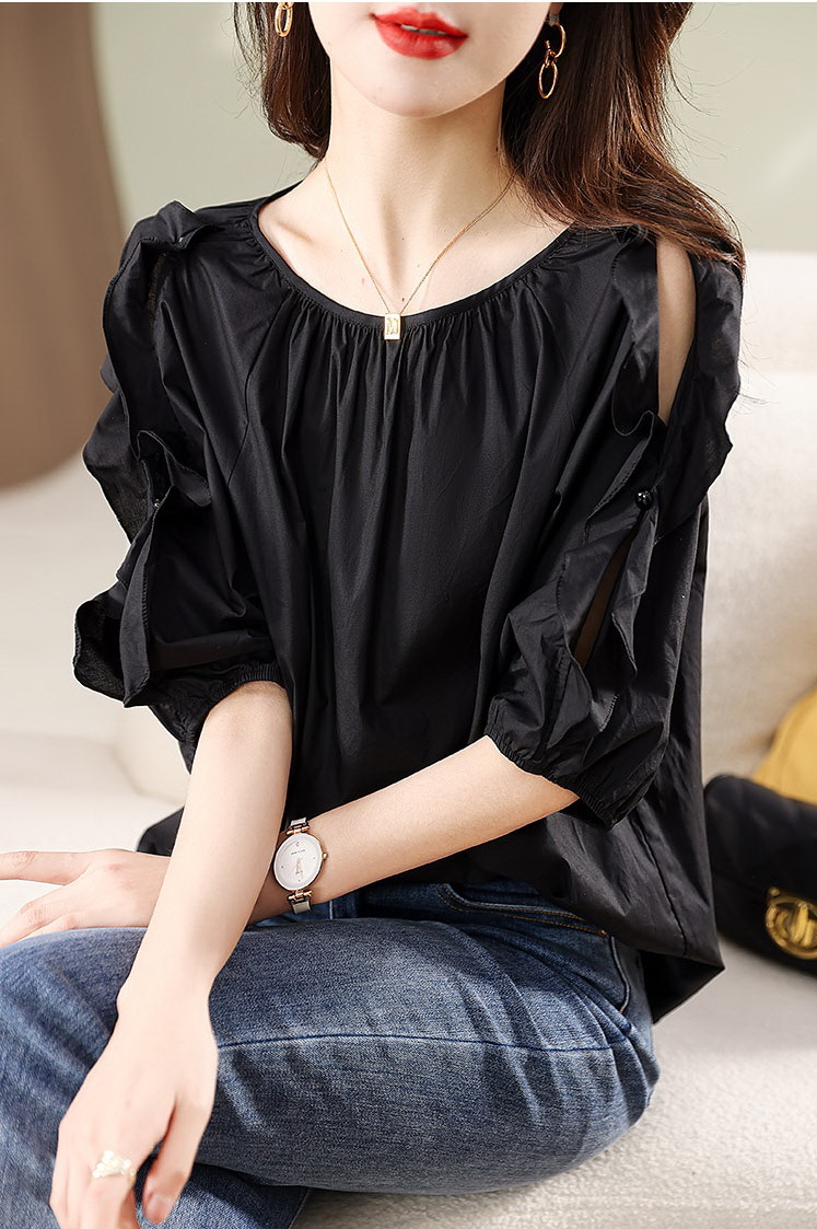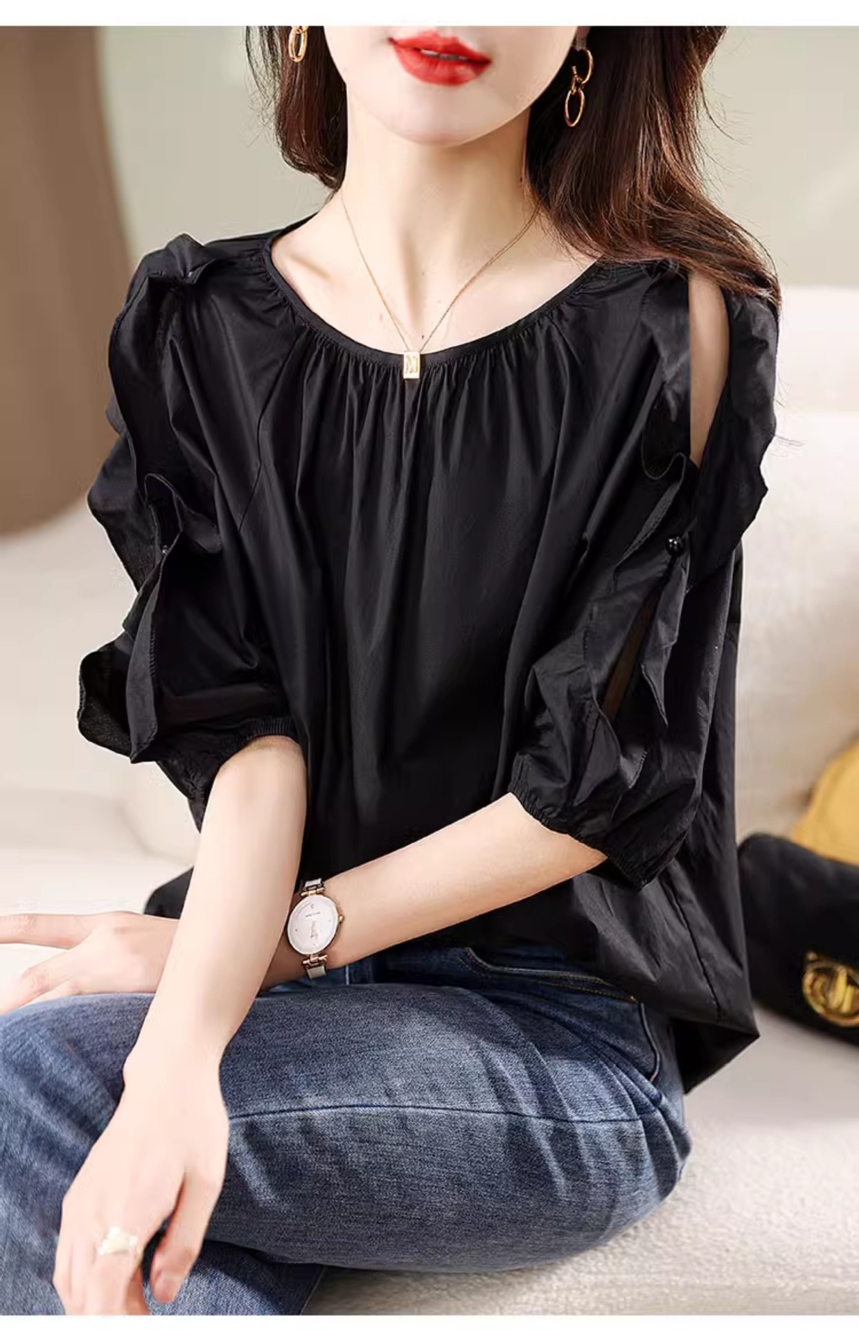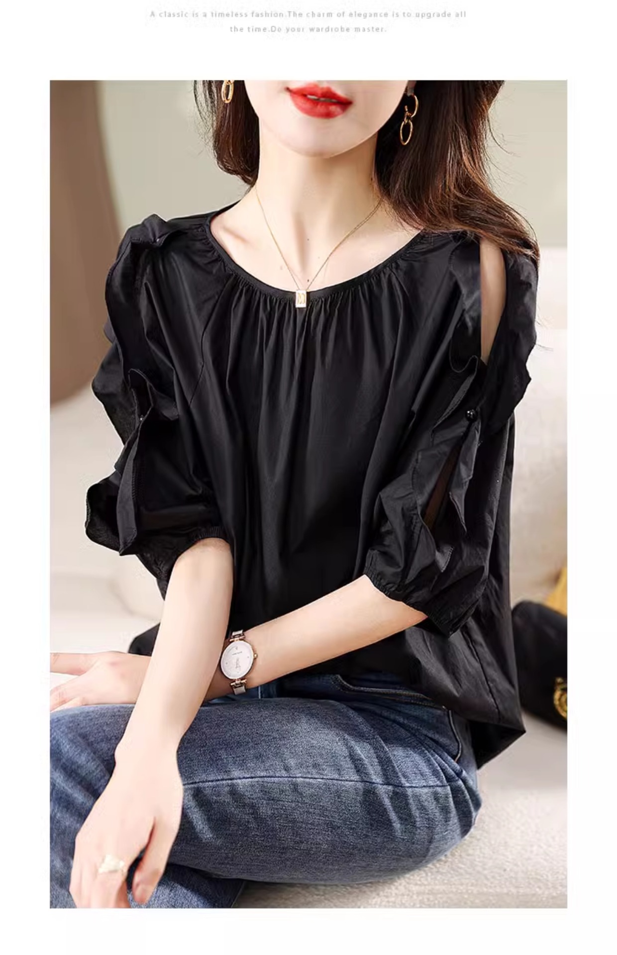 2024 프랑스 달콤한 틈새 디자인 반팔 최고 솔리드 컬러 올 매치 우아한 7 소매 느슨한 쉬폰 셔츠