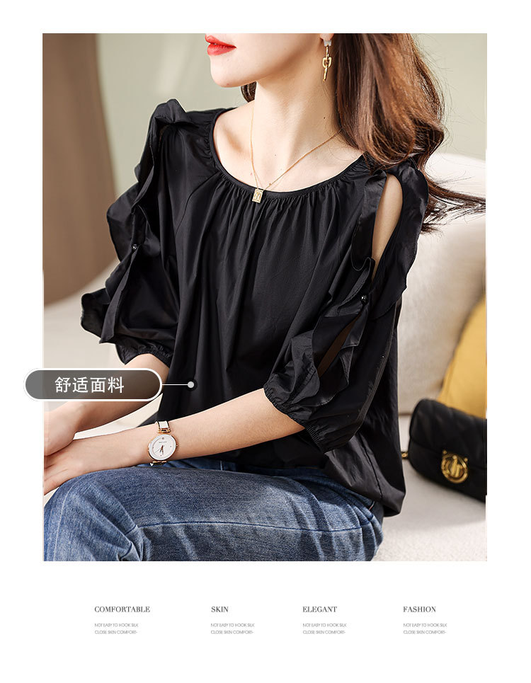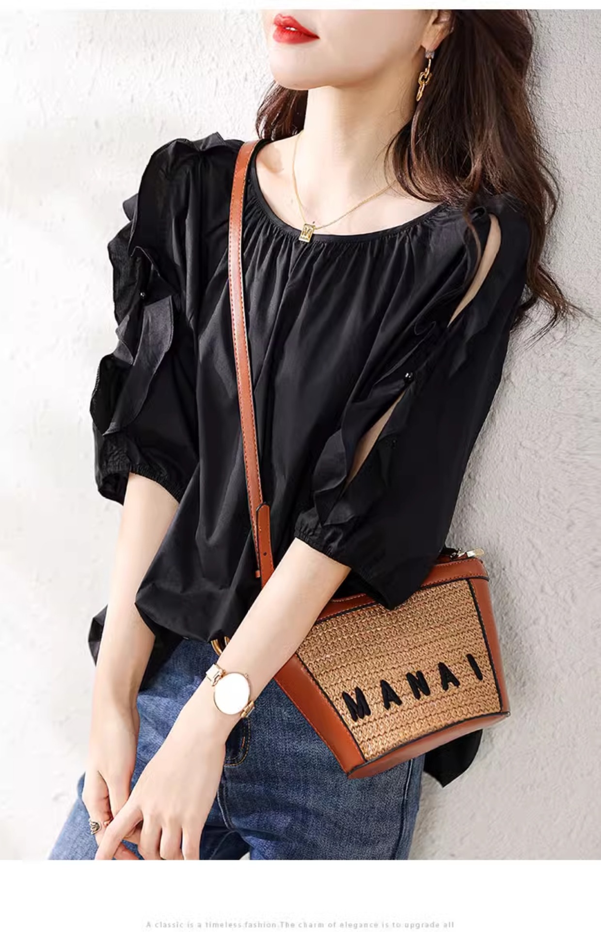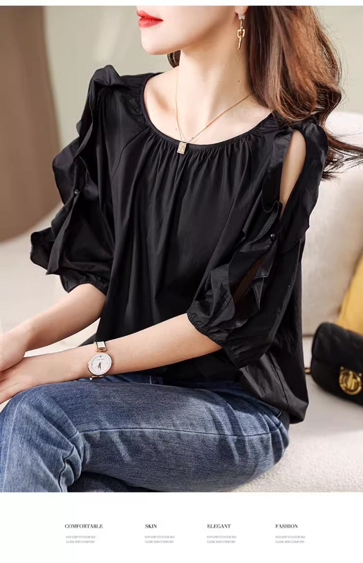 2024 프랑스 달콤한 틈새 디자인 반팔 최고 솔리드 컬러 올 매치 우아한 7 소매 느슨한 쉬폰 셔츠
