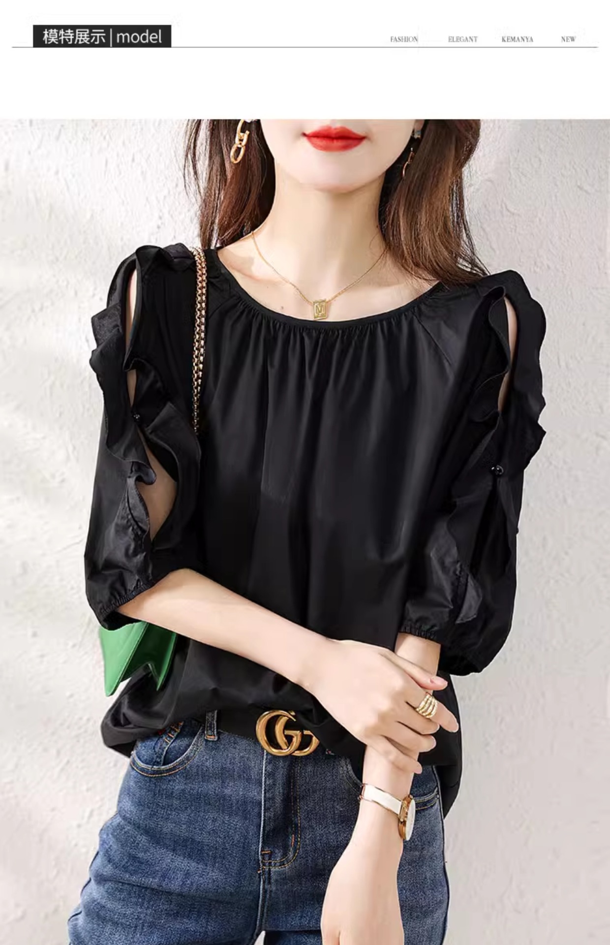 2024 프랑스 달콤한 틈새 디자인 반팔 최고 솔리드 컬러 올 매치 우아한 7 소매 느슨한 쉬폰 셔츠스토어 가기