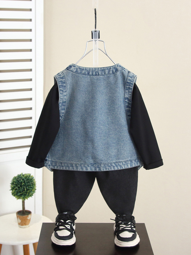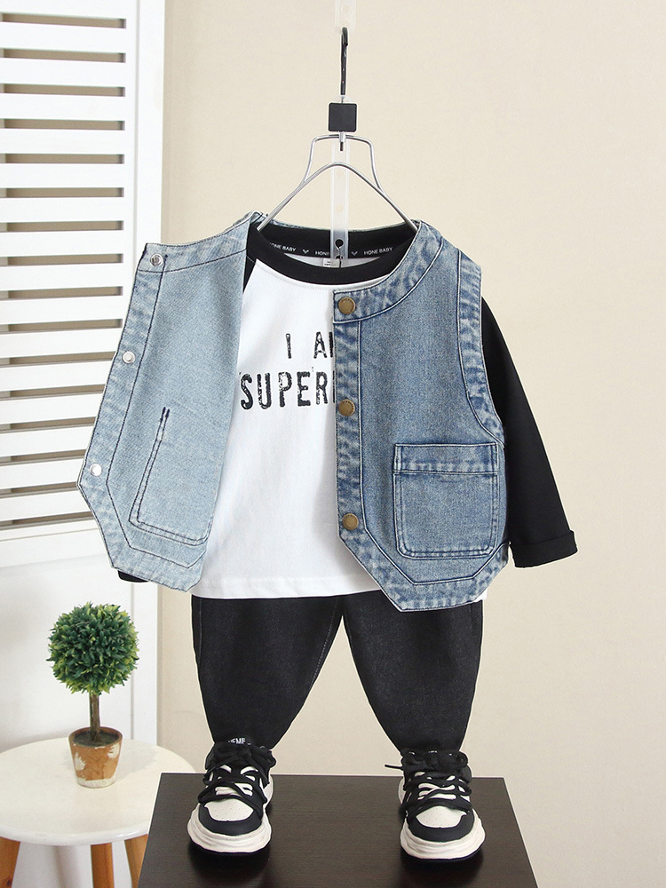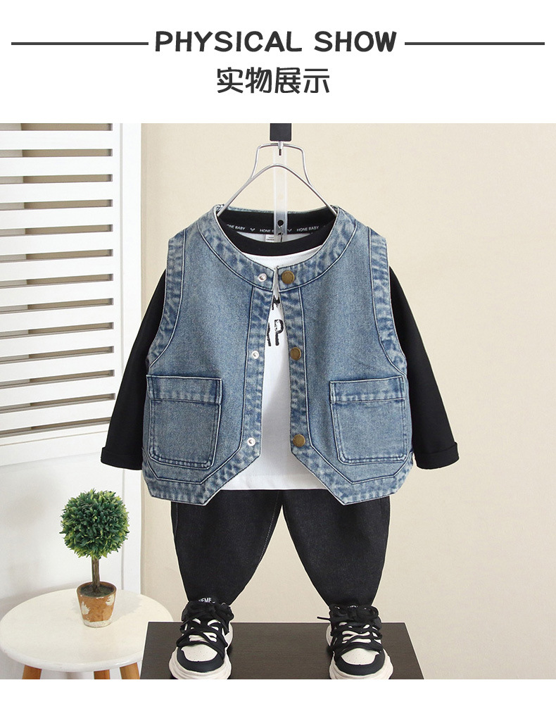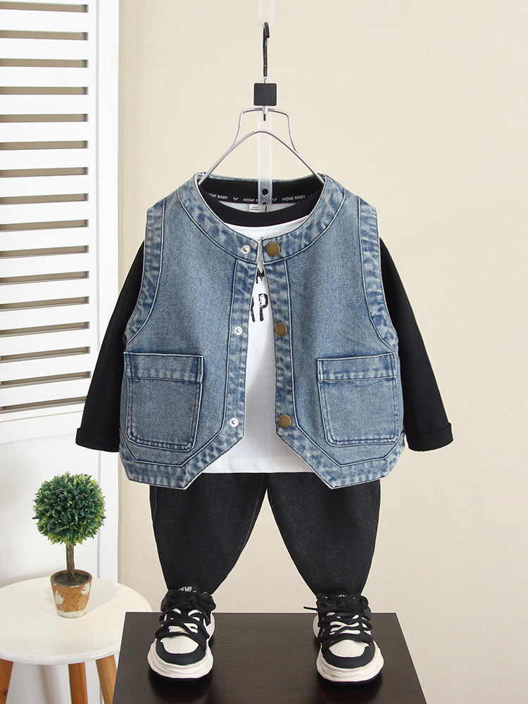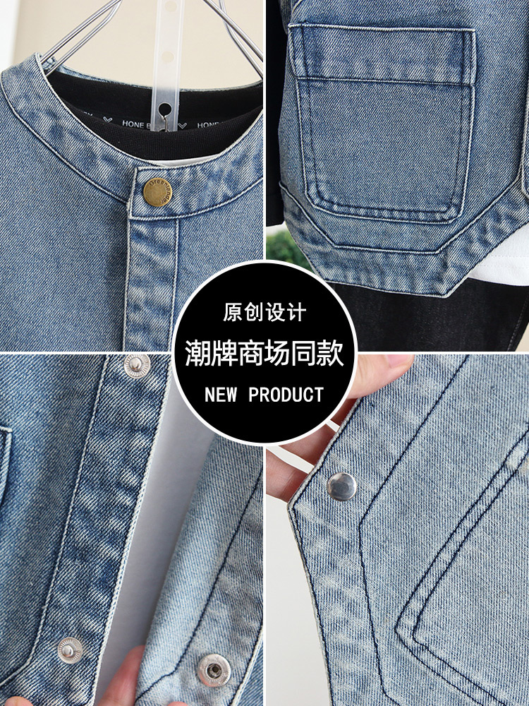 6260 소년 데님 조끼 봄과 가을 2024 새로운 어린이 유행 잘 생긴 외부 조끼 아기 가을 탑 착용