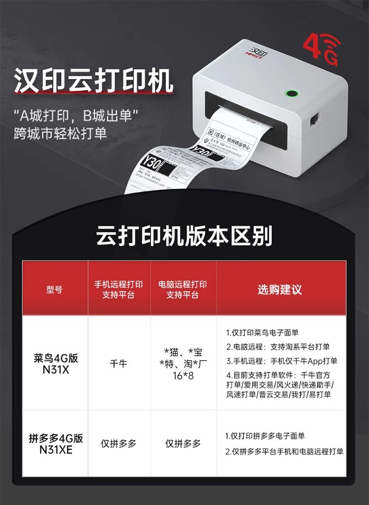 한음 N31X 익스프레스 클라우드 프린터 Cainiao Duoduo 익스프레스 단일 열 라벨 4g 원격 단일 기계