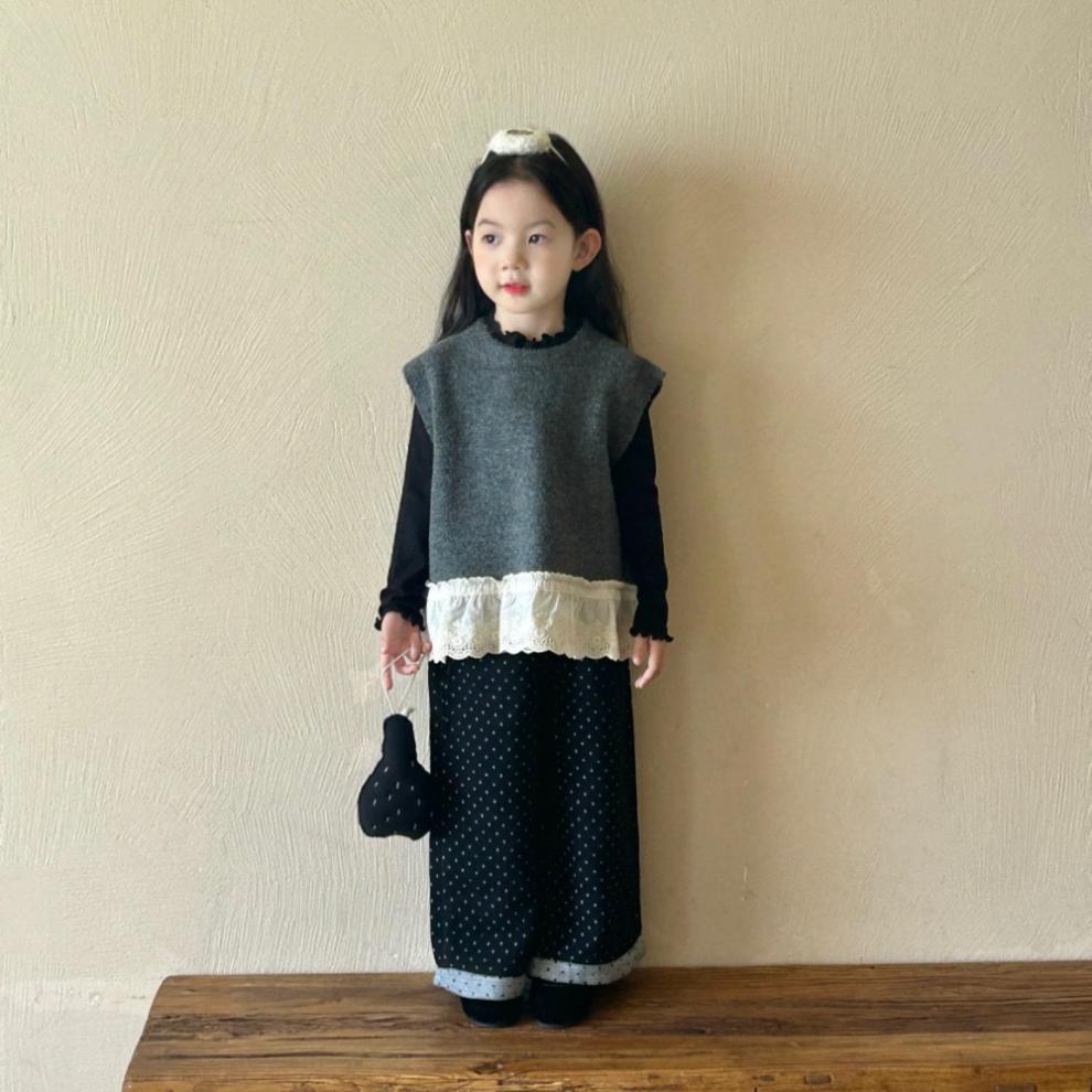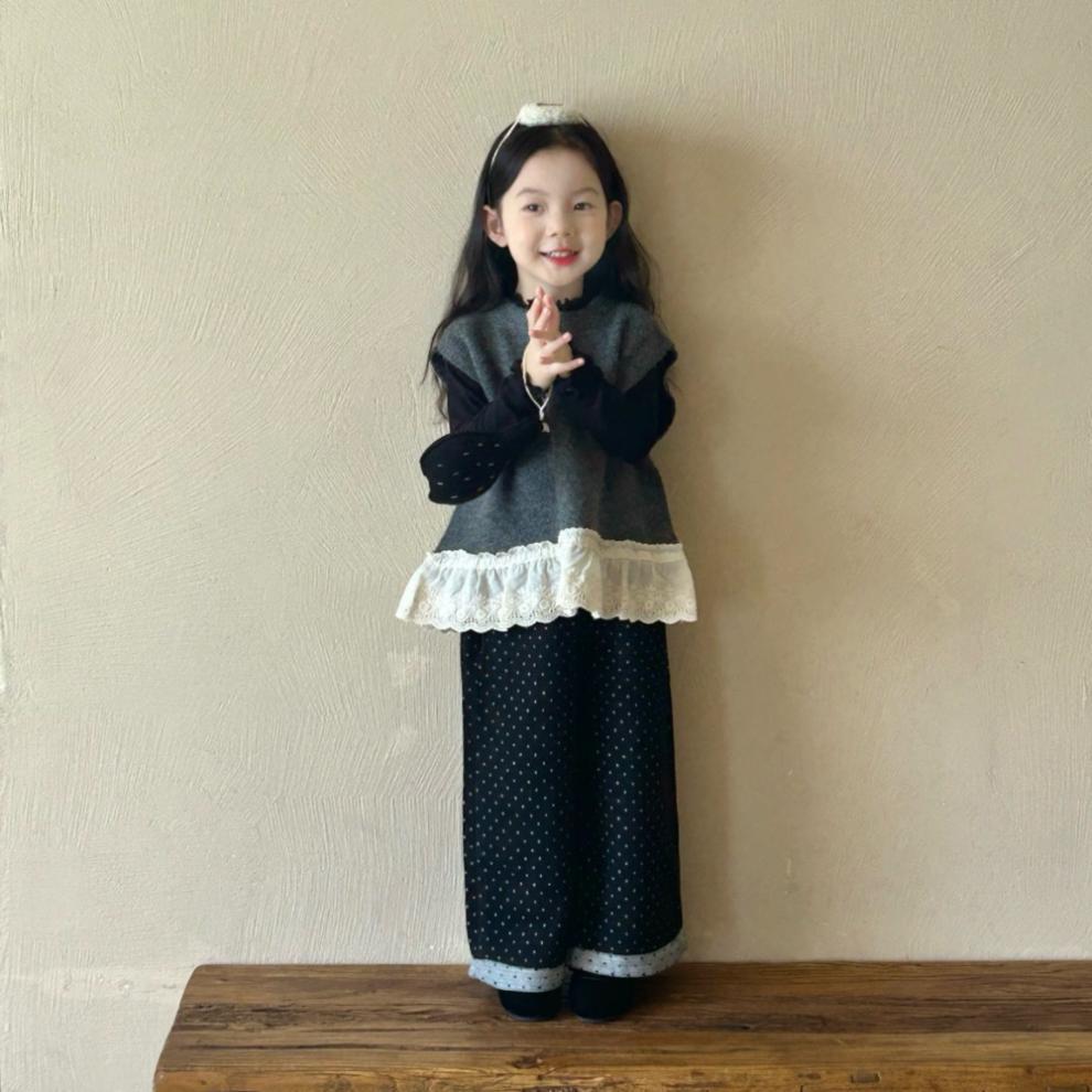 소녀 세트 2024 가을 의류 아기 소녀의 레이스 조끼 베이스 셔츠 웨이브 포인트 넓은 다리 바지 3 조각 세트