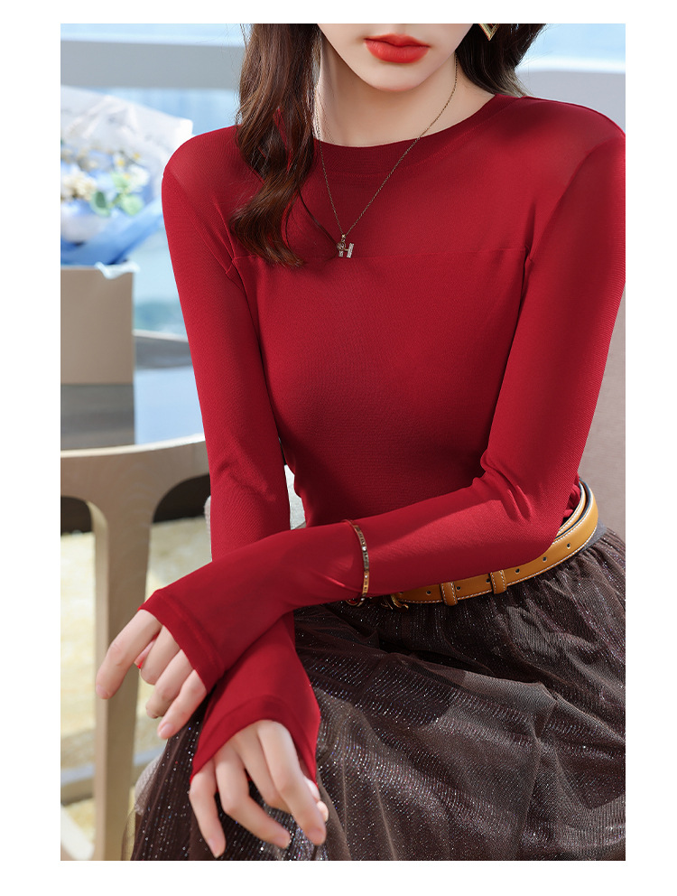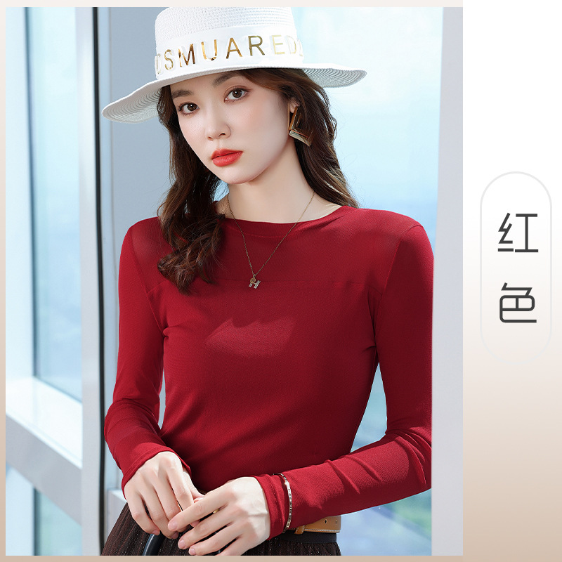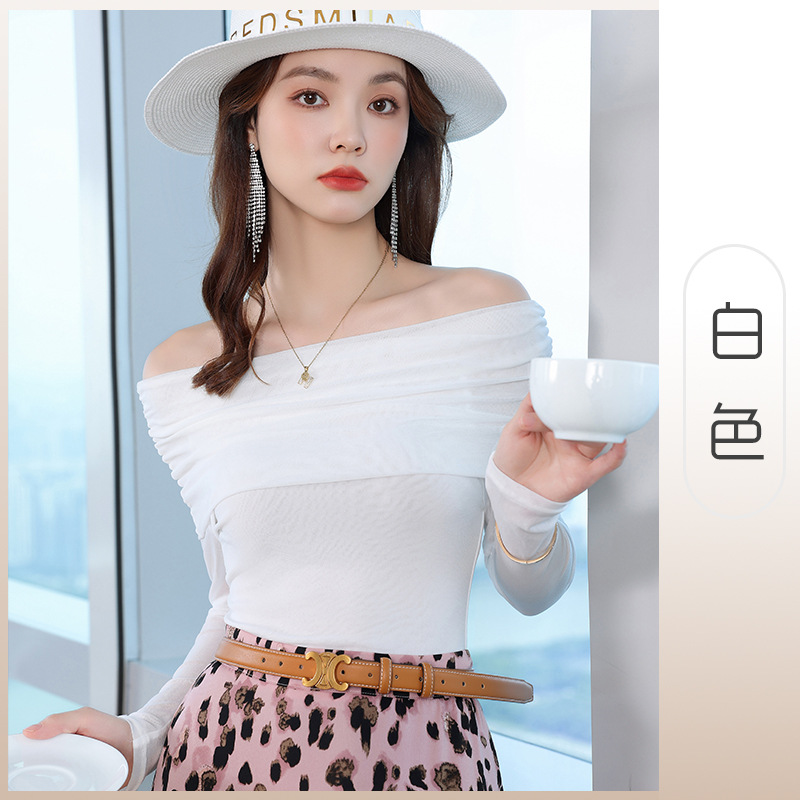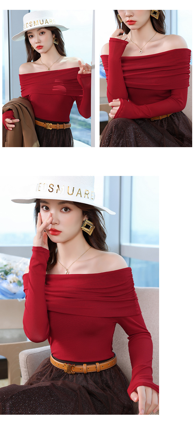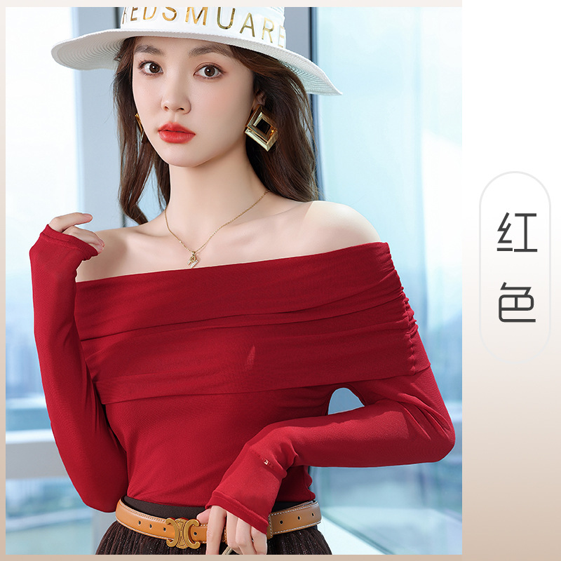 세븐 밸리 니앙 가을과 겨울 레드 탑 여자 하이 엔드 슬랜트 숄더 오프 숄더 긴팔 티셔츠 슬림 핏 짧은베이스 셔츠 트렌디