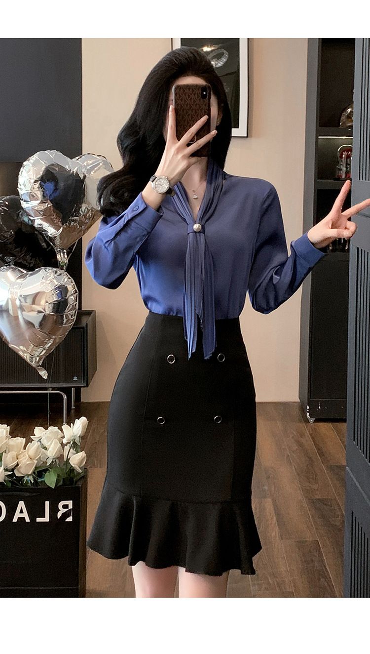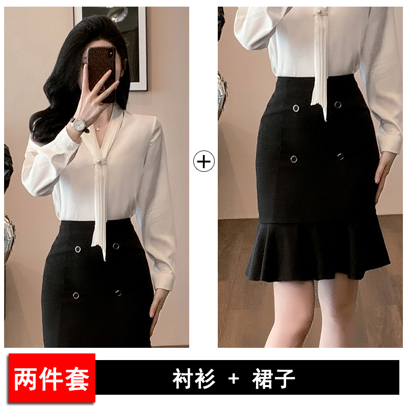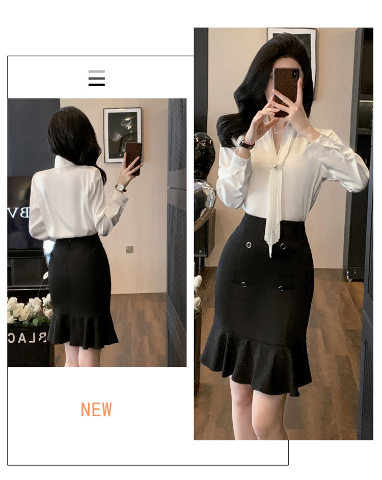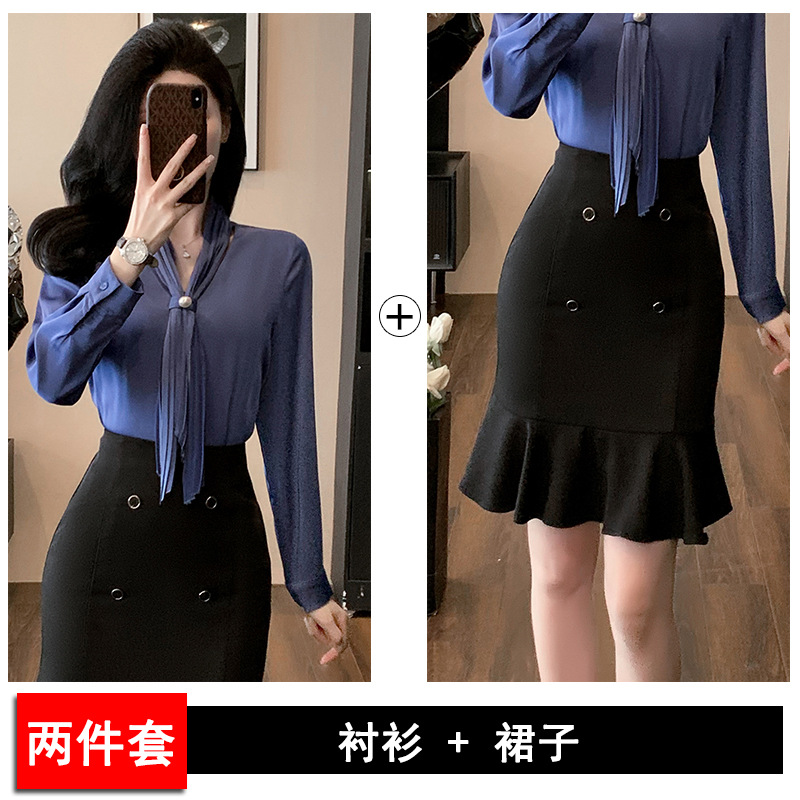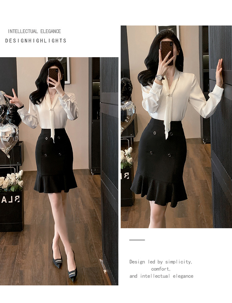 여성 스커트 봄과 가을 2024 새로운 우아한 러플 두꺼운 엉덩이 스커트 피쉬 스커트 긴 소매 셔츠 세트