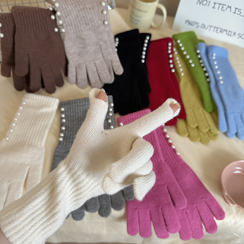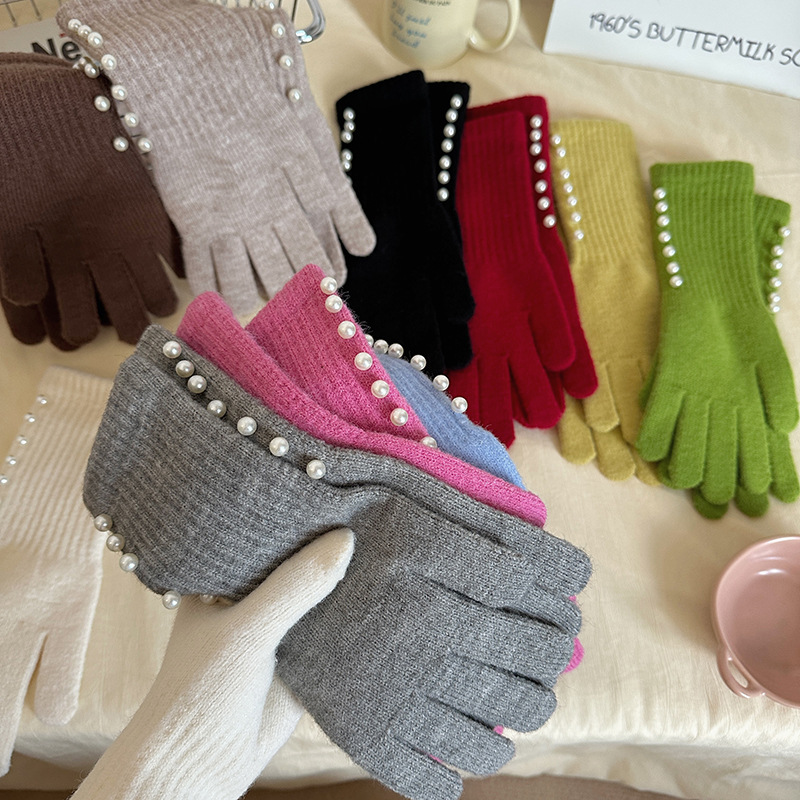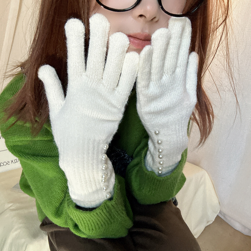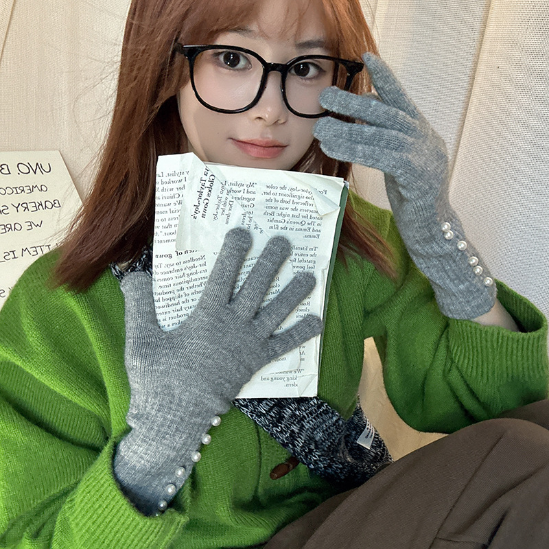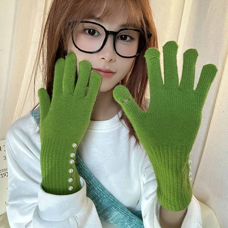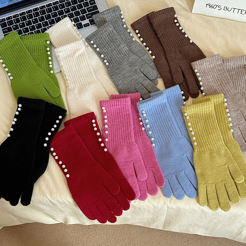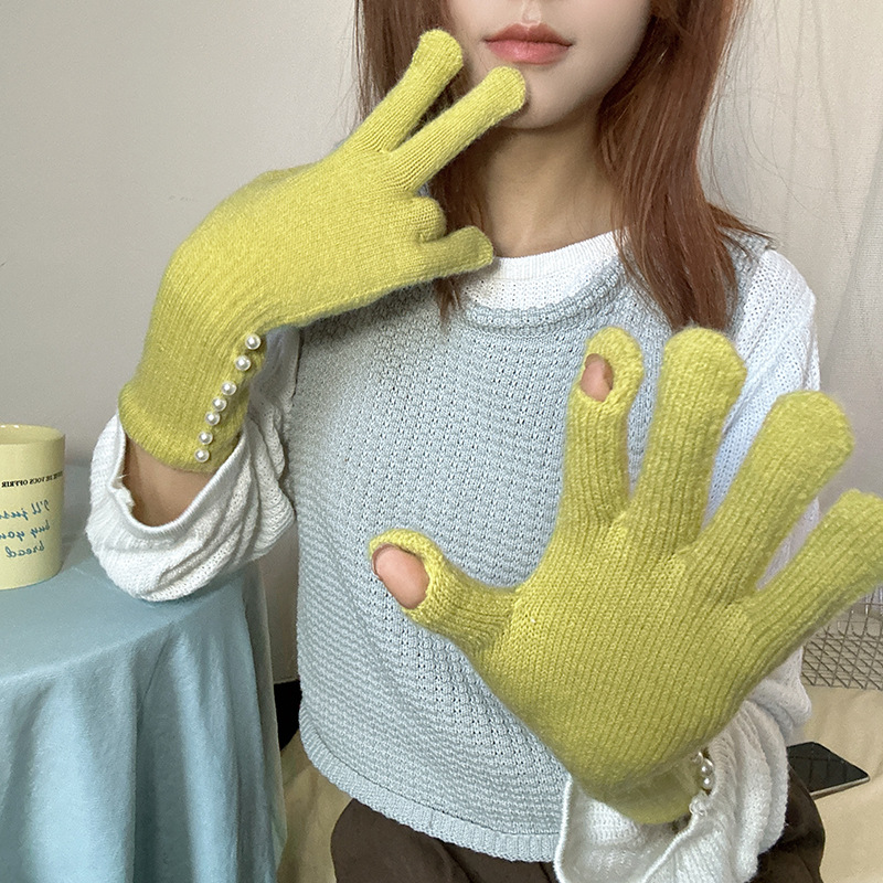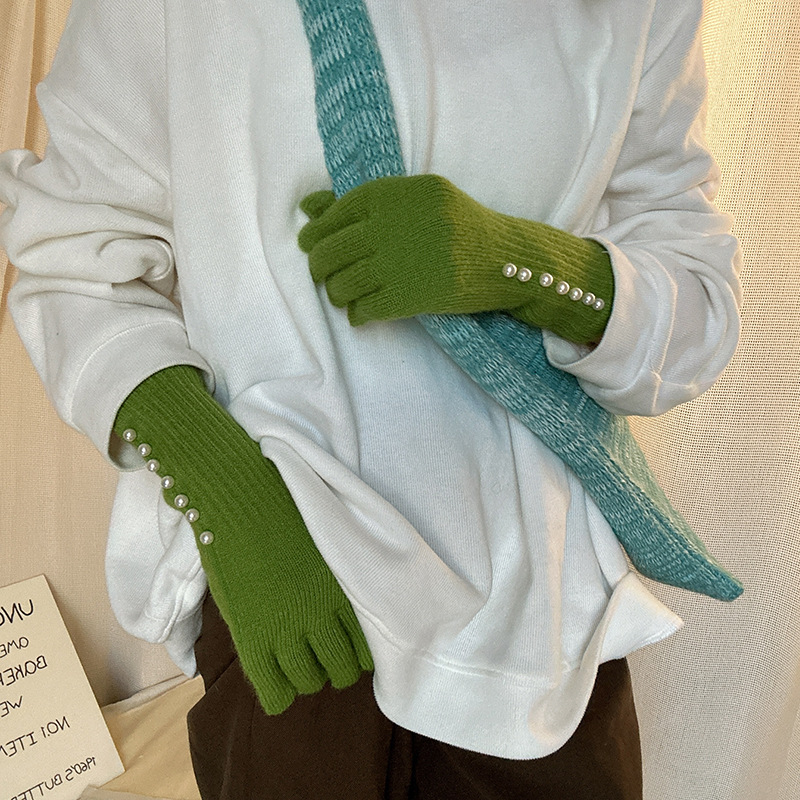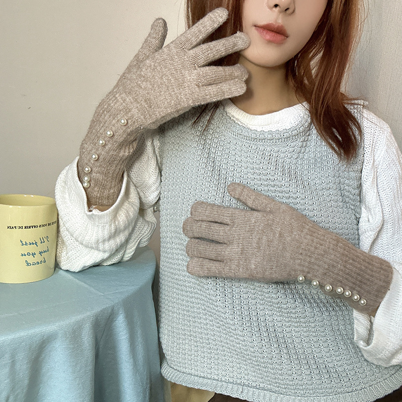 내부 빛 ~ 작은 진주 니트 장갑 여성의 단색 7 5 손가락 두꺼운 따뜻한 엑스트라 핑거 터치 스크린 울 가을과 겨울