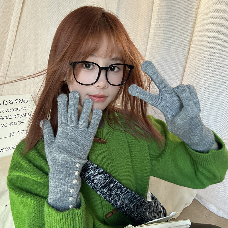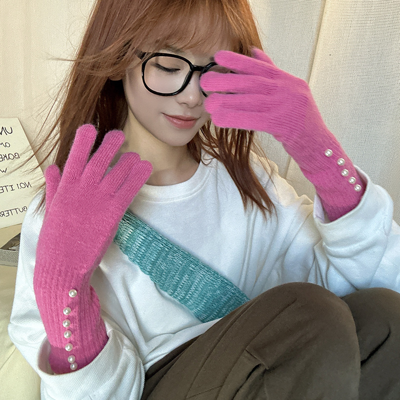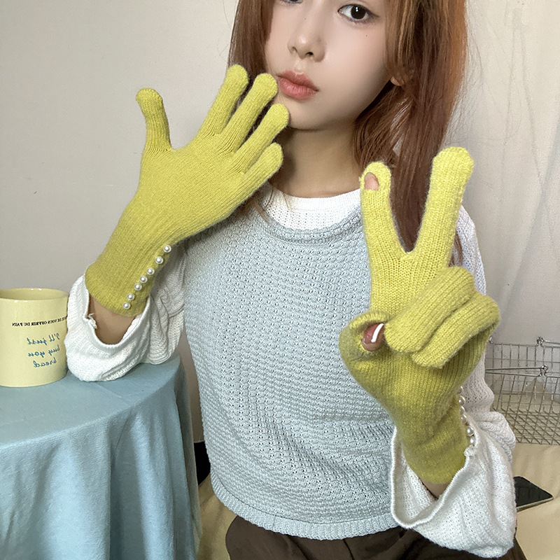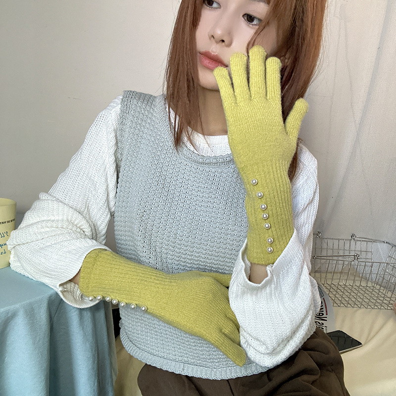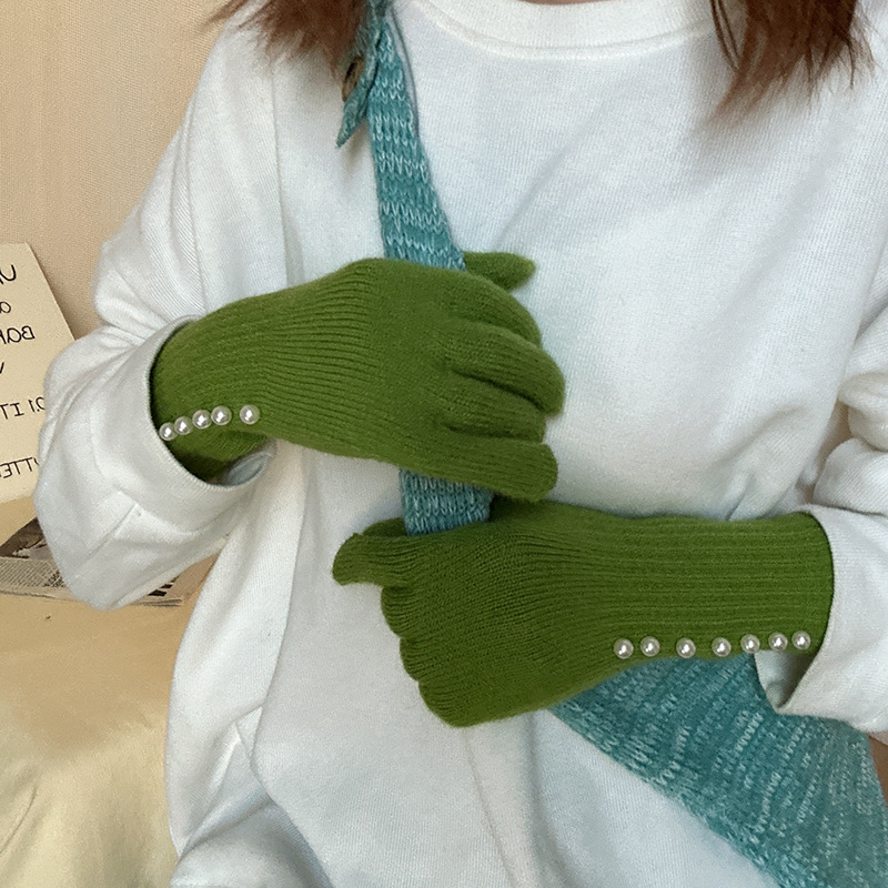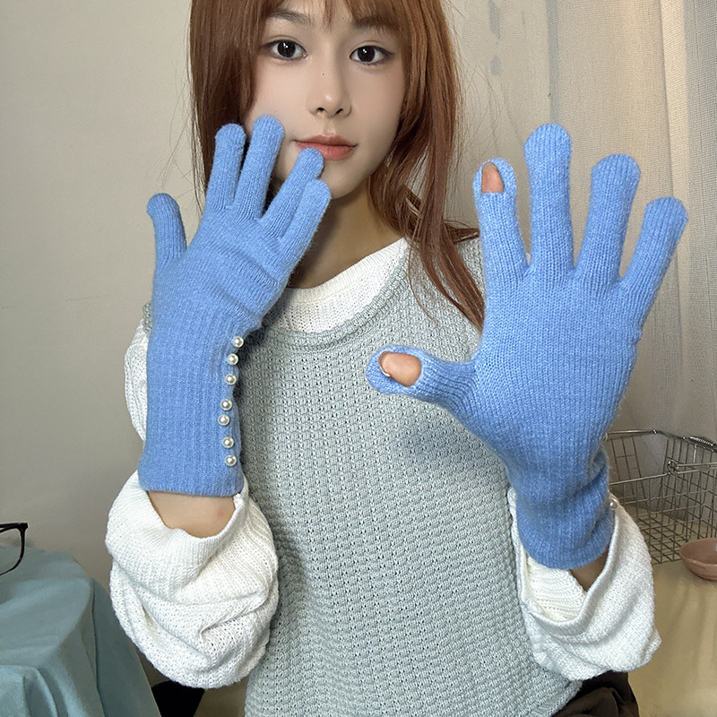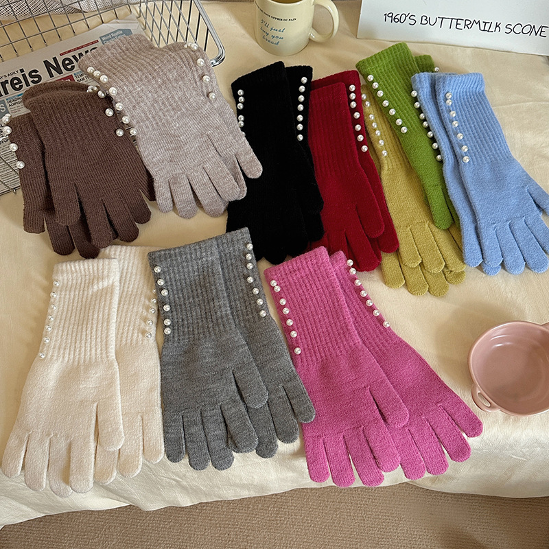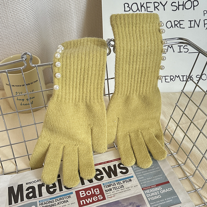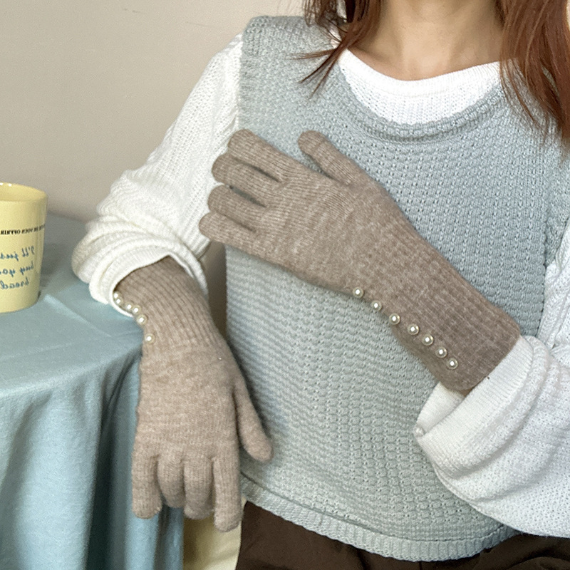 내부 빛 ~ 작은 진주 니트 장갑 여성의 단색 7 5 손가락 두꺼운 따뜻한 엑스트라 핑거 터치 스크린 울 가을과 겨울