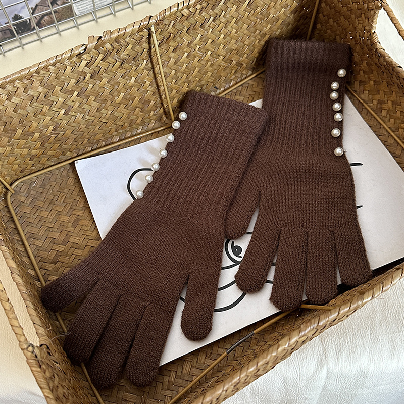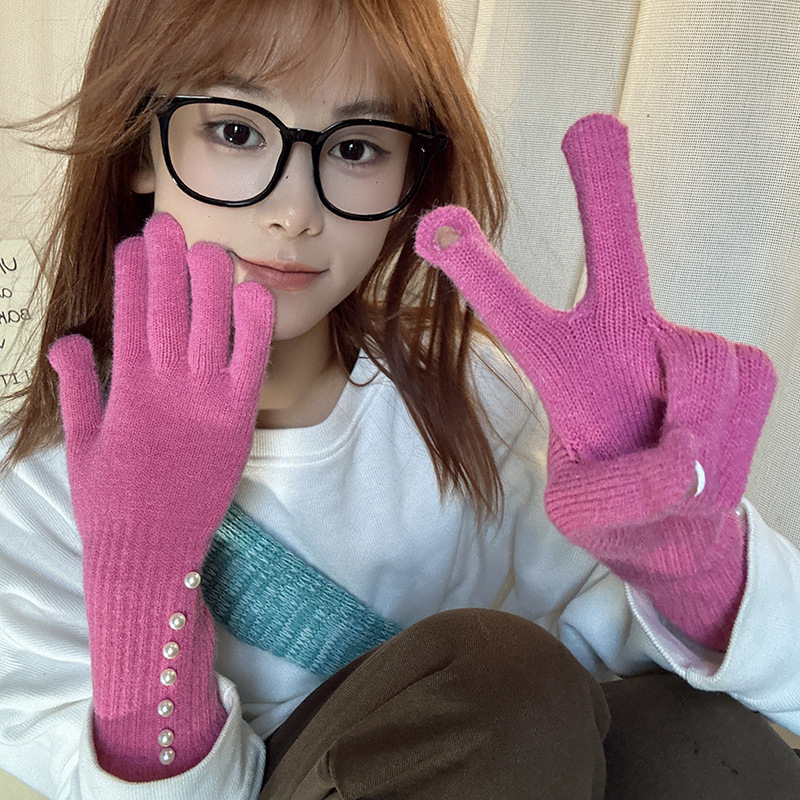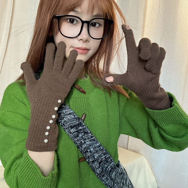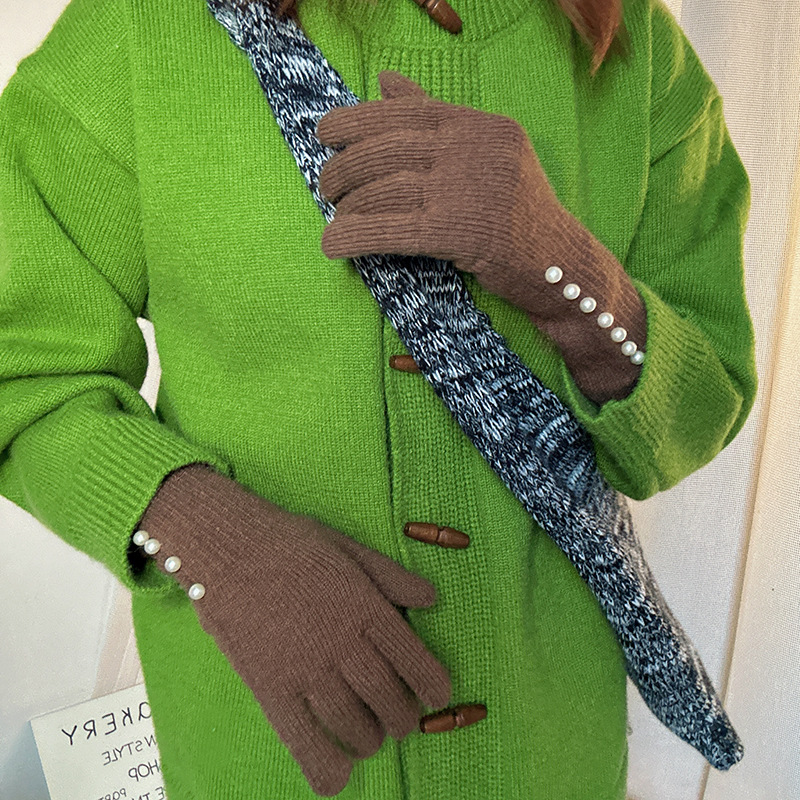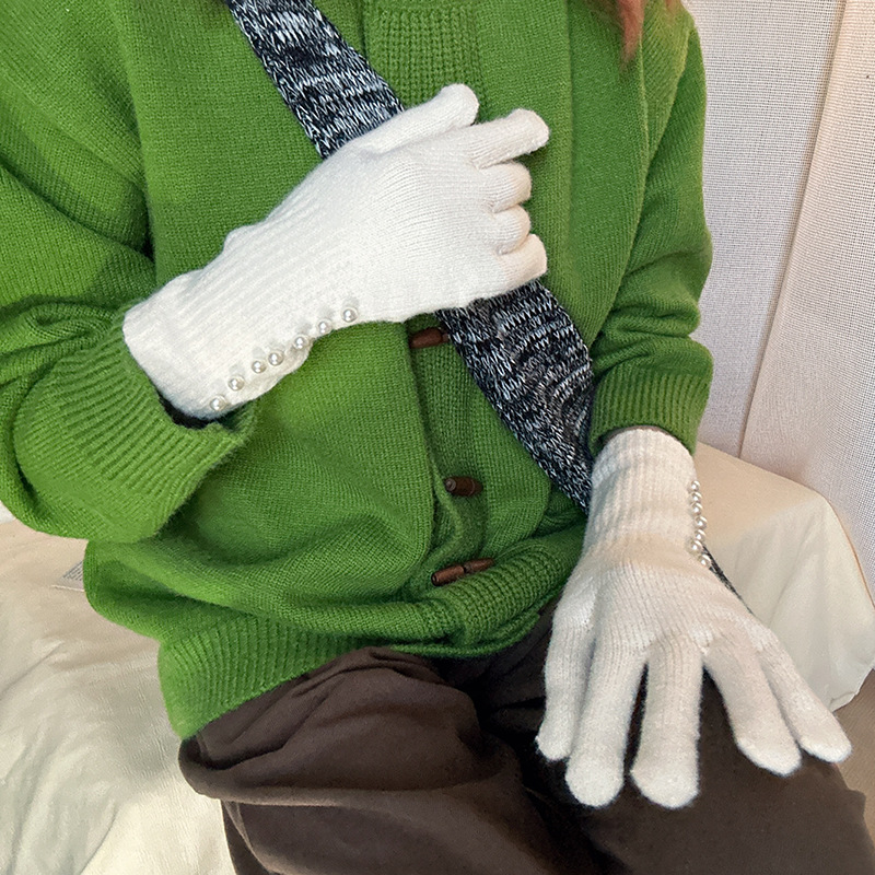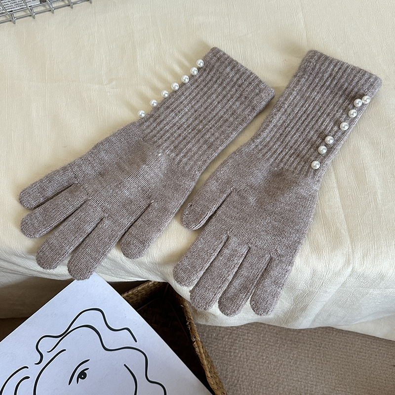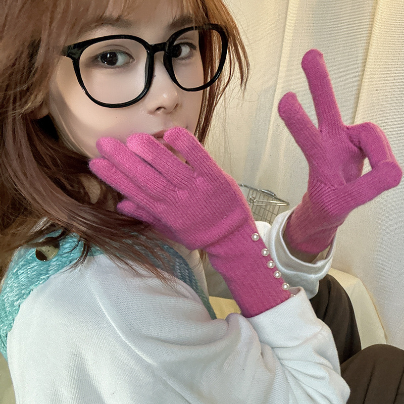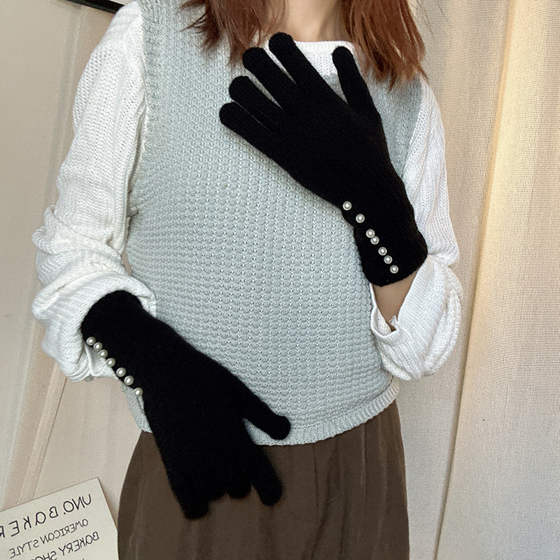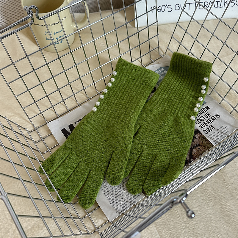내부 빛 ~ 작은 진주 니트 장갑 여성의 단색 7 5 손가락 두꺼운 따뜻한 엑스트라 핑거 터치 스크린 울 가을과 겨울
