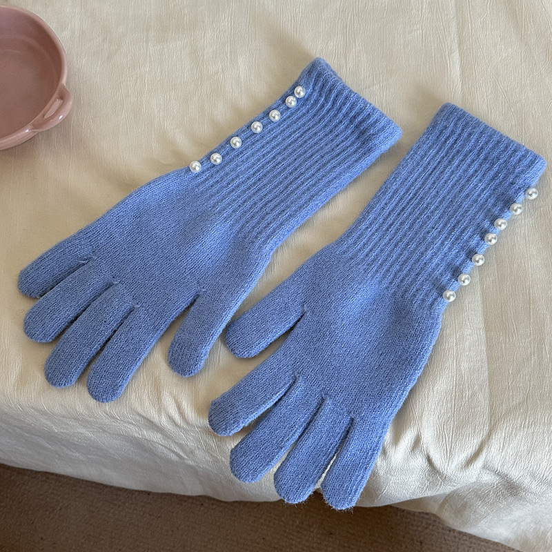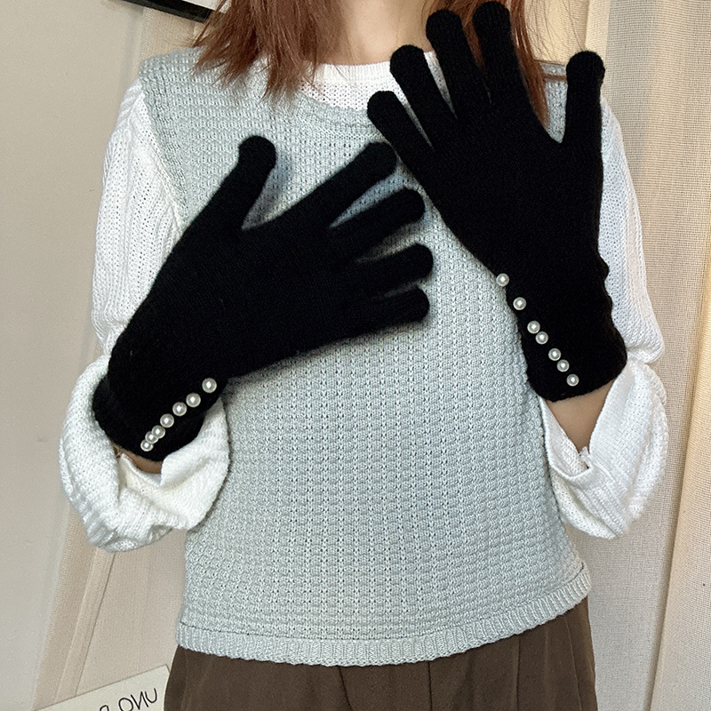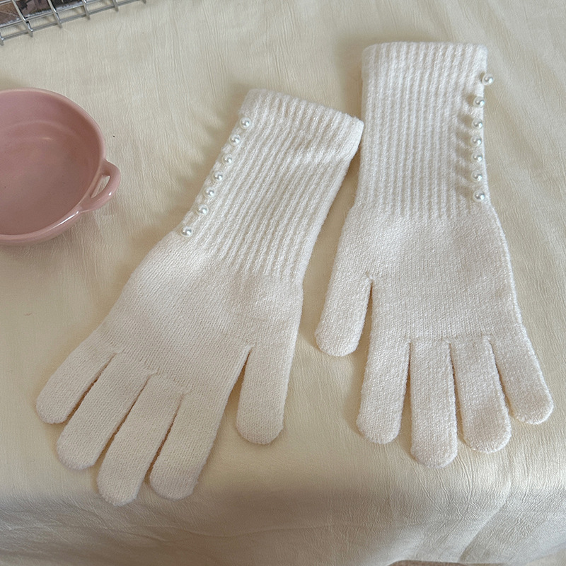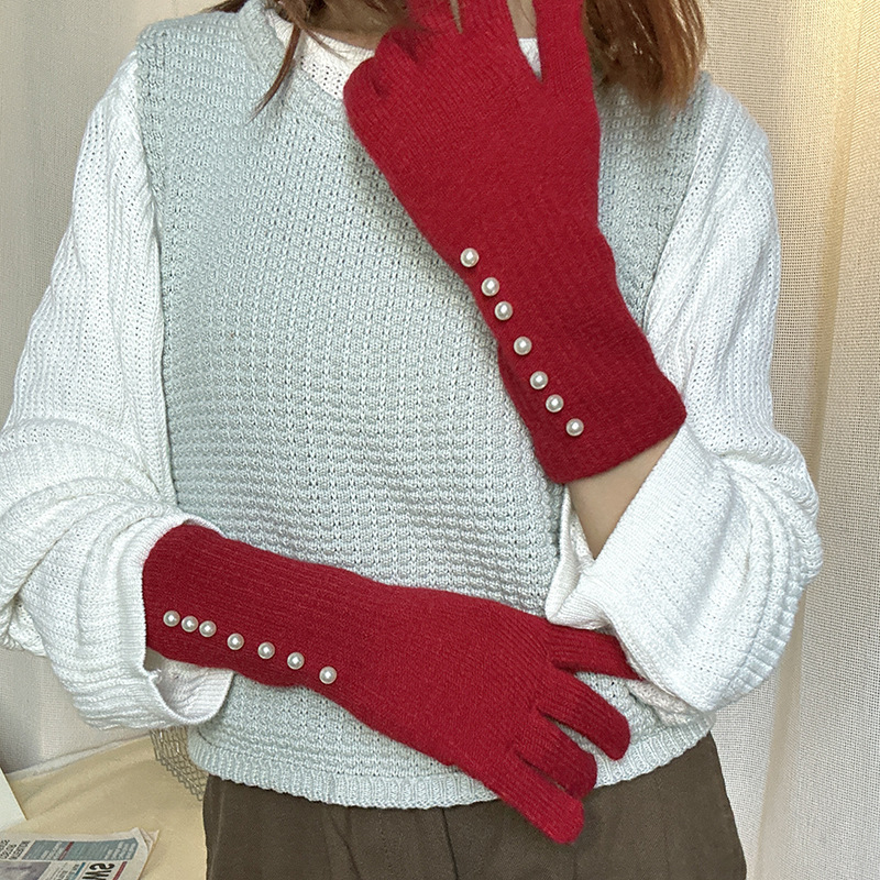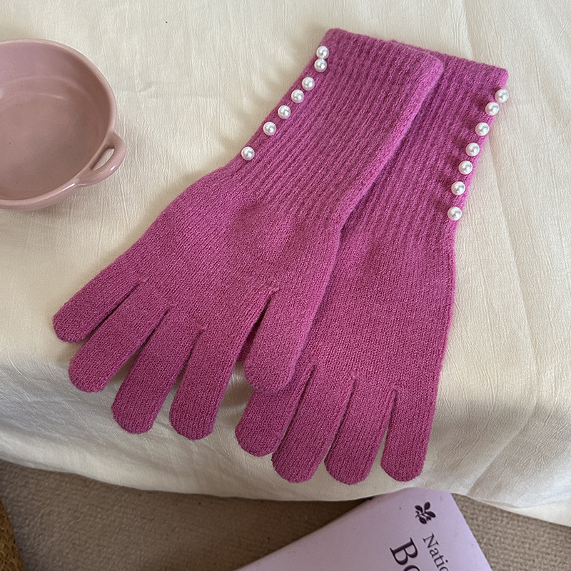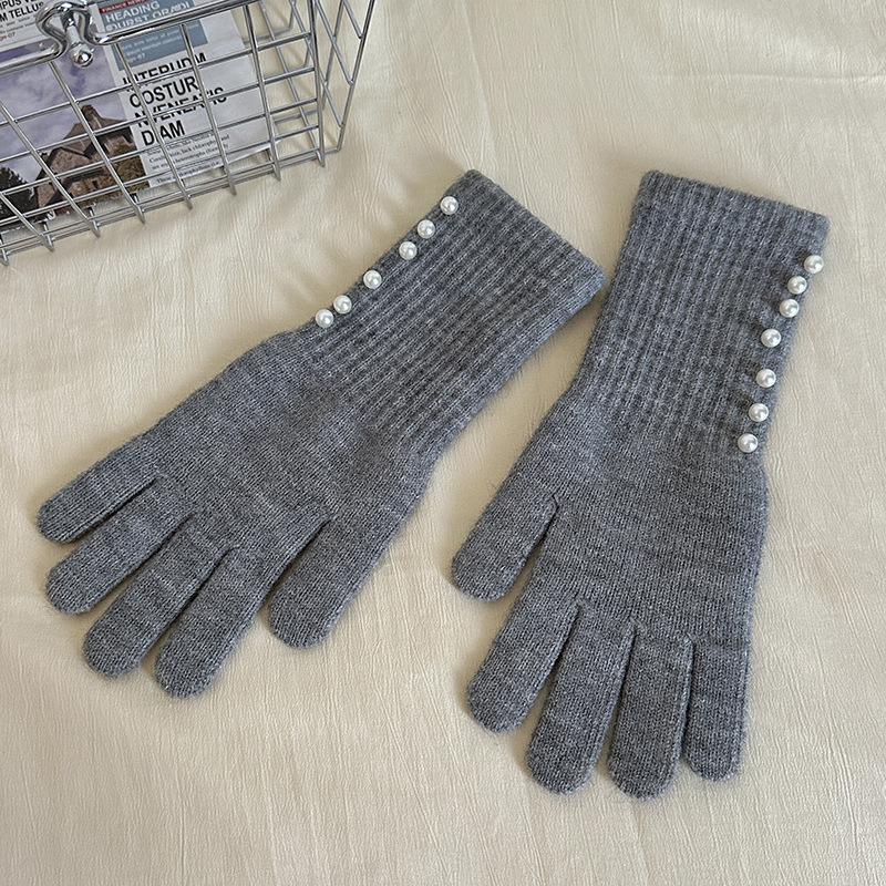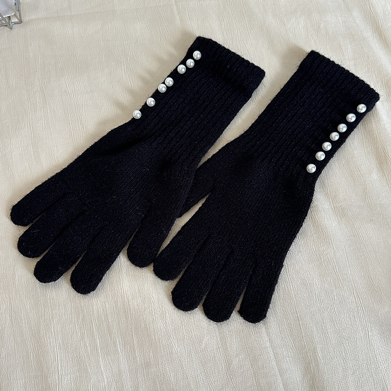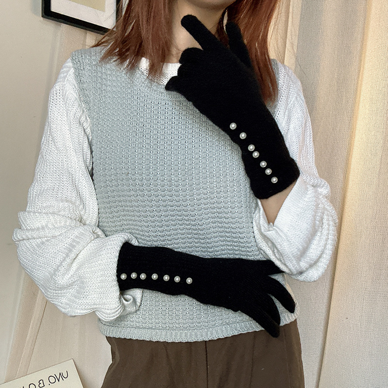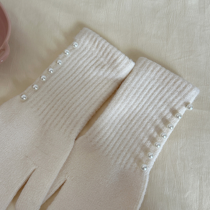 내부 빛 ~ 작은 진주 니트 장갑 여성의 단색 7 5 손가락 두꺼운 따뜻한 엑스트라 핑거 터치 스크린 울 가을과 겨울