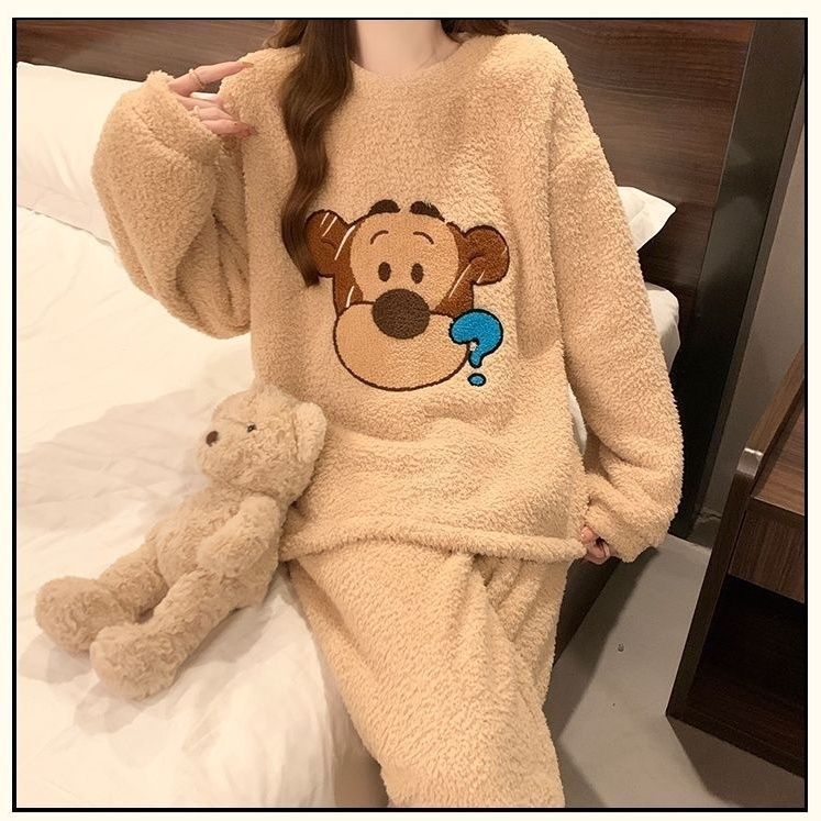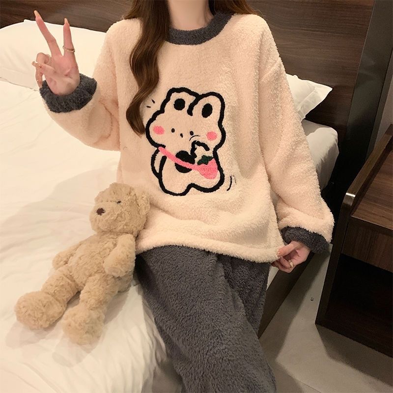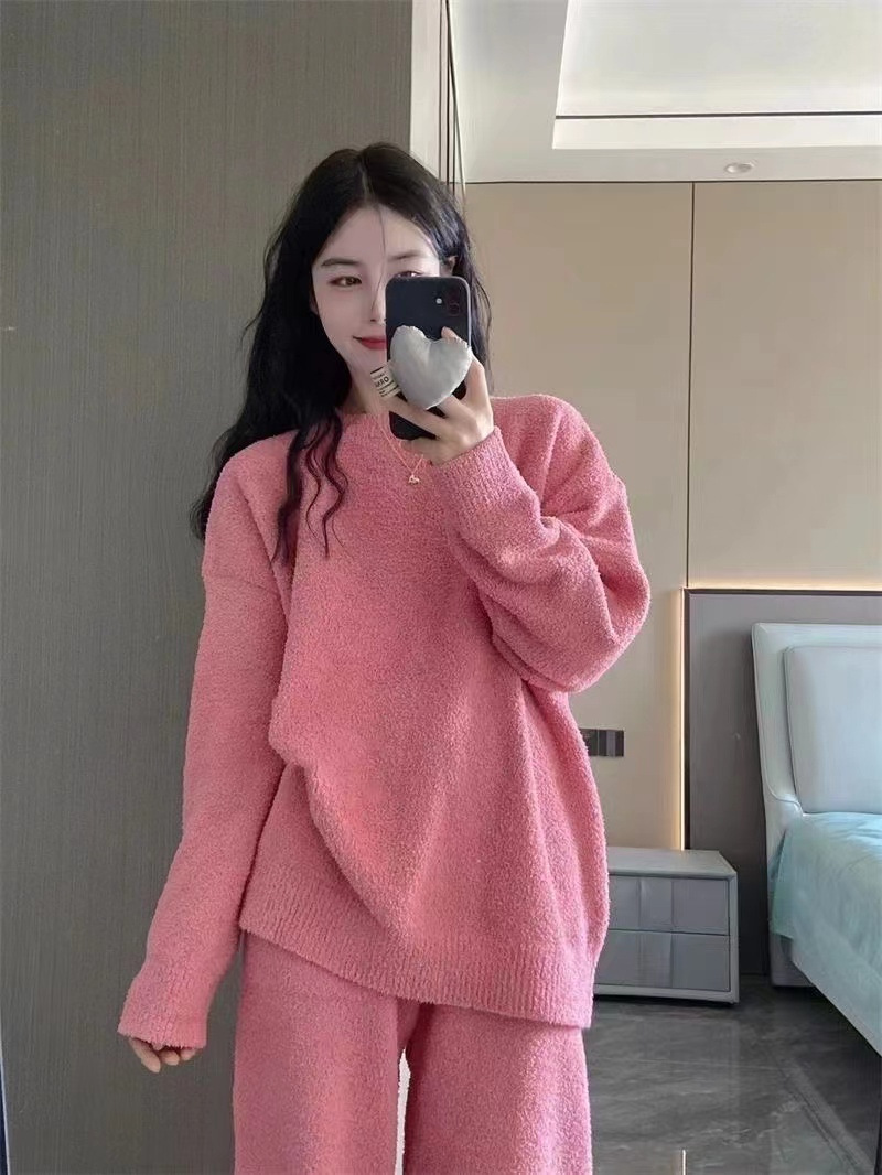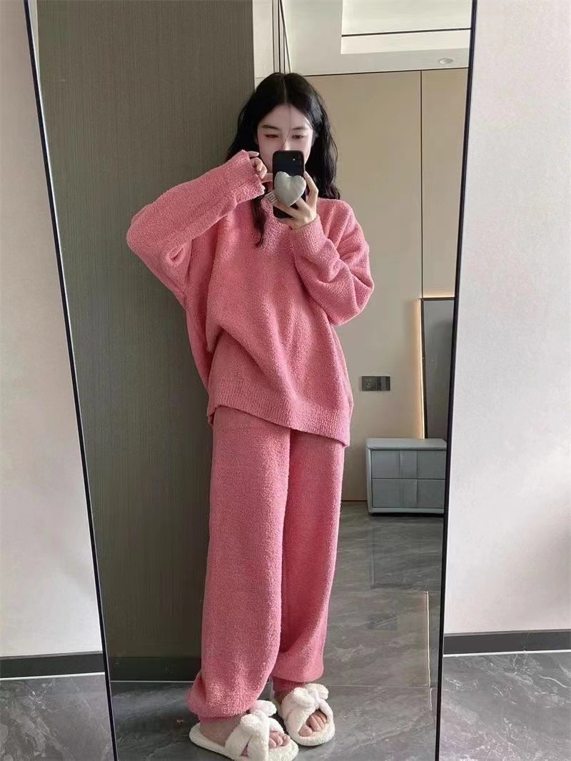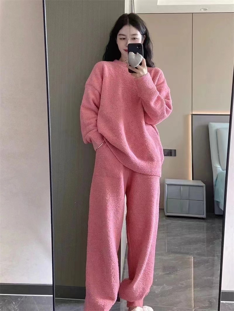 2024 새 한국판 고급 단색 잠옷 여성의 겨울 기모 두꺼운 봉제 니트 홈웨어 세트