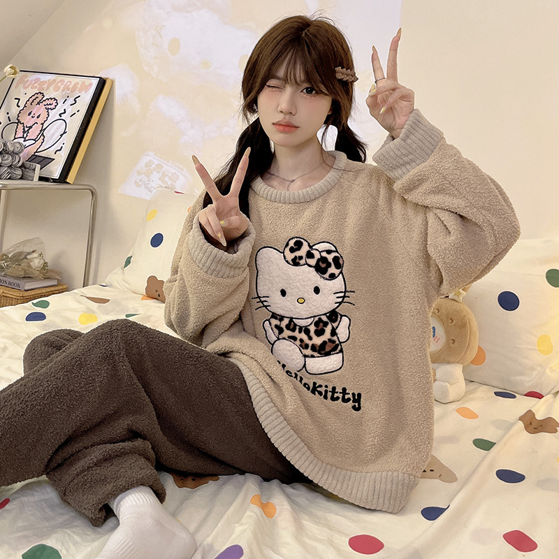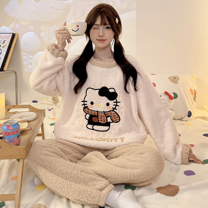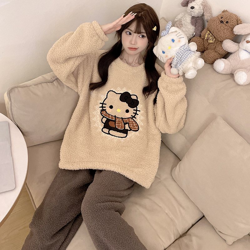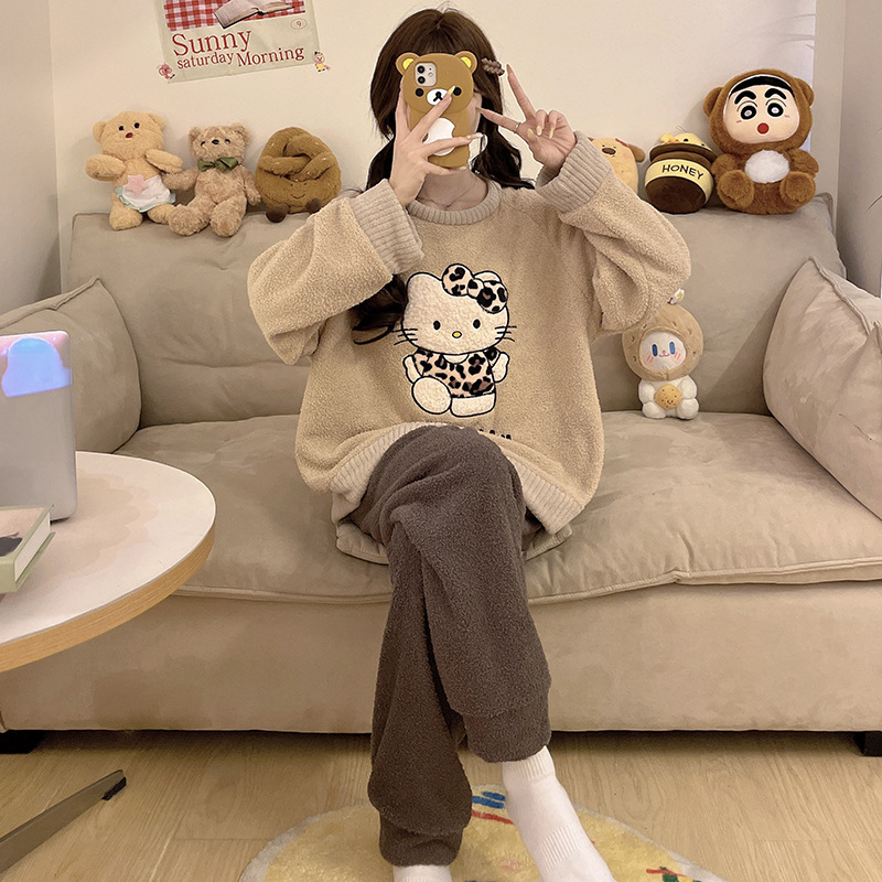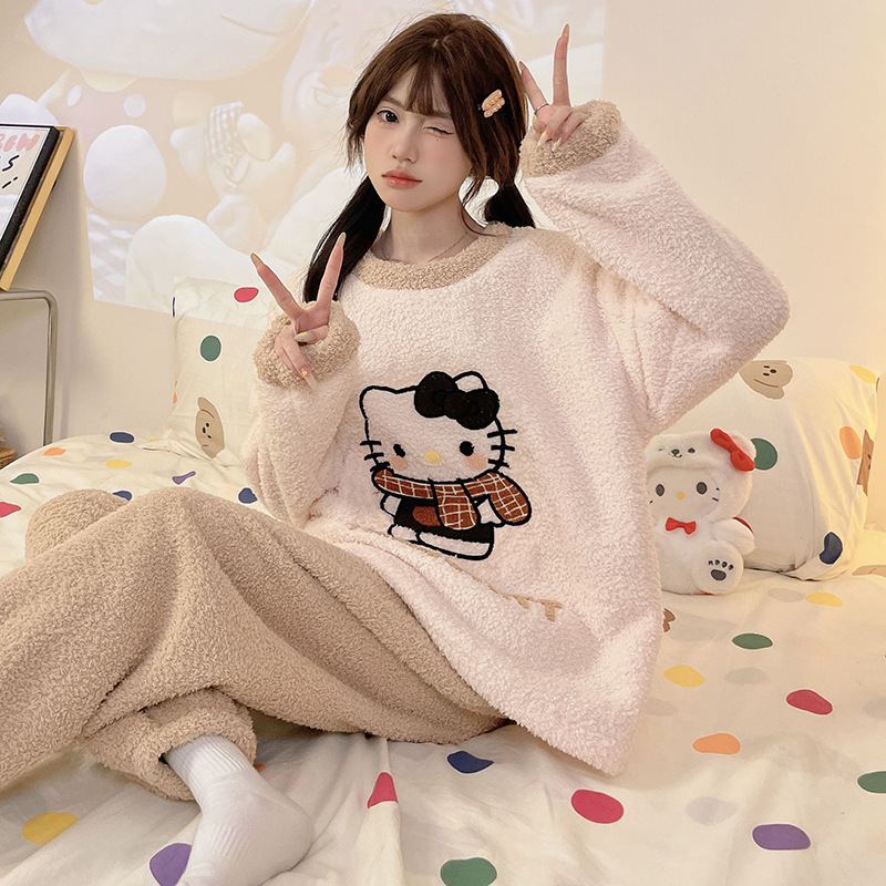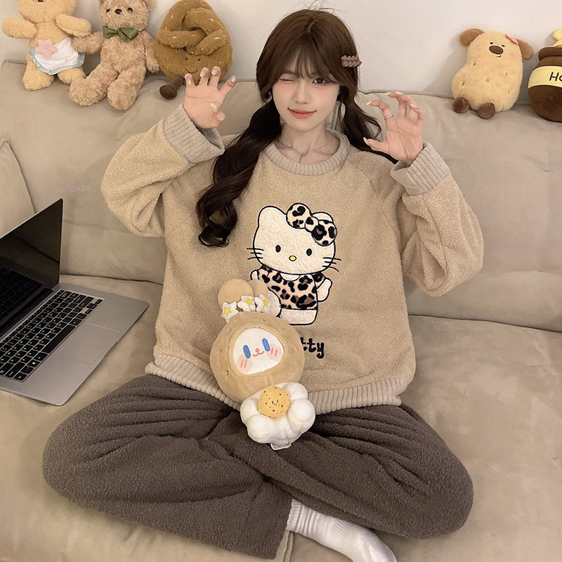 2024 새 한국판 고급 단색 잠옷 여성의 겨울 기모 두꺼운 봉제 니트 홈웨어 세트