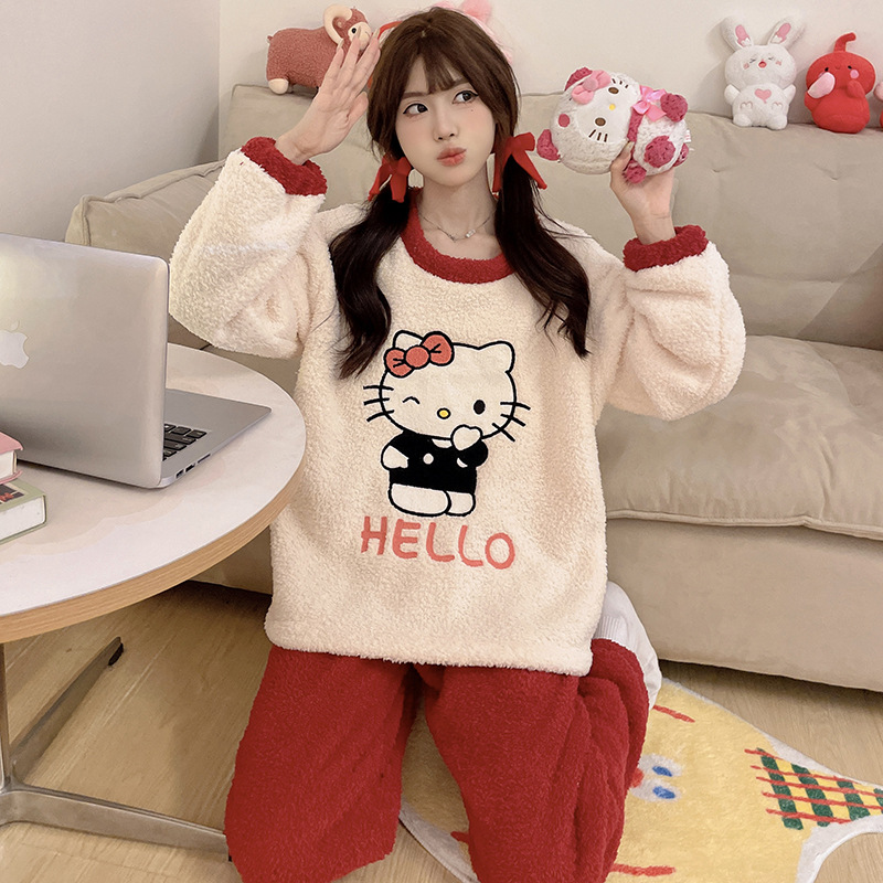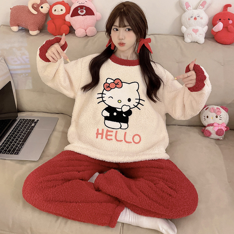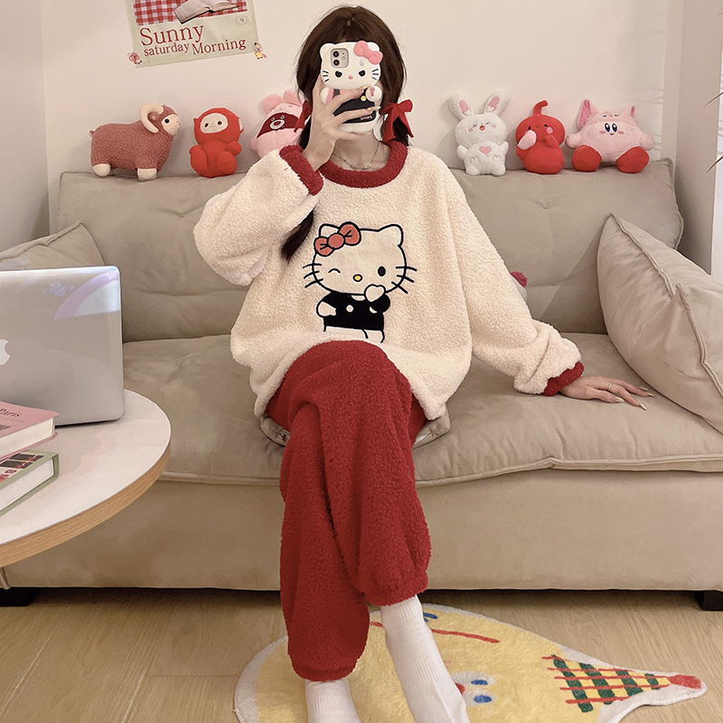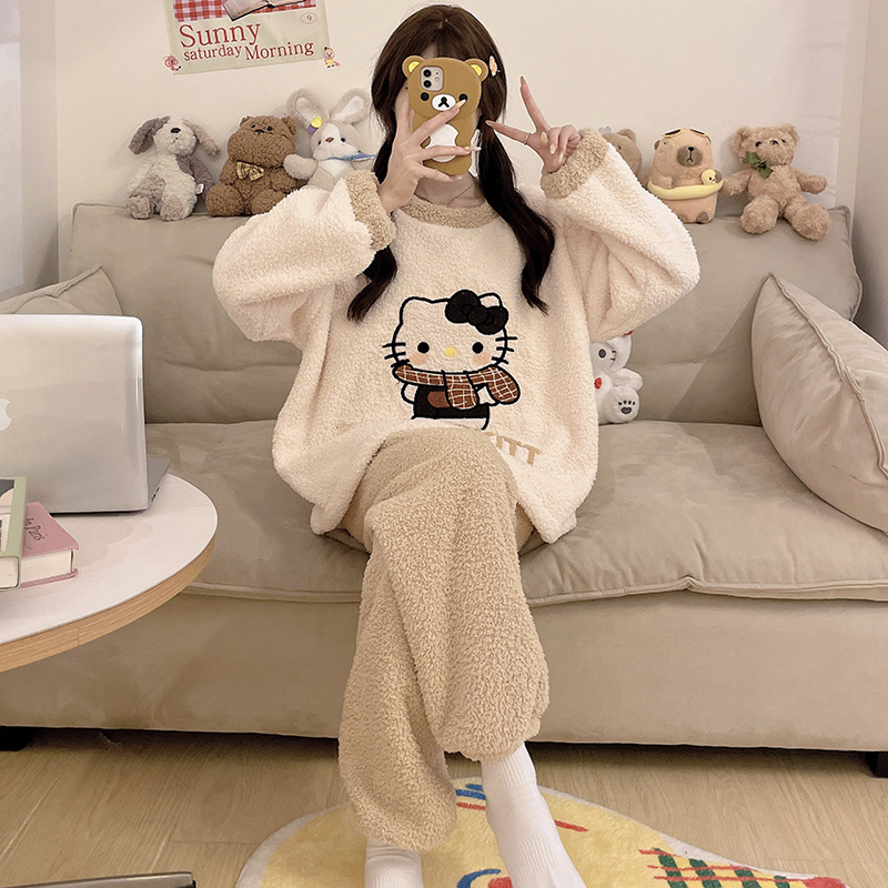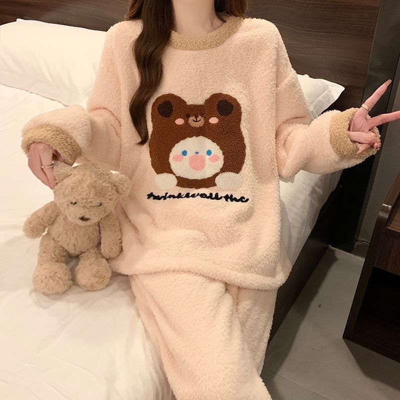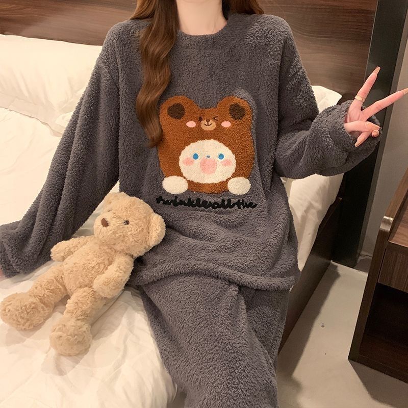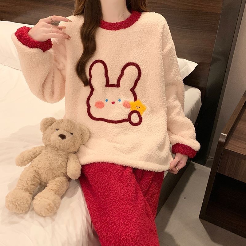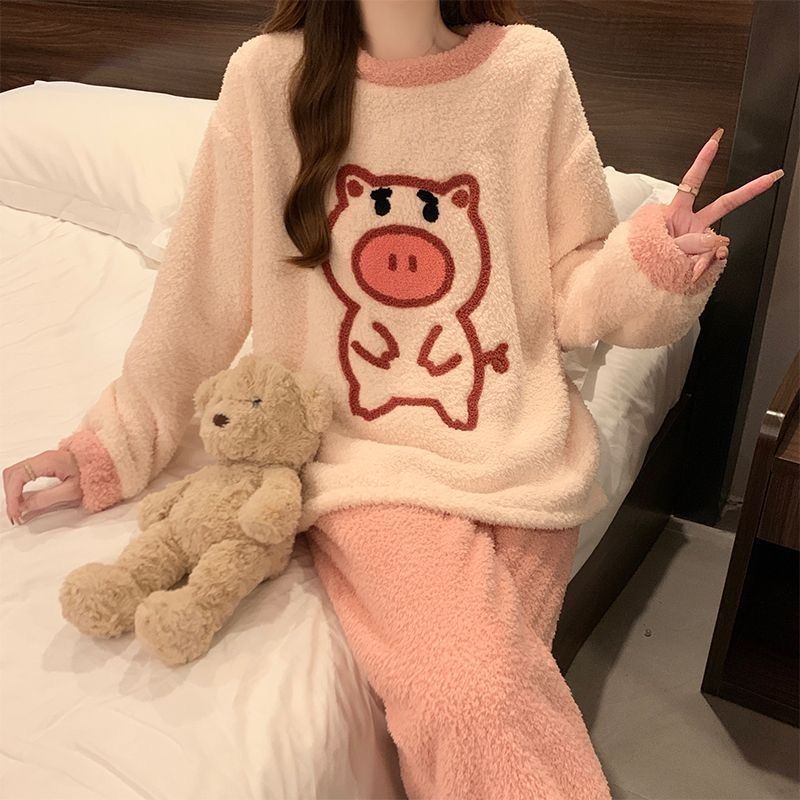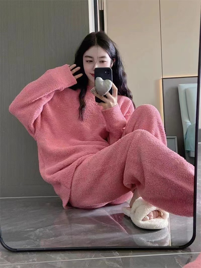 2024 새 한국판 고급 단색 잠옷 여성의 겨울 기모 두꺼운 봉제 니트 홈웨어 세트스토어 가기