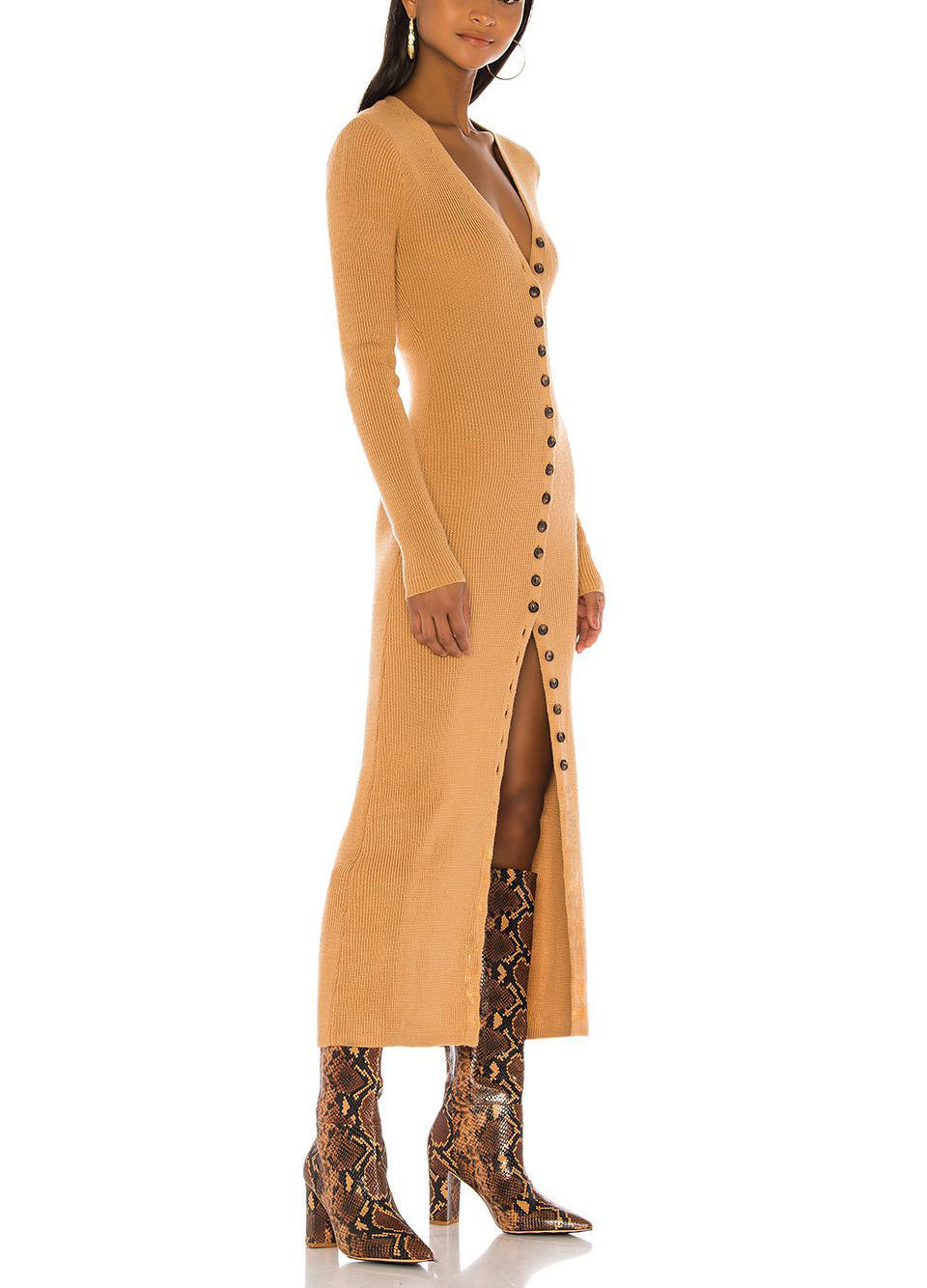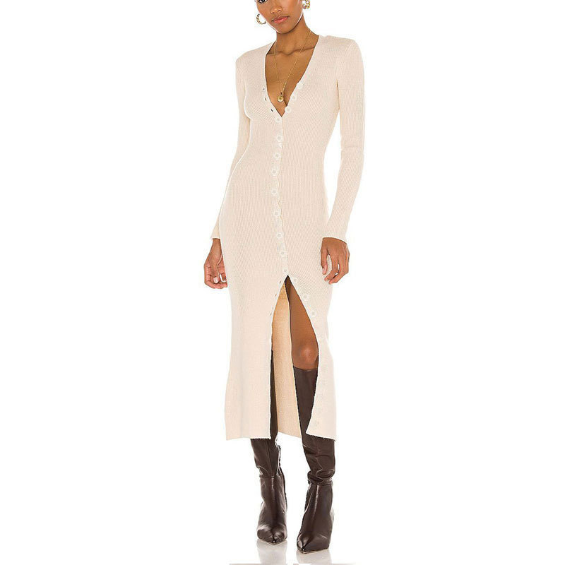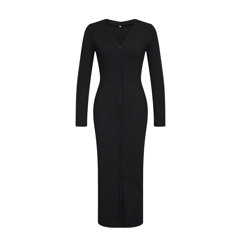 2024 아마존 크로스 보더 여성 니트 긴팔 싱글 브레스트 드레스 브이넥 슬림 롱 드레스스토어 가기