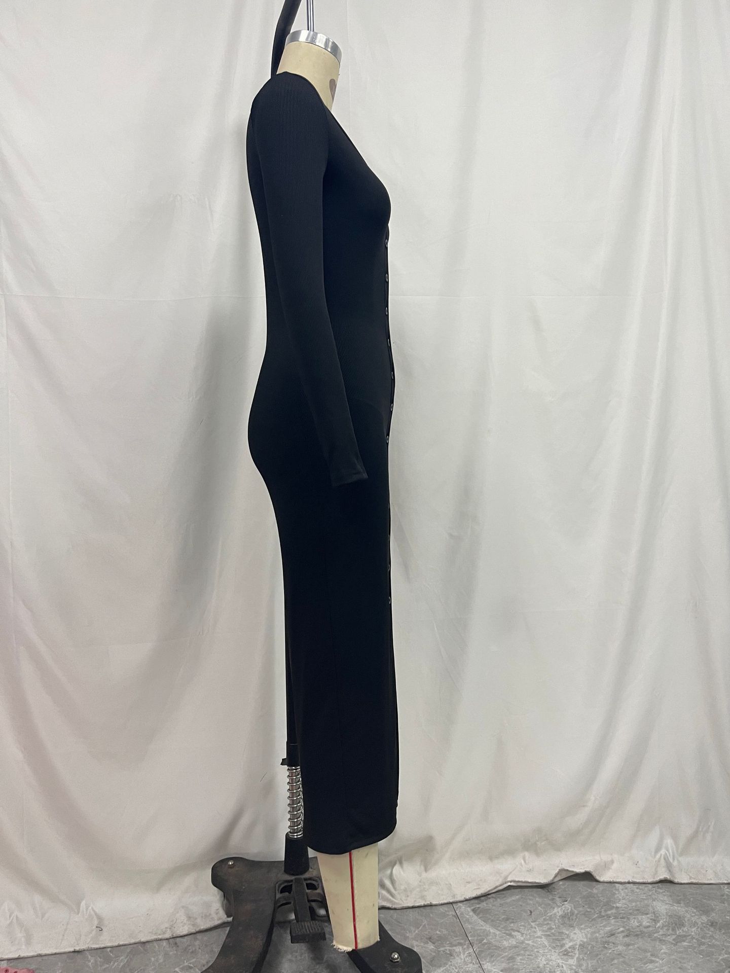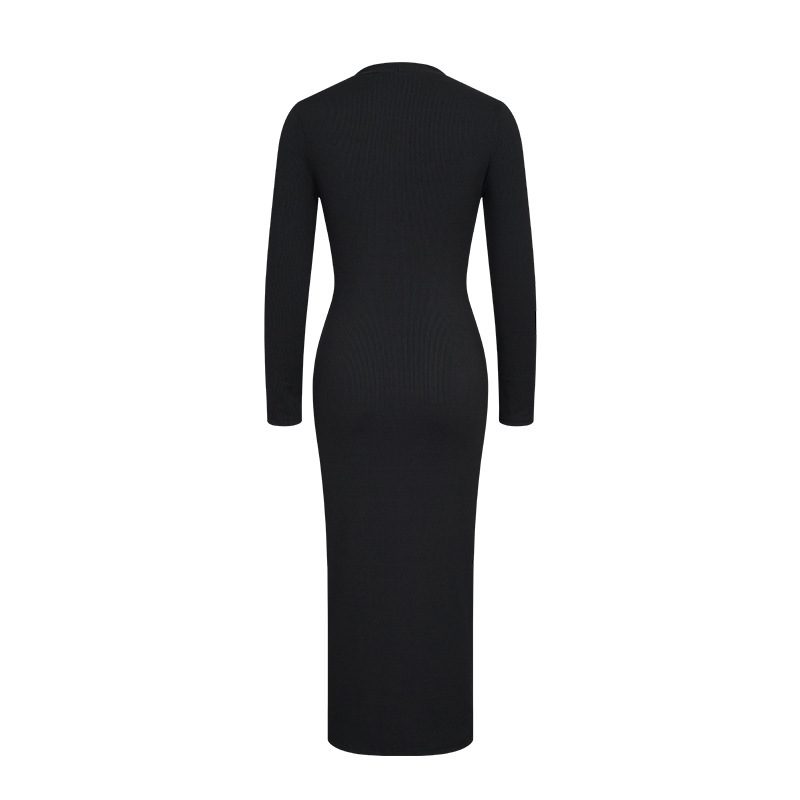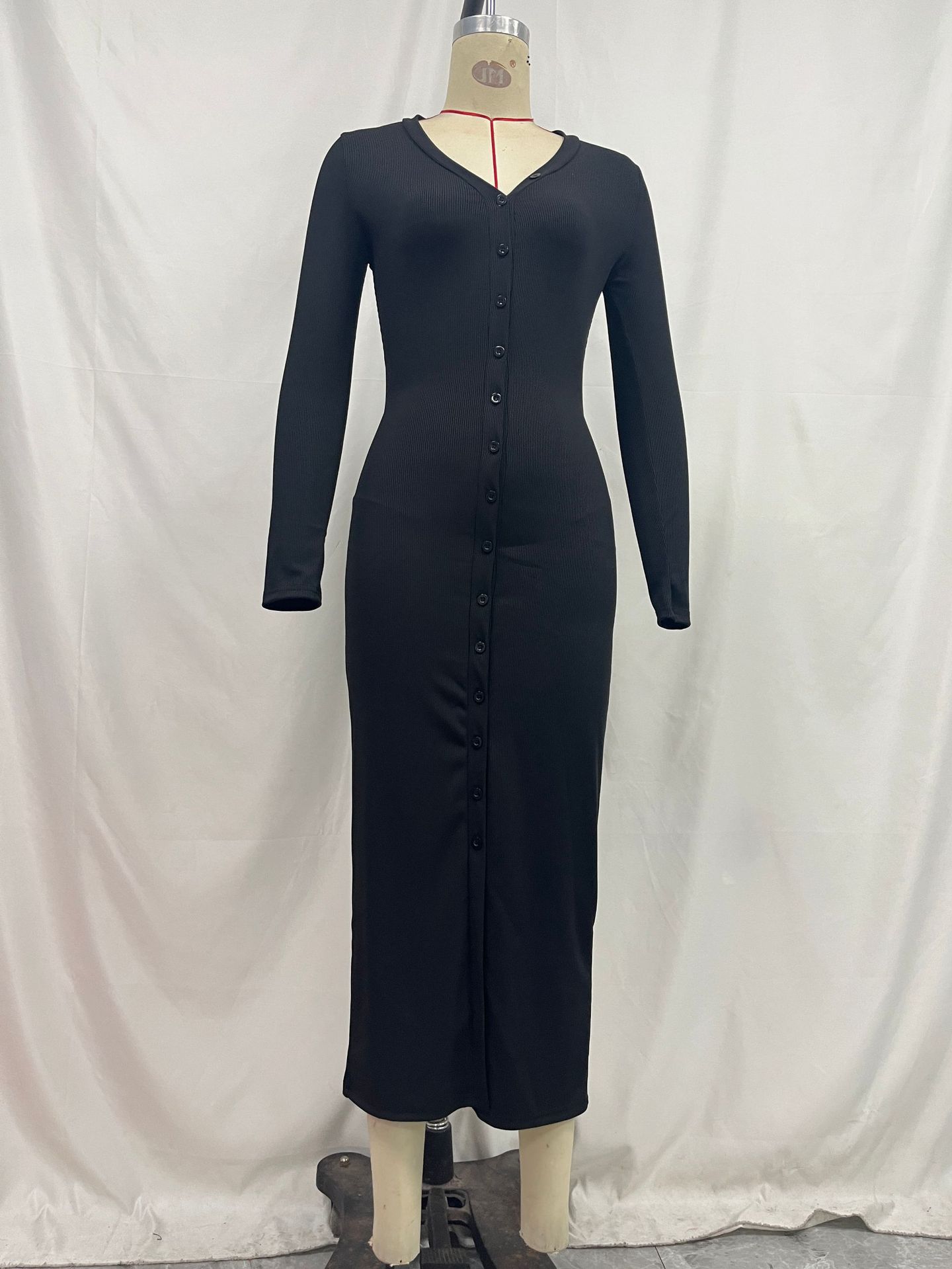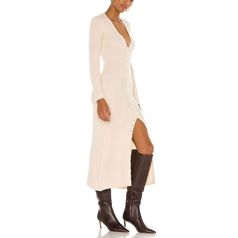 2024 아마존 크로스 보더 여성 니트 긴팔 싱글 브레스트 드레스 브이넥 슬림 롱 드레스