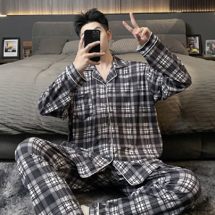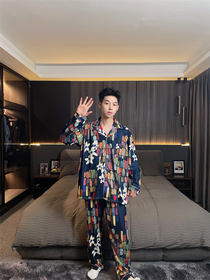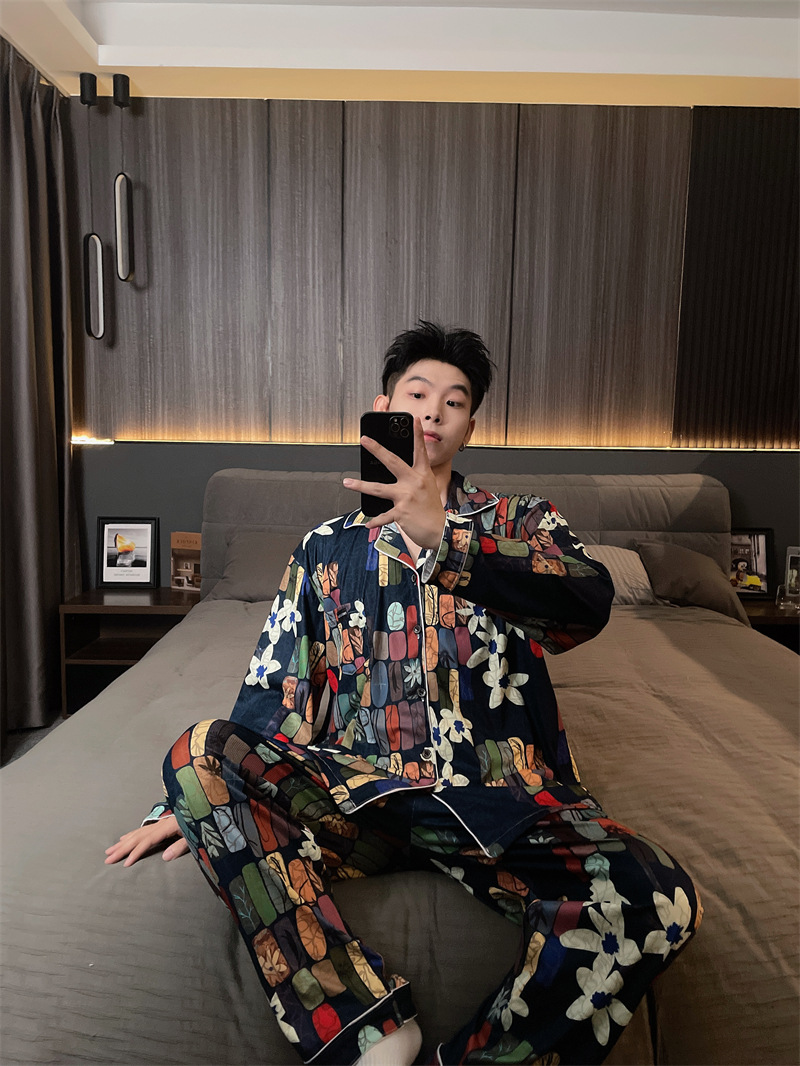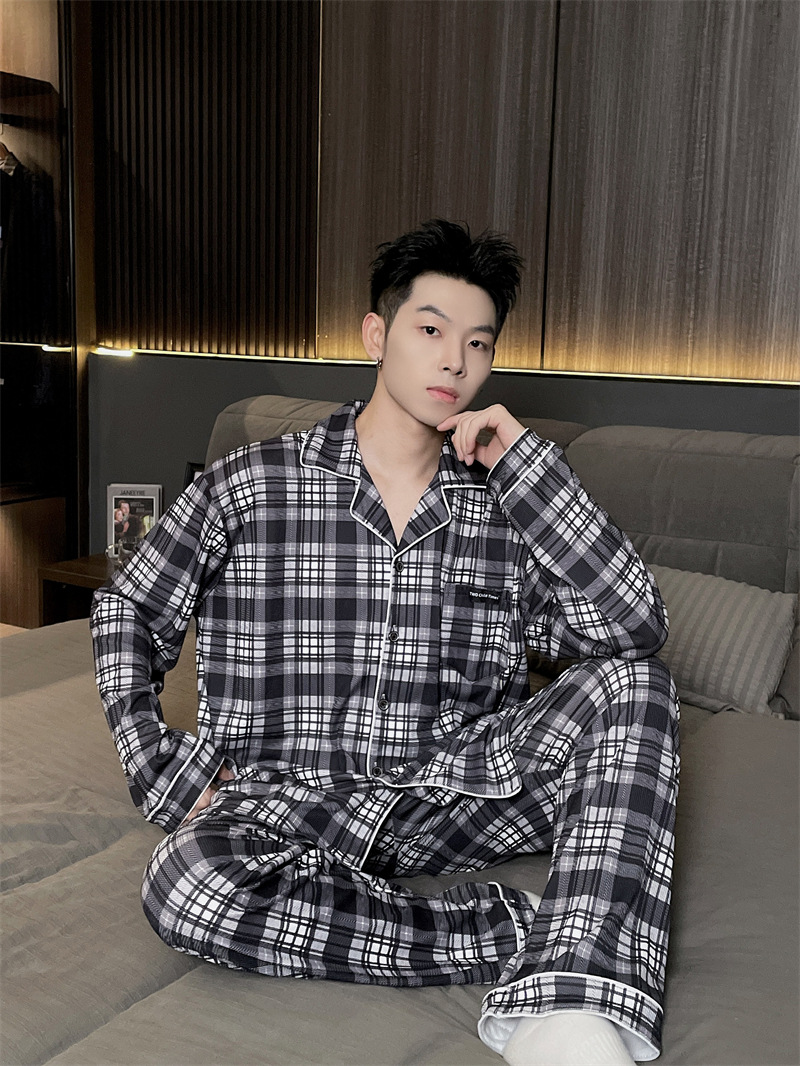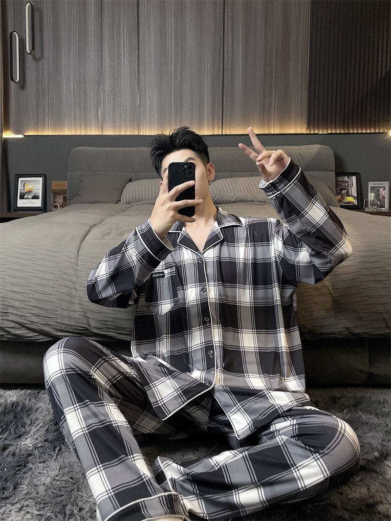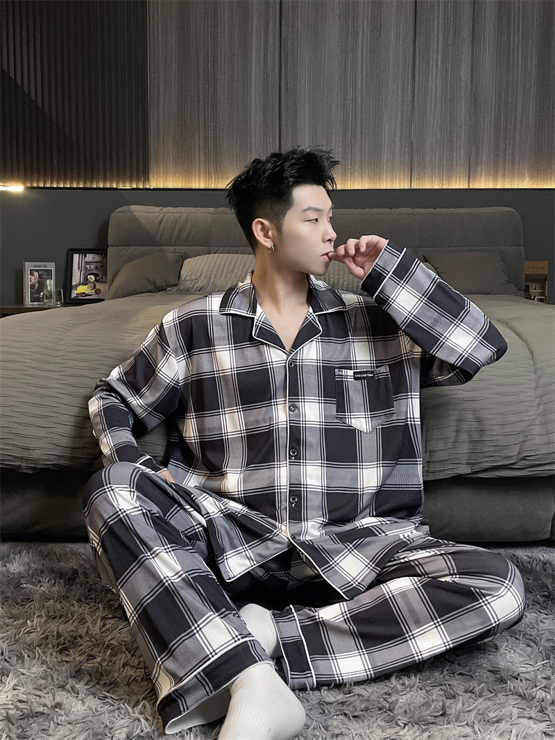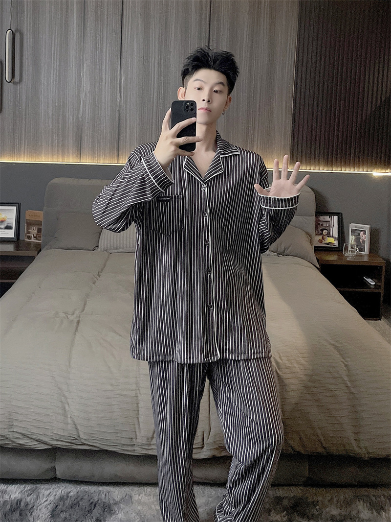 독일 벨벳 따뜻한 잠옷 남성용 봄과 가을 긴 소매와 지방 초대형 300kg 지방 겨울 얇은 벨벳 체크 무늬 홈 의류