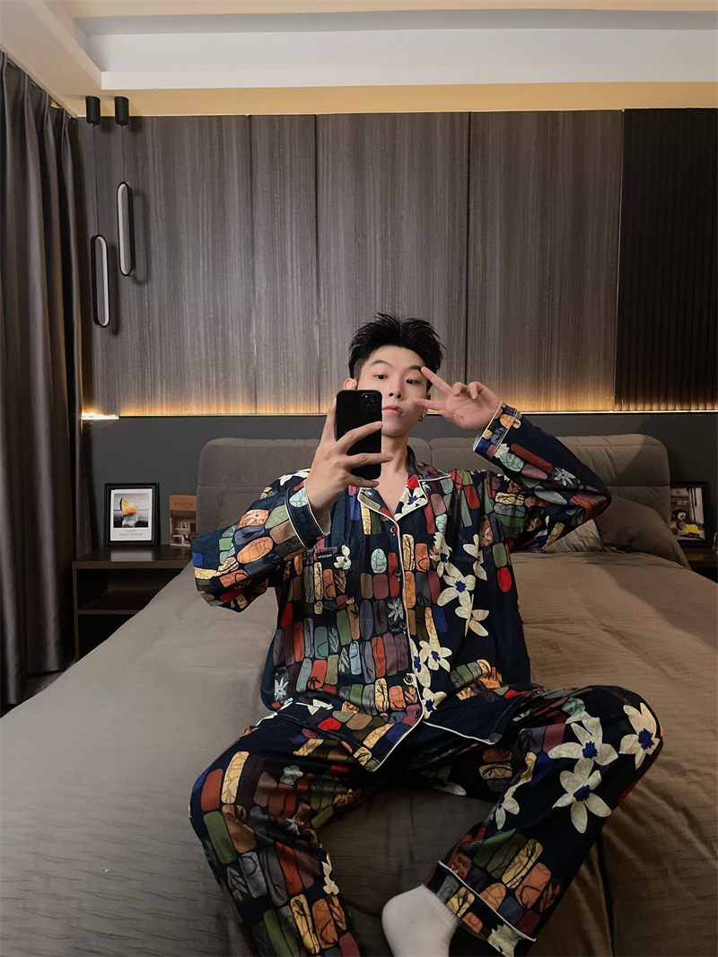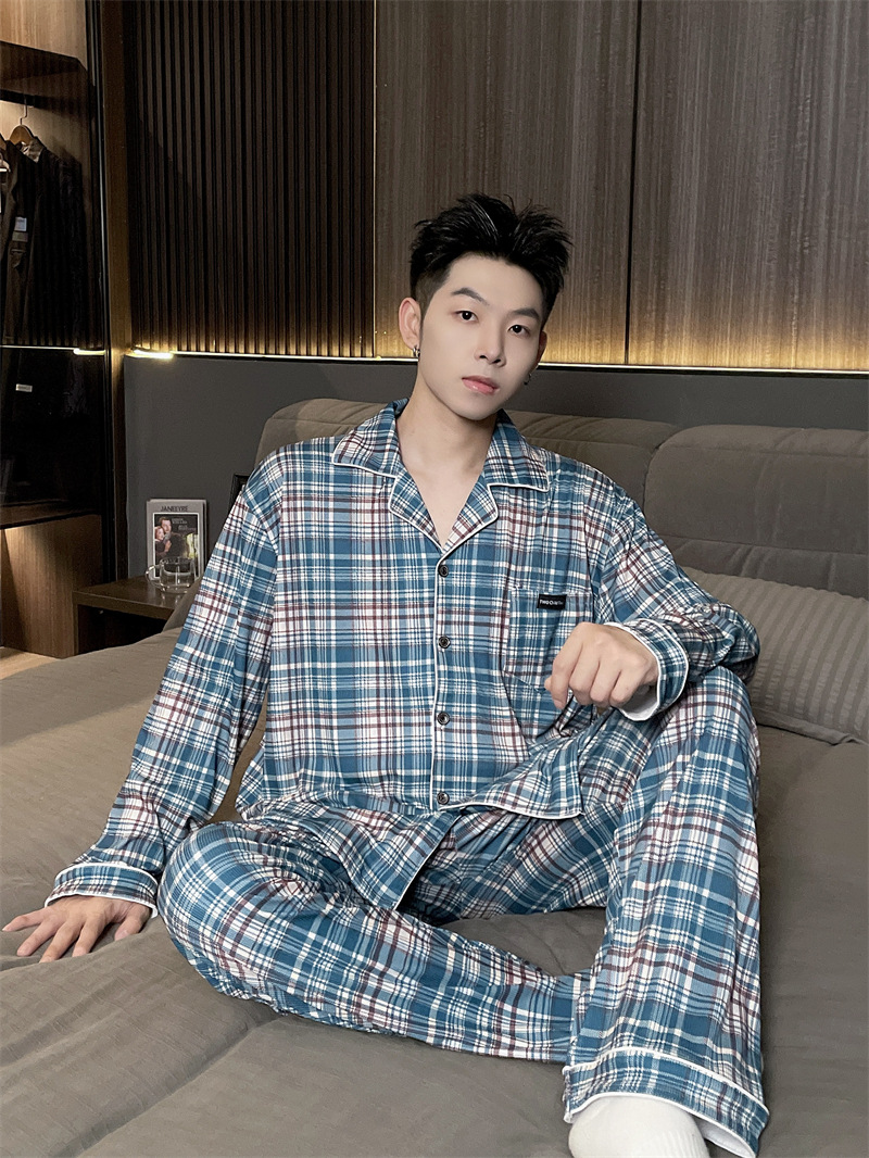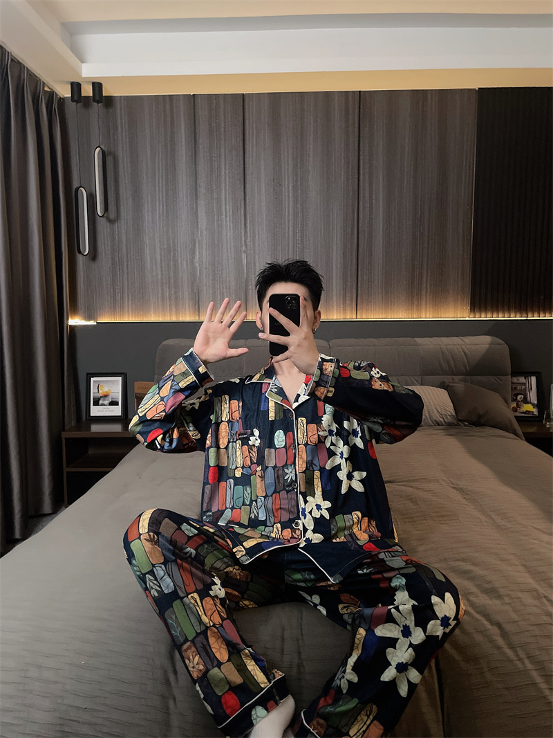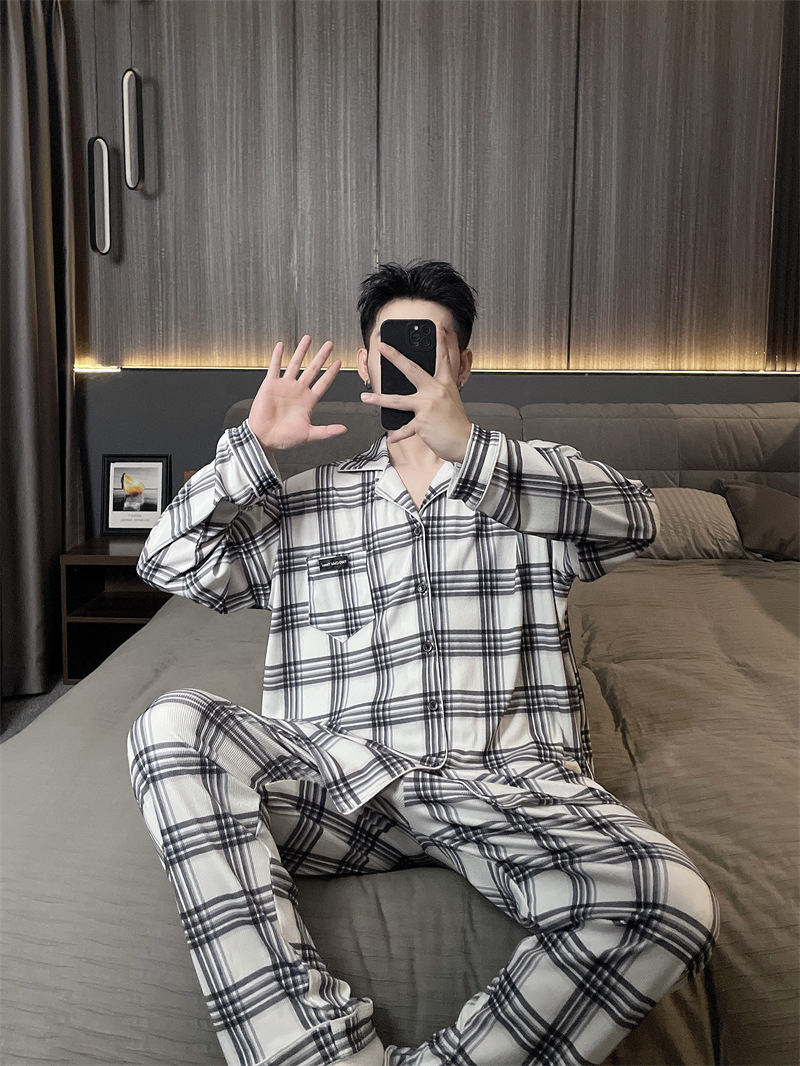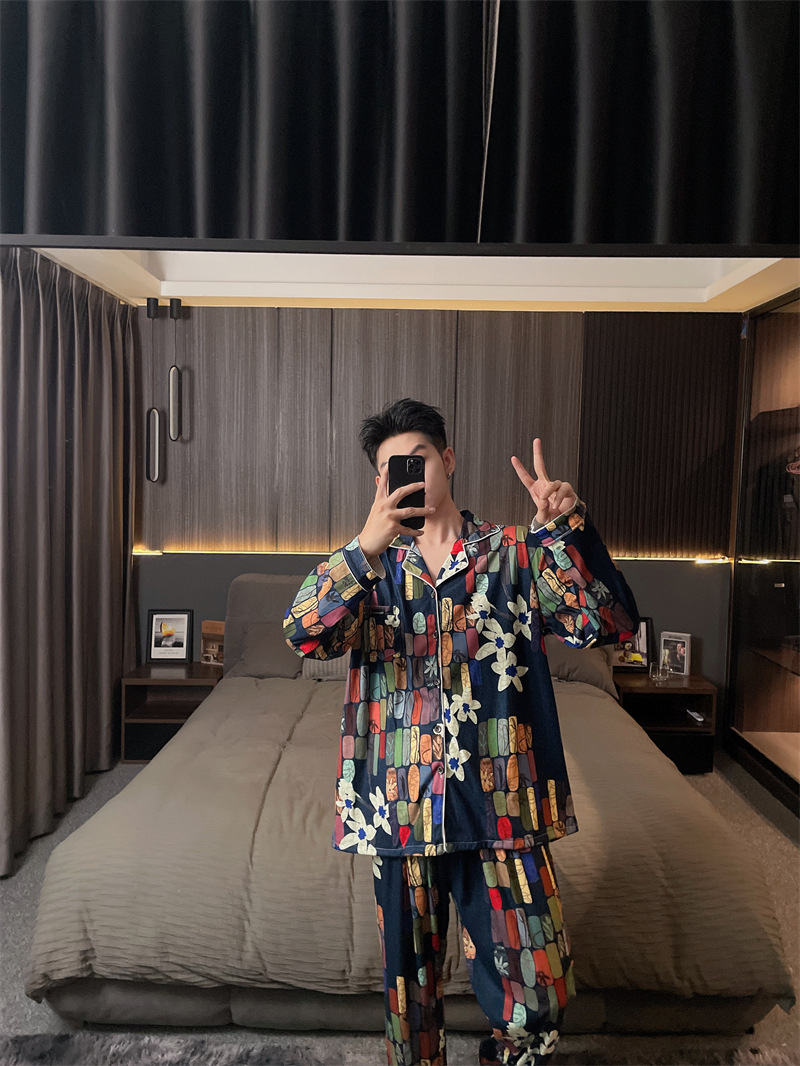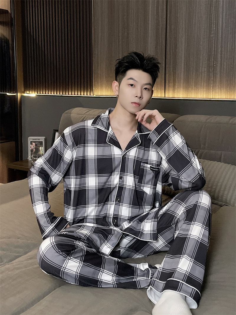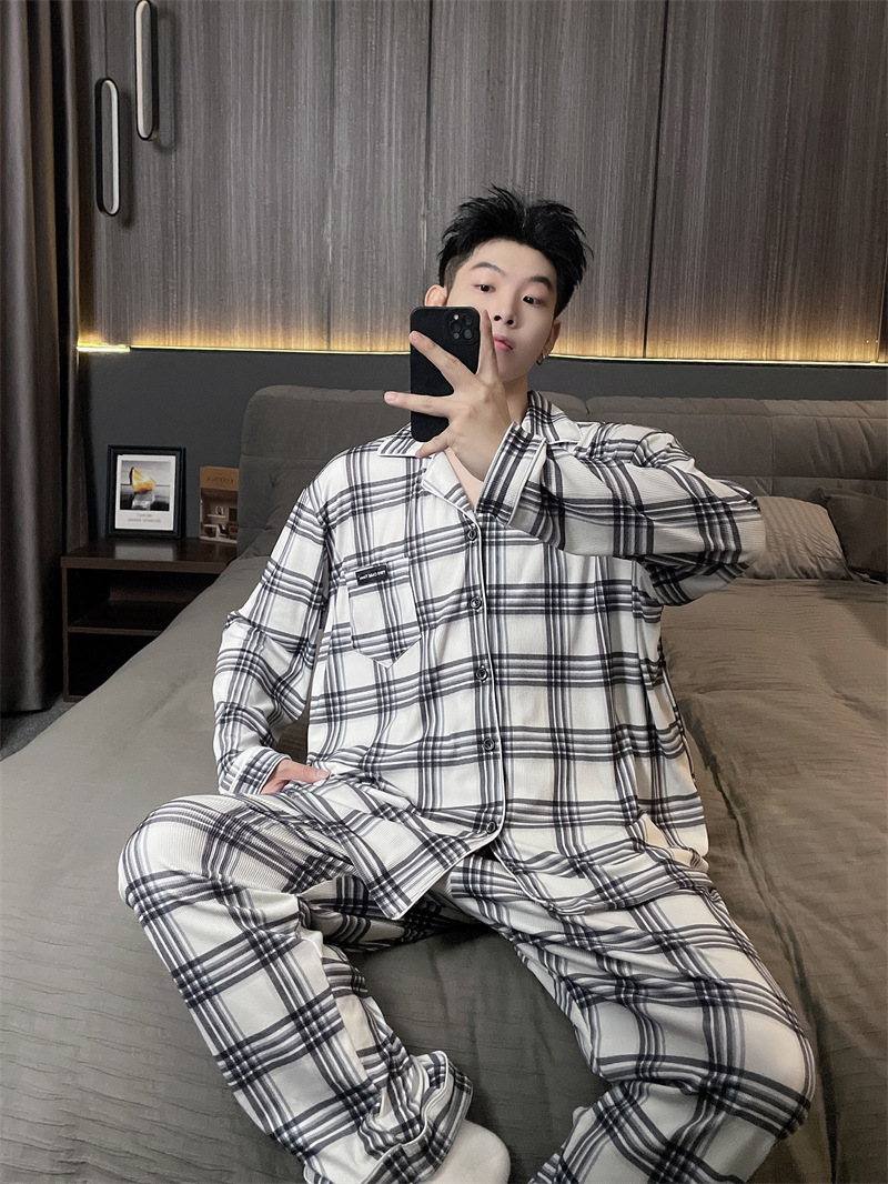 독일 벨벳 따뜻한 잠옷 남성용 봄과 가을 긴 소매와 지방 초대형 300kg 지방 겨울 얇은 벨벳 체크 무늬 홈 의류