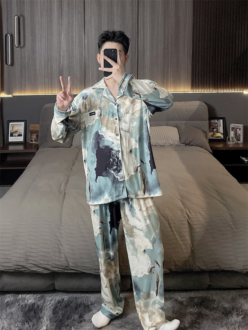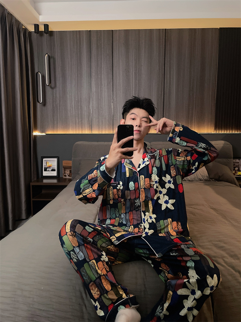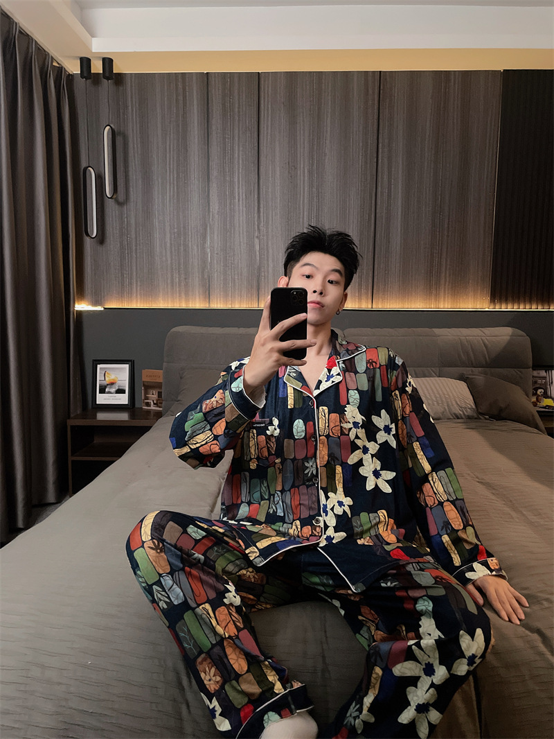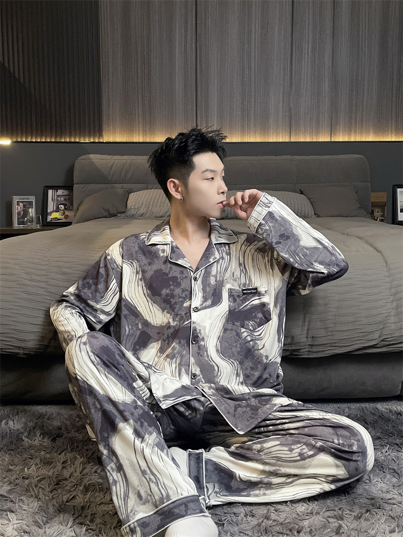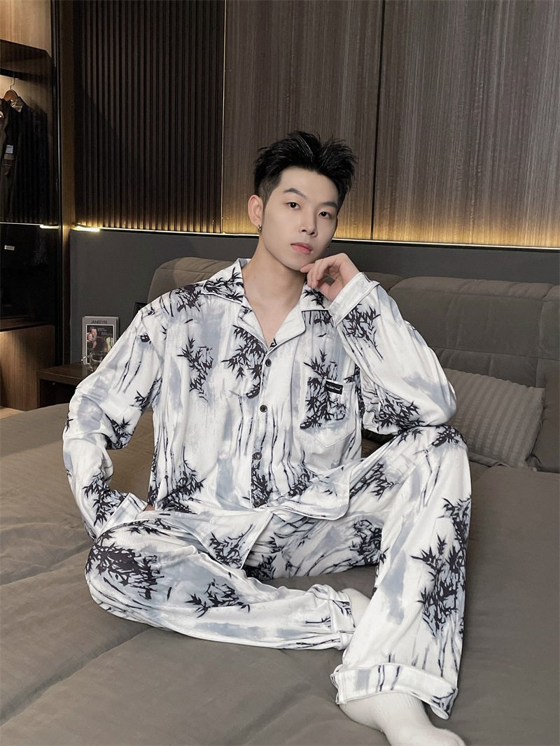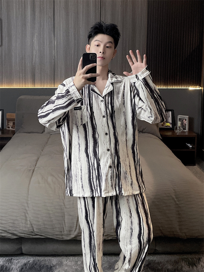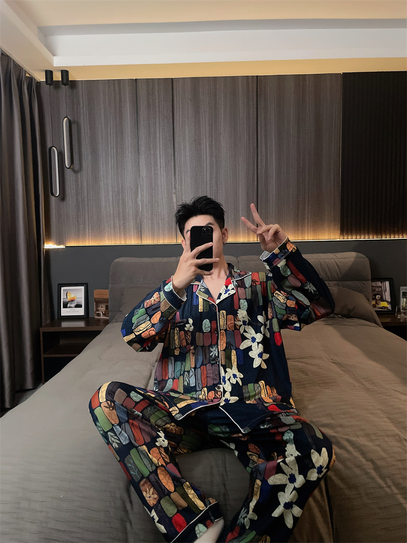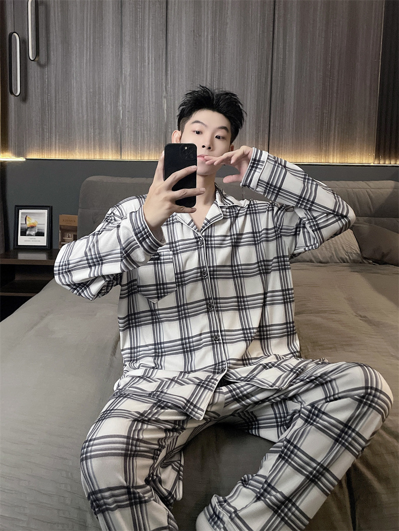 독일 벨벳 따뜻한 잠옷 남성용 봄과 가을 긴 소매와 지방 초대형 300kg 지방 겨울 얇은 벨벳 체크 무늬 홈 의류