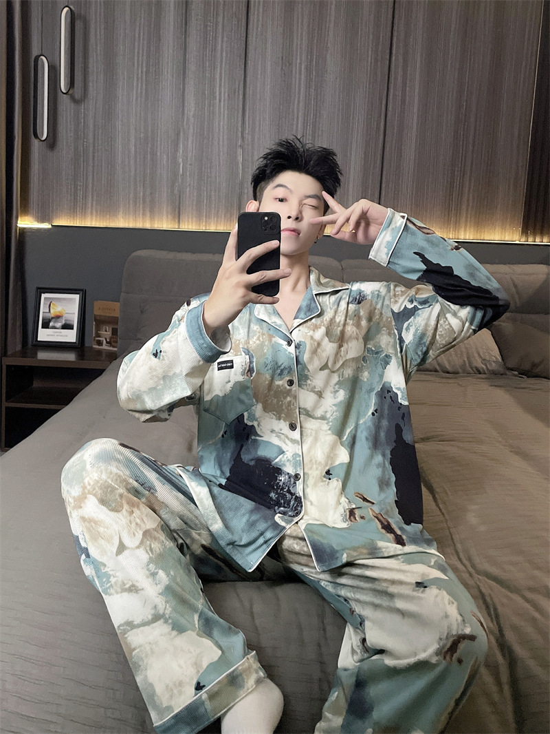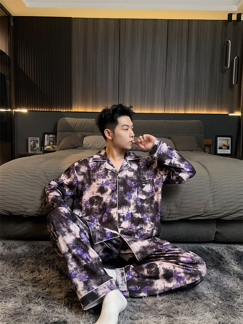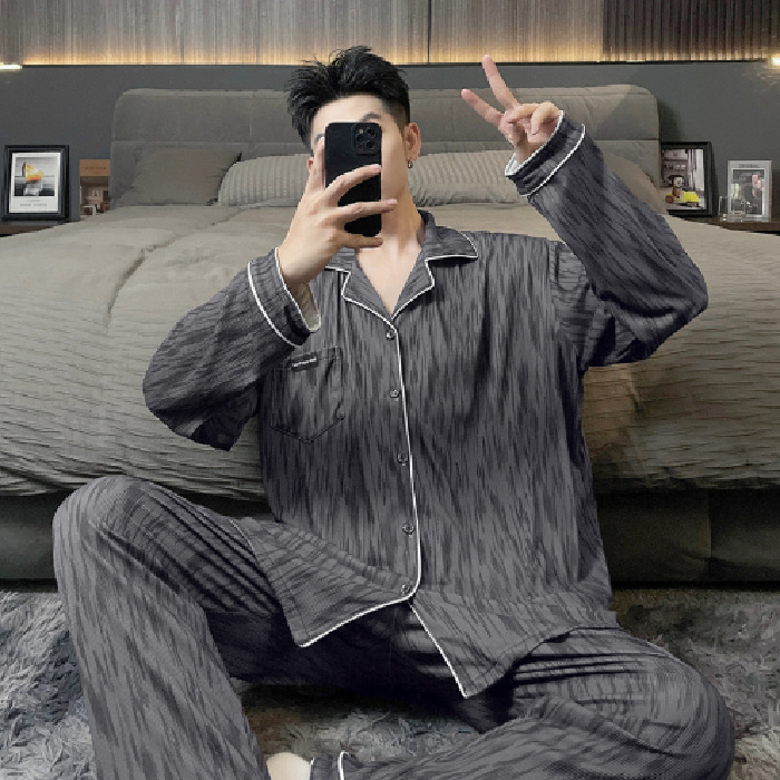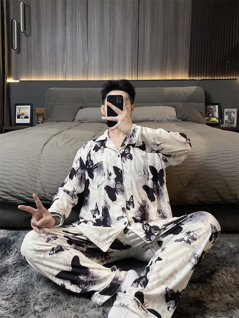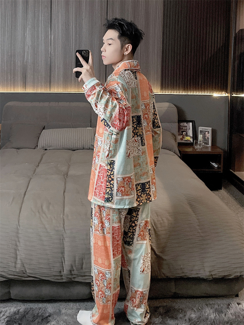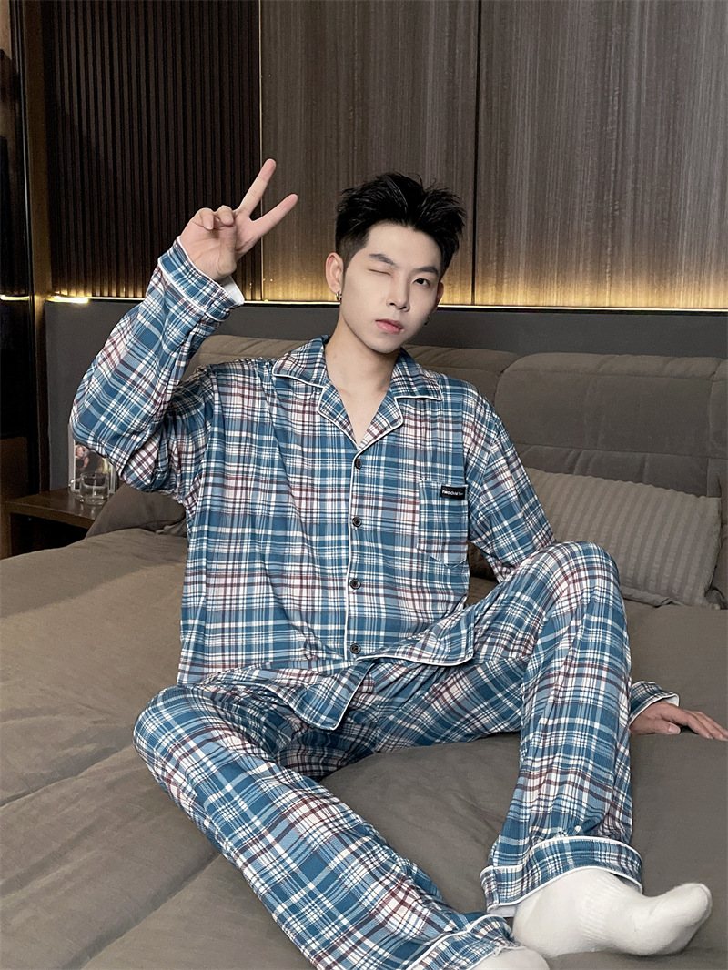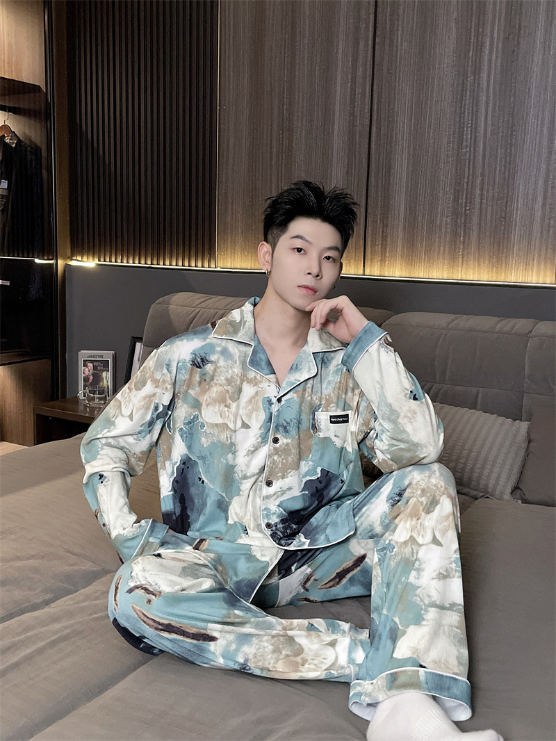 독일 벨벳 따뜻한 잠옷 남성용 봄과 가을 긴 소매와 지방 초대형 300kg 지방 겨울 얇은 벨벳 체크 무늬 홈 의류