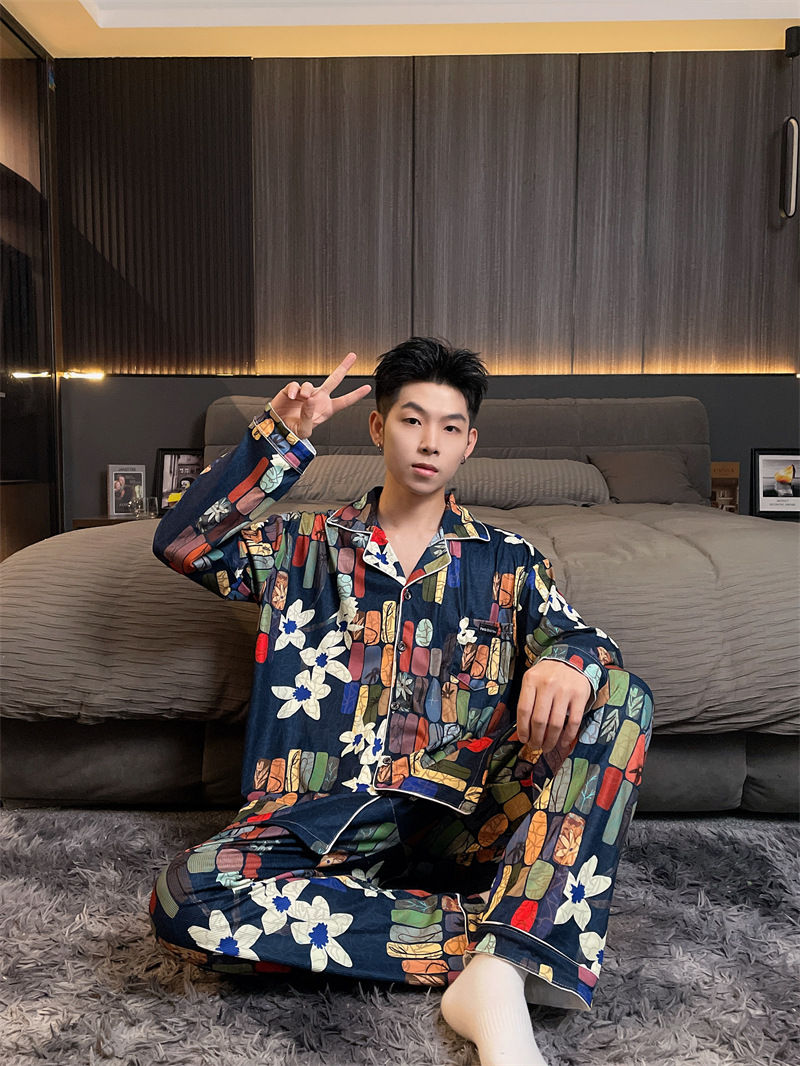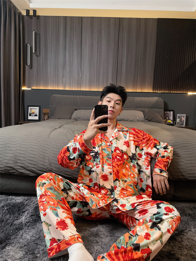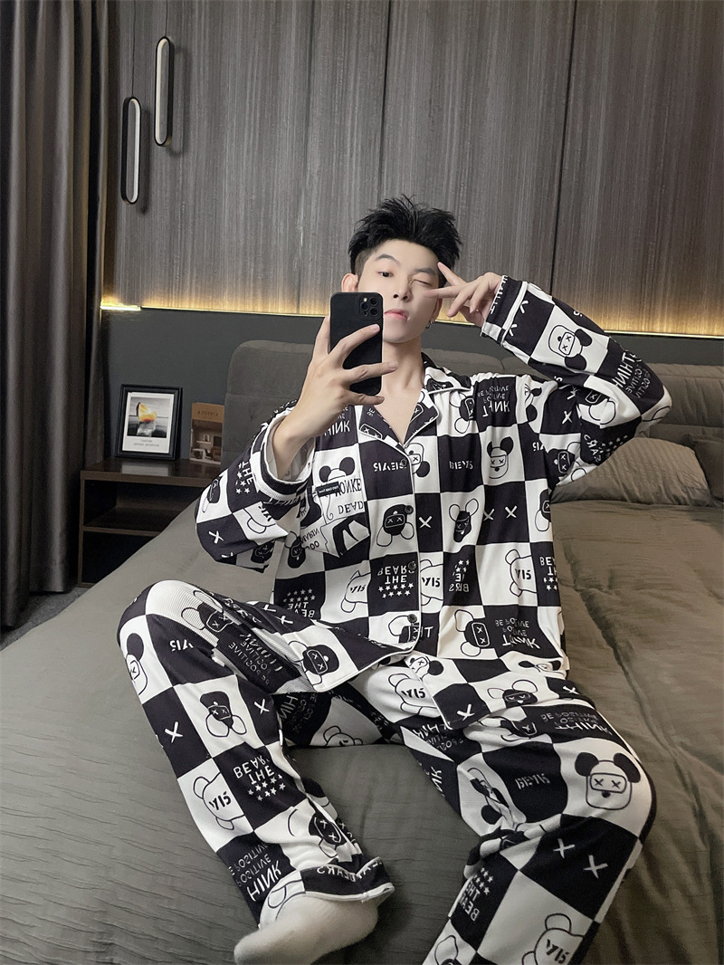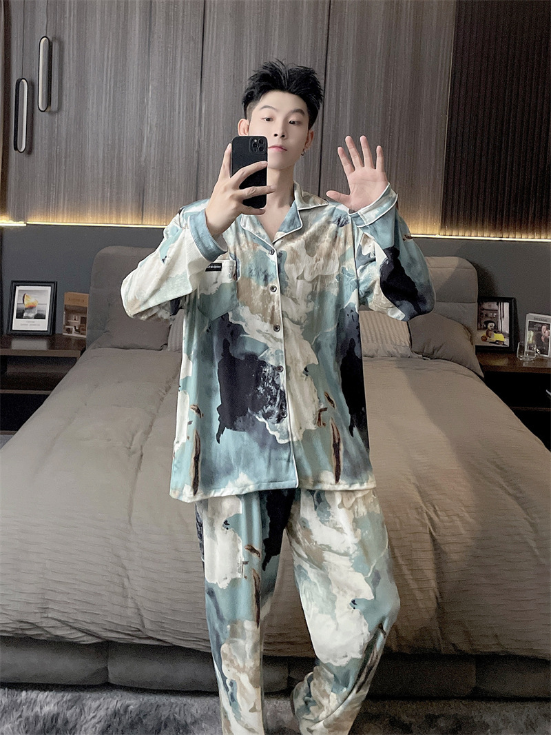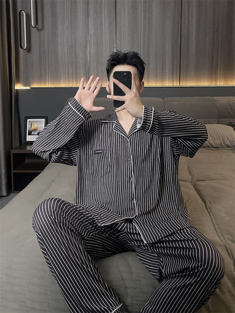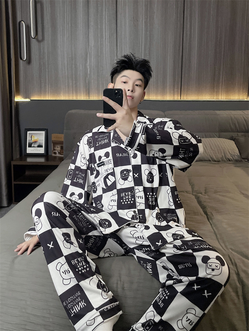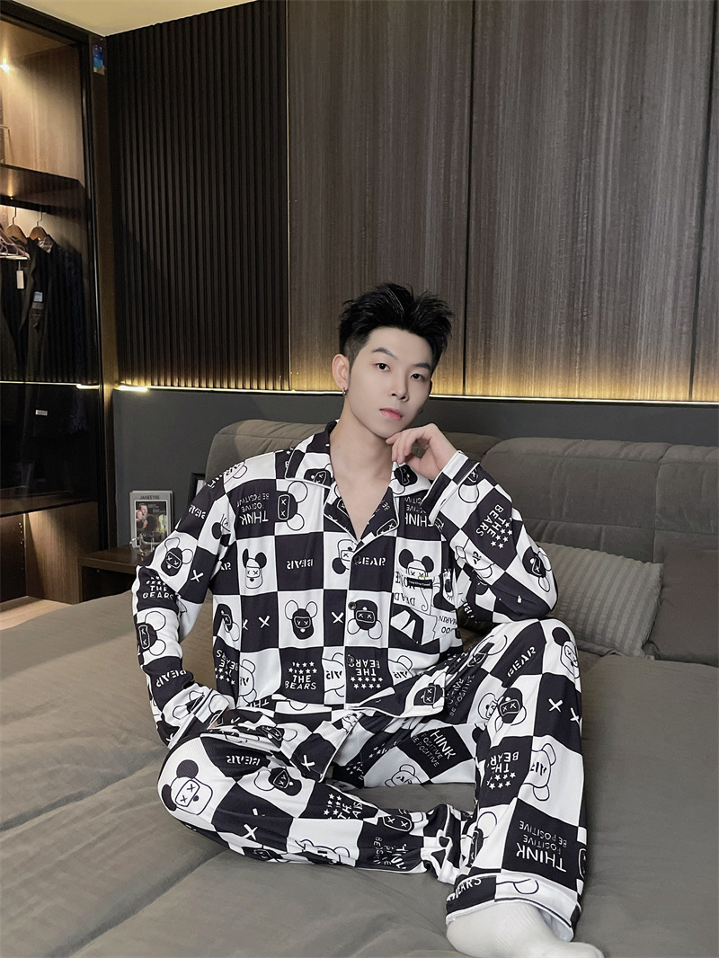 독일 벨벳 따뜻한 잠옷 남성용 봄과 가을 긴 소매와 지방 초대형 300kg 지방 겨울 얇은 벨벳 체크 무늬 홈 의류