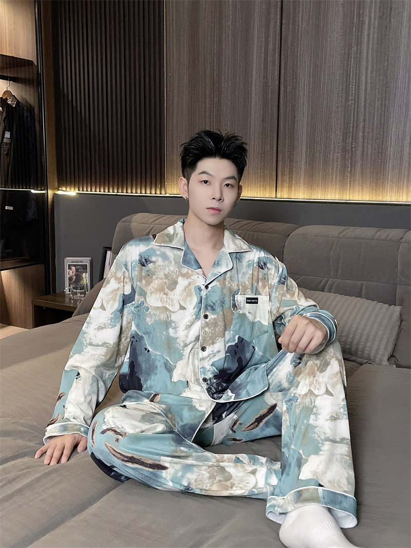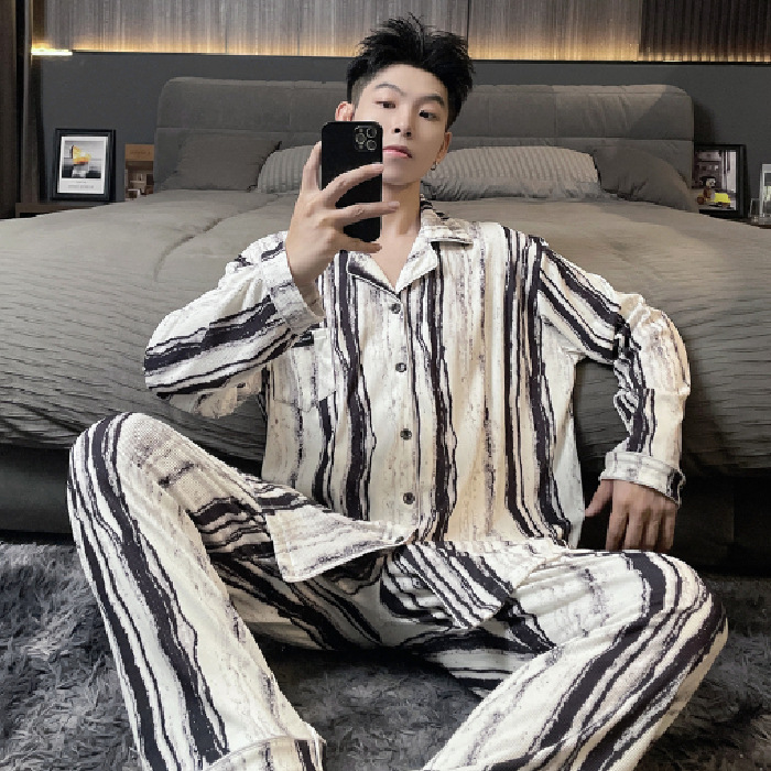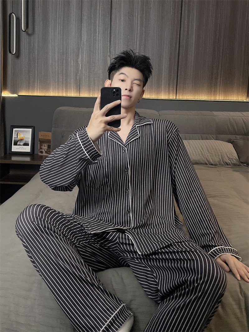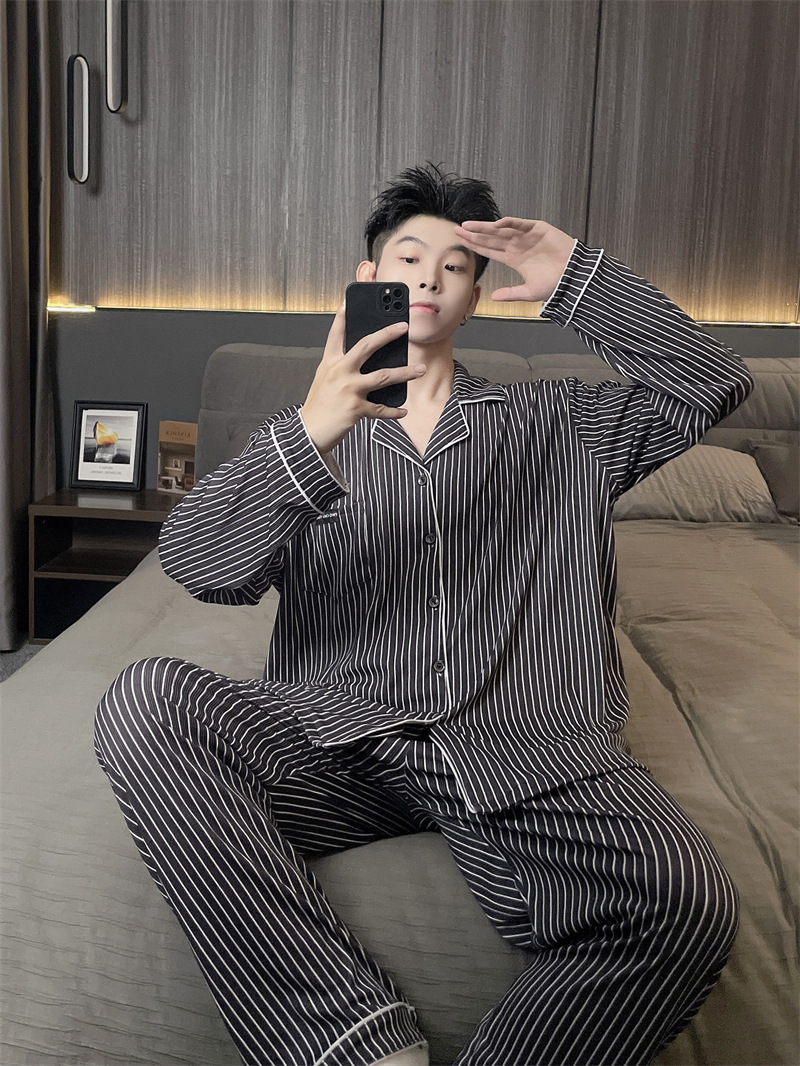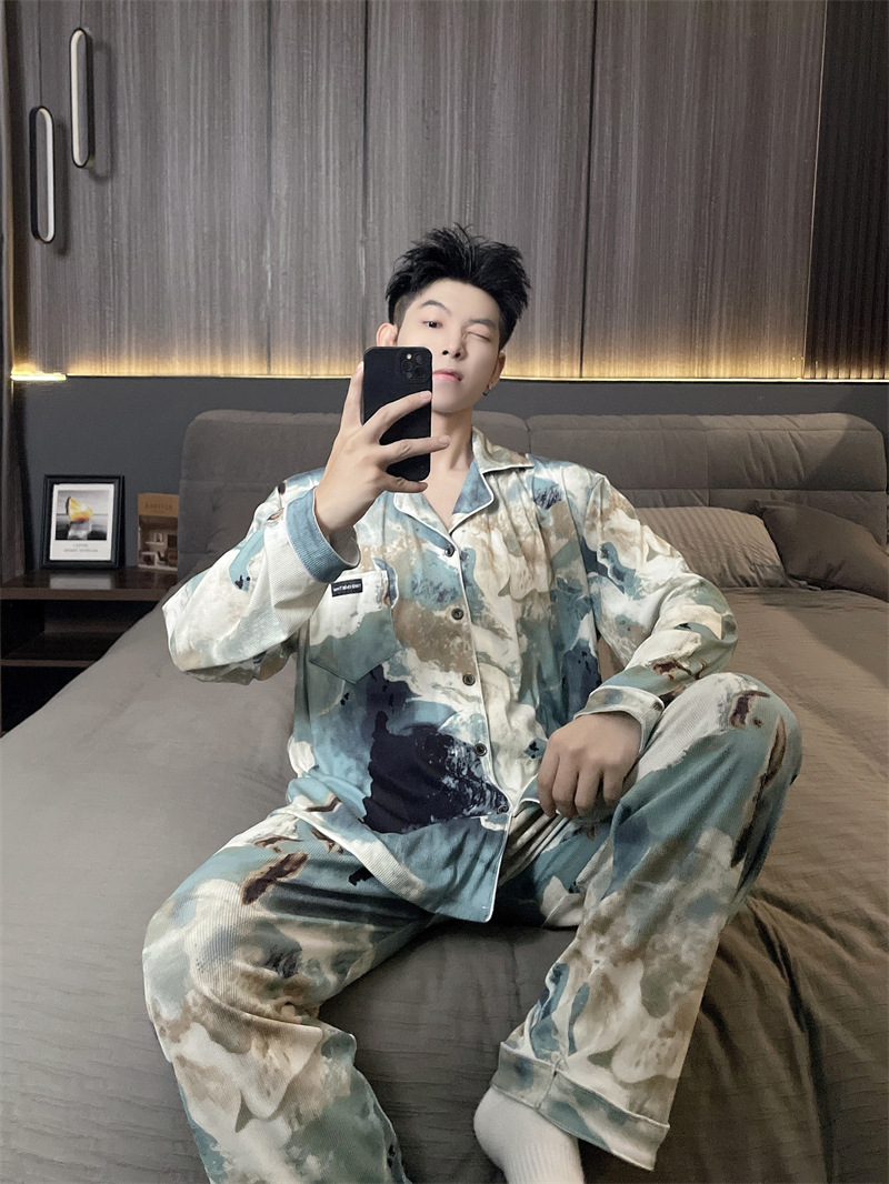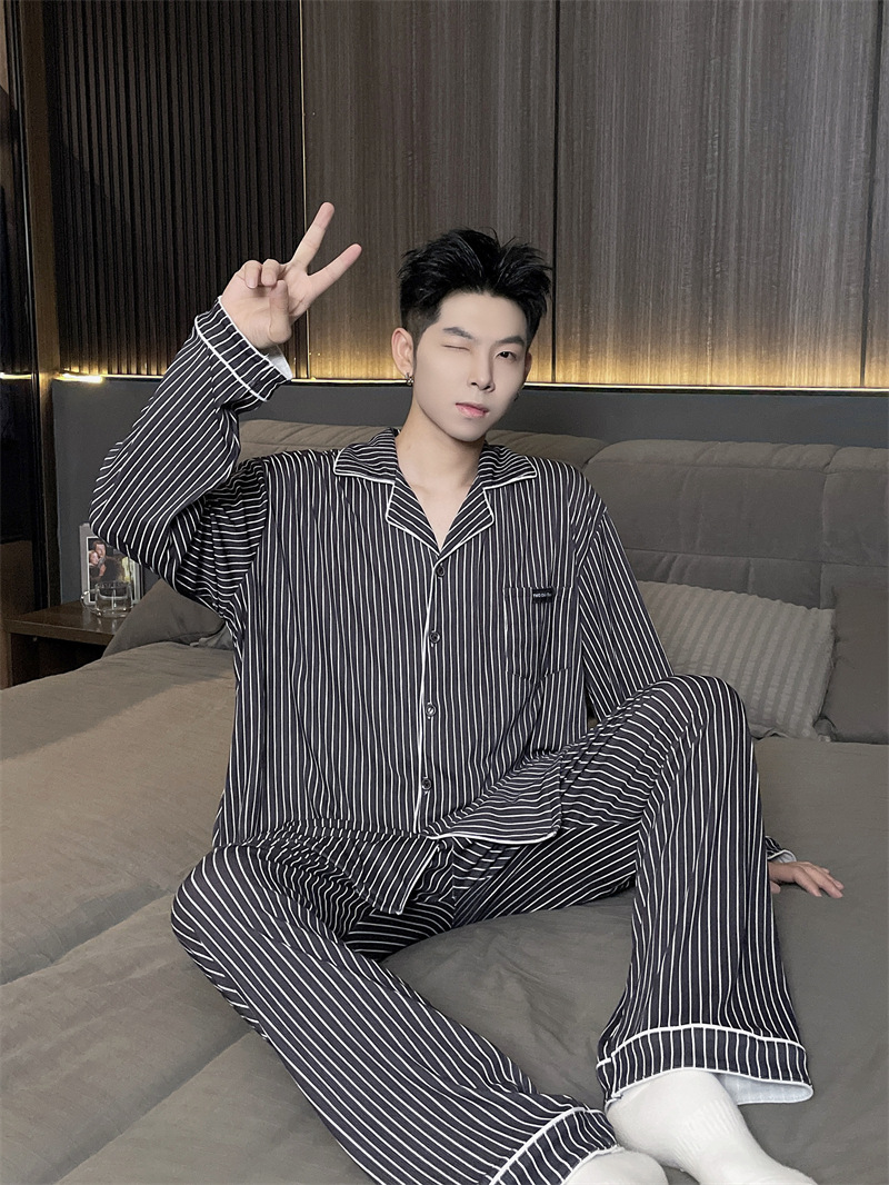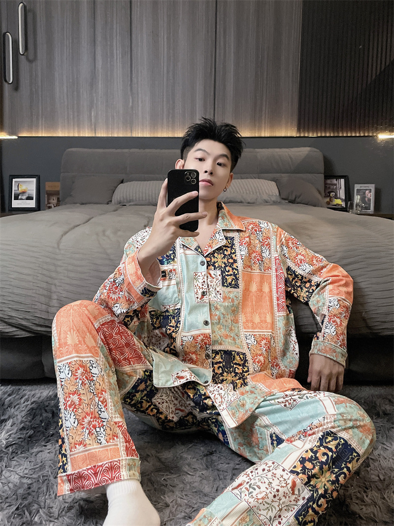 독일 벨벳 따뜻한 잠옷 남성용 봄과 가을 긴 소매와 지방 초대형 300kg 지방 겨울 얇은 벨벳 체크 무늬 홈 의류