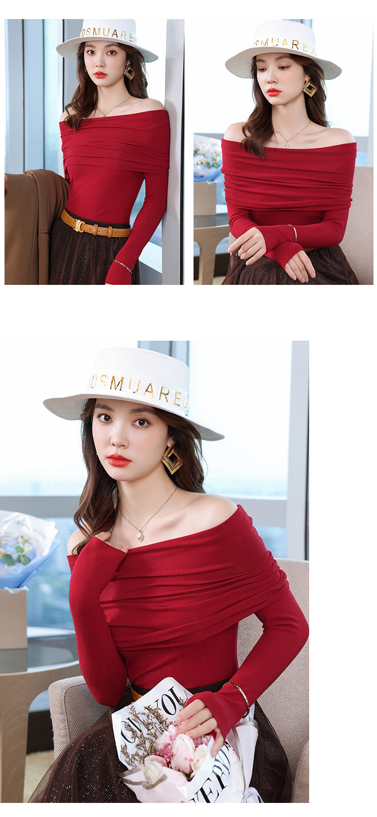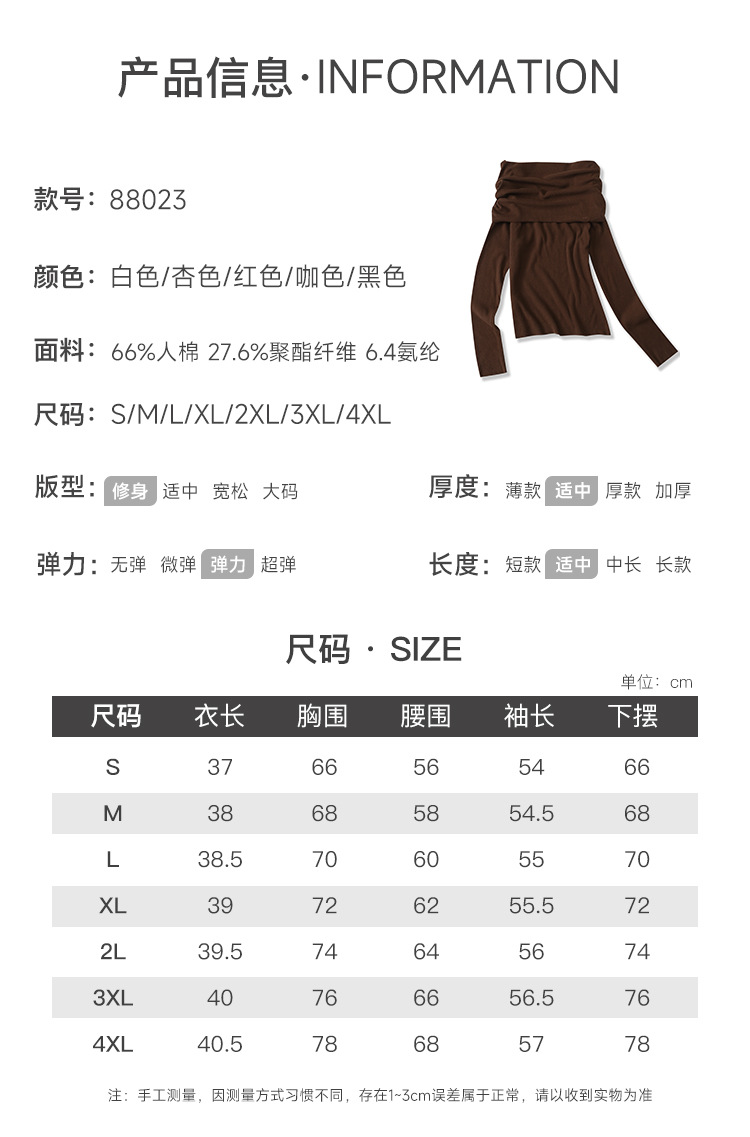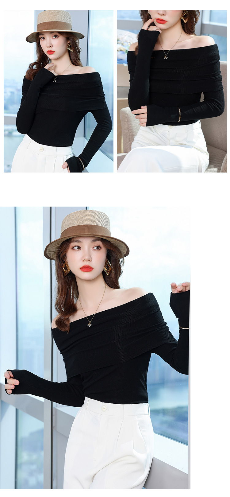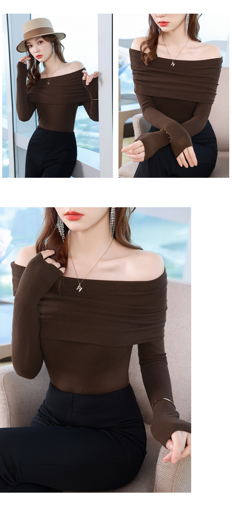 여성의 봄과 가을 슬림핏 꽉 조이는 짧은 긴팔베이스 니트 탑, 오프 숄더 칼라스토어 가기