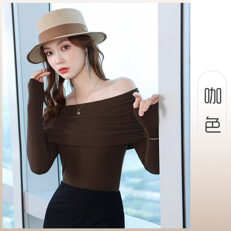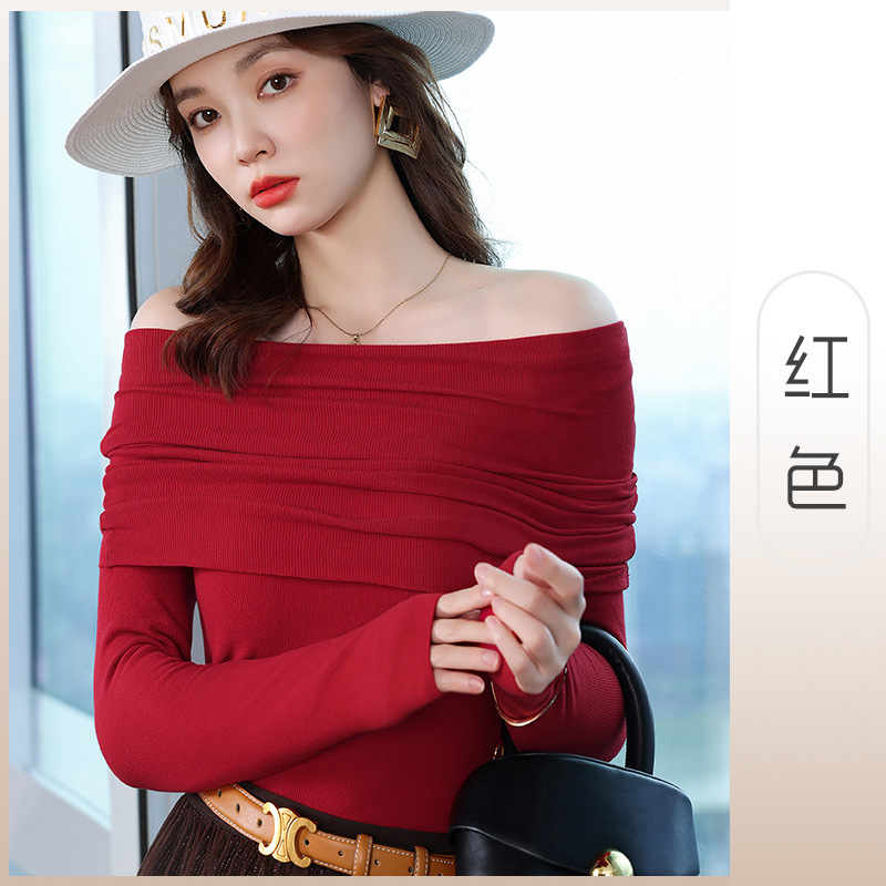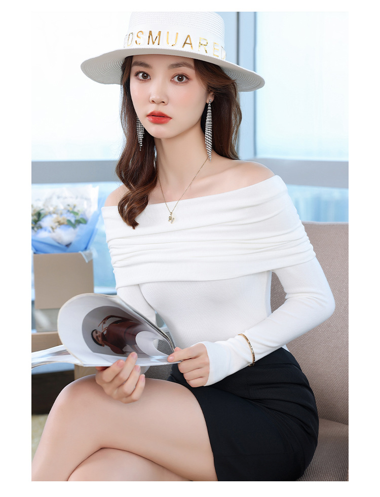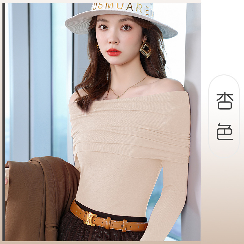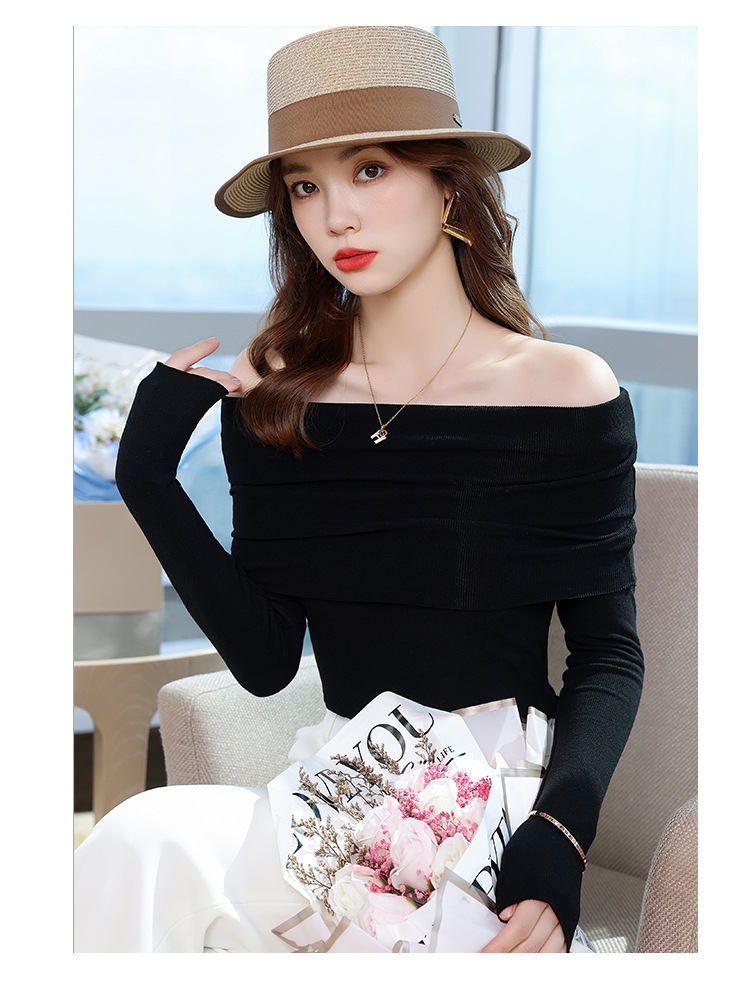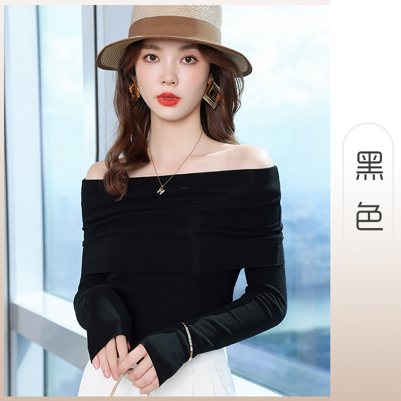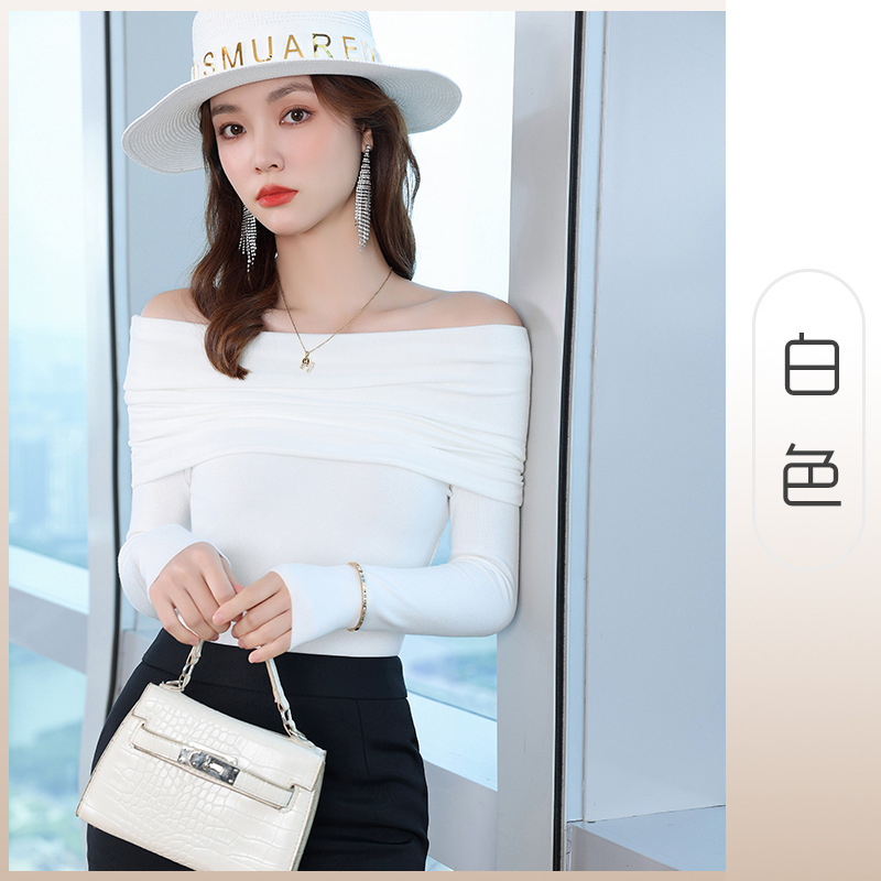 여성의 봄과 가을 슬림핏 꽉 조이는 짧은 긴팔베이스 니트 탑, 오프 숄더 칼라