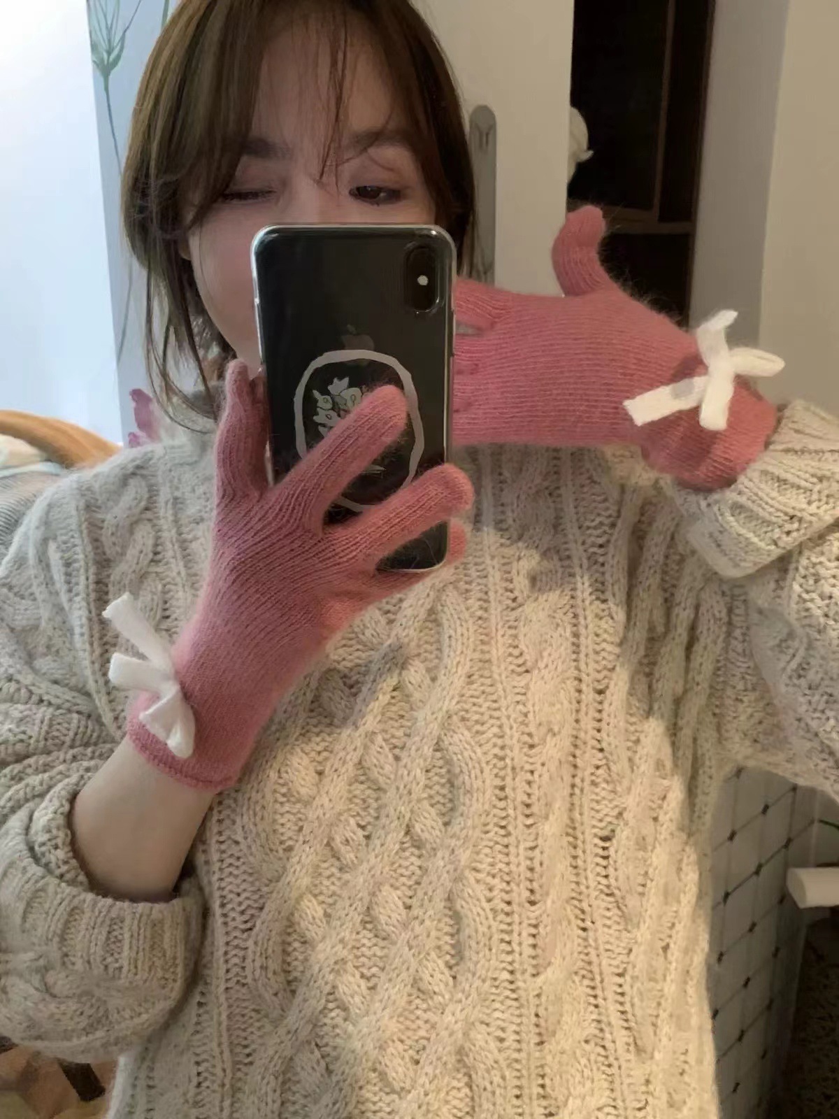 소녀의 심장 니트 활 장갑 여학생 가을 겨울 타고 두꺼운 따뜻한 한국 전시관 손가락 긴 장갑